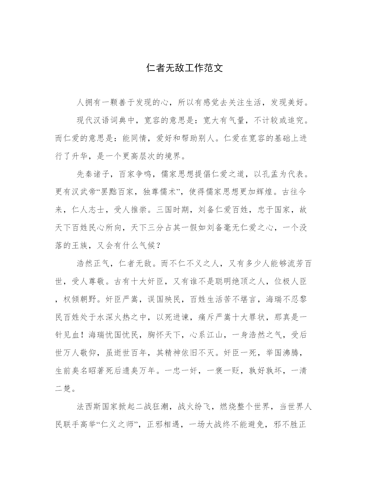 仁者无敌工作范文人拥有一颗善于发现的心,所以有感觉去关注生活,发现美好。现代汉语词典中,宽容的意思是:宽大有气量,不计较或追究。而仁爱的意思是:能同情,爱好和帮助别人。仁爱在宽容的基础上进行了升华,是一个更高层次的境界。先秦诸子,百家争鸣,儒家思想提倡仁爱之道,以孔孟为代表。更有汉武帝“罢黜百家,独尊儒术”,使得儒家思想更加辉煌。古往今来,仁人志士,受人推崇。三国时期,刘备仁爱百姓,忠于国家,故天下百姓民心所向,天下三分占其一假如刘备毫无仁爱之心,一个没落的王族,又会有什么气候?浩然正气,仁者无敌。而不仁不义之人,又有多少人能够流芳百世,受人尊敬。古有十大奸臣,又有谁不是聪明绝顶之人,位极人臣,权倾朝野。奸臣严嵩,误国殃民,百姓生活苦不堪言,海瑞不忍黎民百姓处于水深火热之中,以死进谏,痛斥严嵩十大罪状,那真是一针见血!海瑞忧国忧民,胸怀天下,心系江山,一身浩然之气,受后世万人敬仰,虽逝世百年,其精神依旧不灭。奸臣一死,举国沸腾,生前臭名昭著死后遗臭万年。一忠一奸,一褒一贬,孰好孰坏,一清二楚。法西斯国家掀起二战狂潮,战火纷飞,燃烧整个世界,当世界人民联手高举“仁义之师”,正邪相遇,一场大战终不能避免,邪不胜正。各国从挨打到防守,直至主动进攻,每一个阶段都是奇迹,仁义之师终取得胜利。故有我心之音:仁者无敌!