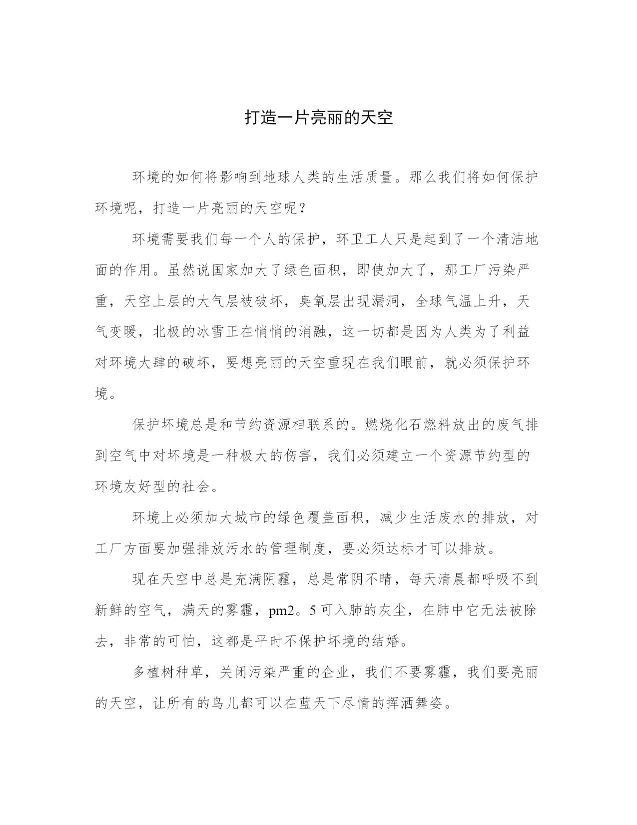 打造一片亮丽的天空环境的如何将影响到地球人类的生活质量。那么我们将如何保护环境呢,打造一片亮丽的天空呢?环境需要我们每一个人的保护,环卫工人只是起到了一个清洁地面的作用。虽然说国家加大了绿色面积,即使加大了,那工厂污染严重,天空上层的大气层被破坏,臭氧层出现漏洞,全球气温上升,天气变暖,北极的冰雪正在悄悄的消融,这一切都是因为人类为了利益对环境大肆的破坏,要想亮丽的天空重现在我们眼前,就必须保护环境。保护坏境总是和节约资源相联系的。燃烧化石燃料放出的废气排到空气中对坏境是一种极大的伤害,我们必须建立一个资源节约型的环境友好型的社会。环境上必须加大城市的绿色覆盖面积,减少生活废水的排放,对工厂方面要加强排放污水的管理制度,要必须达标才可以排放。现在天空中总是充满阴霾,总是常阴不晴,每天清晨都呼吸不到新鲜的空气,满天的雾霾,pm2。5可入肺的灰尘,在肺中它无法被除去,非常的可怕,这都是平时不保护坏境的结婚。多植树种草,关闭污染严重的企业,我们不要雾霾,我们要亮丽的天空,让所有的鸟儿都可以在蓝天下尽情的挥洒舞姿。