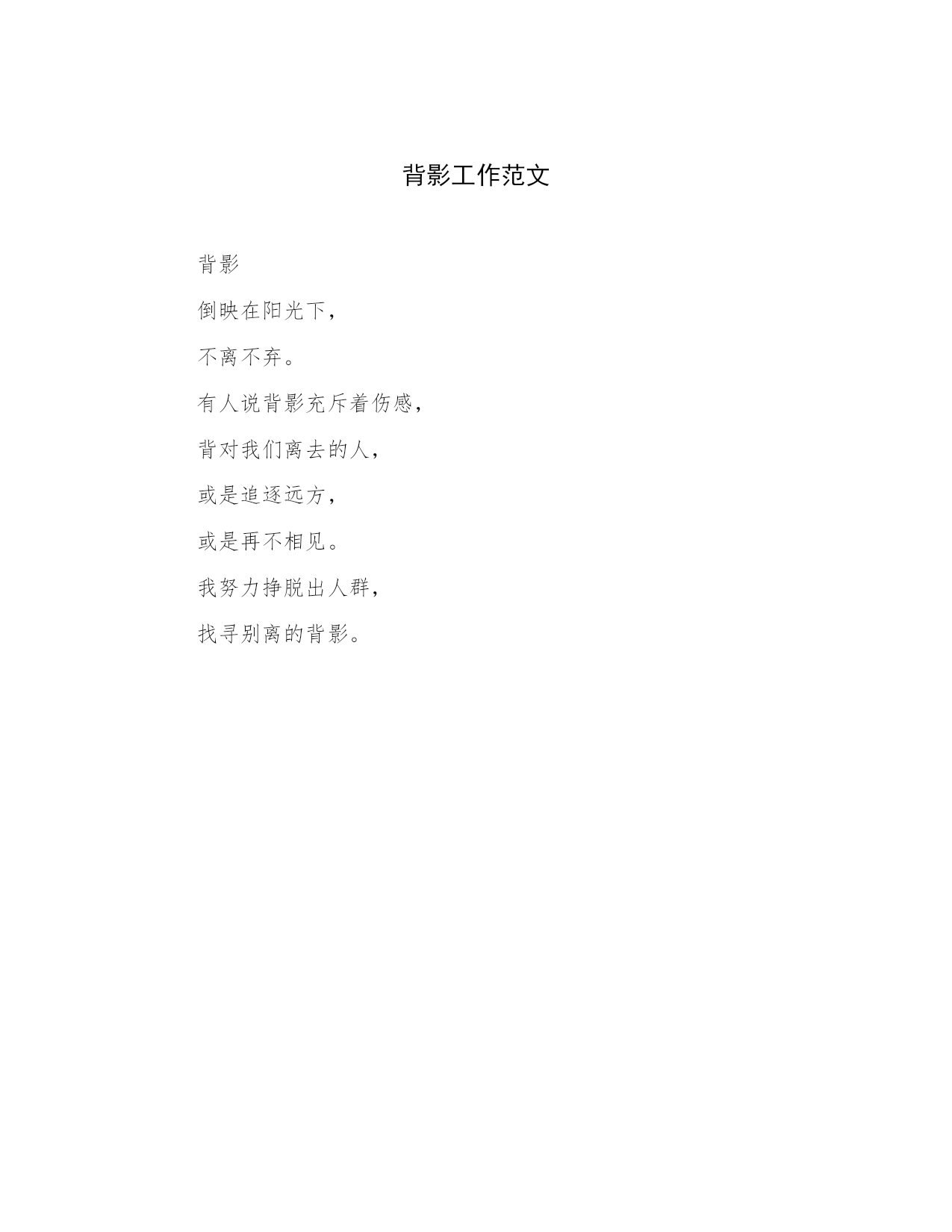 背影工作范文背影倒映在阳光下,不离不弃。有人说背影充斥着伤感,背对我们离去的人,或是追逐远方,或是再不相见。我努力挣脱出人群,找寻别离的背影。