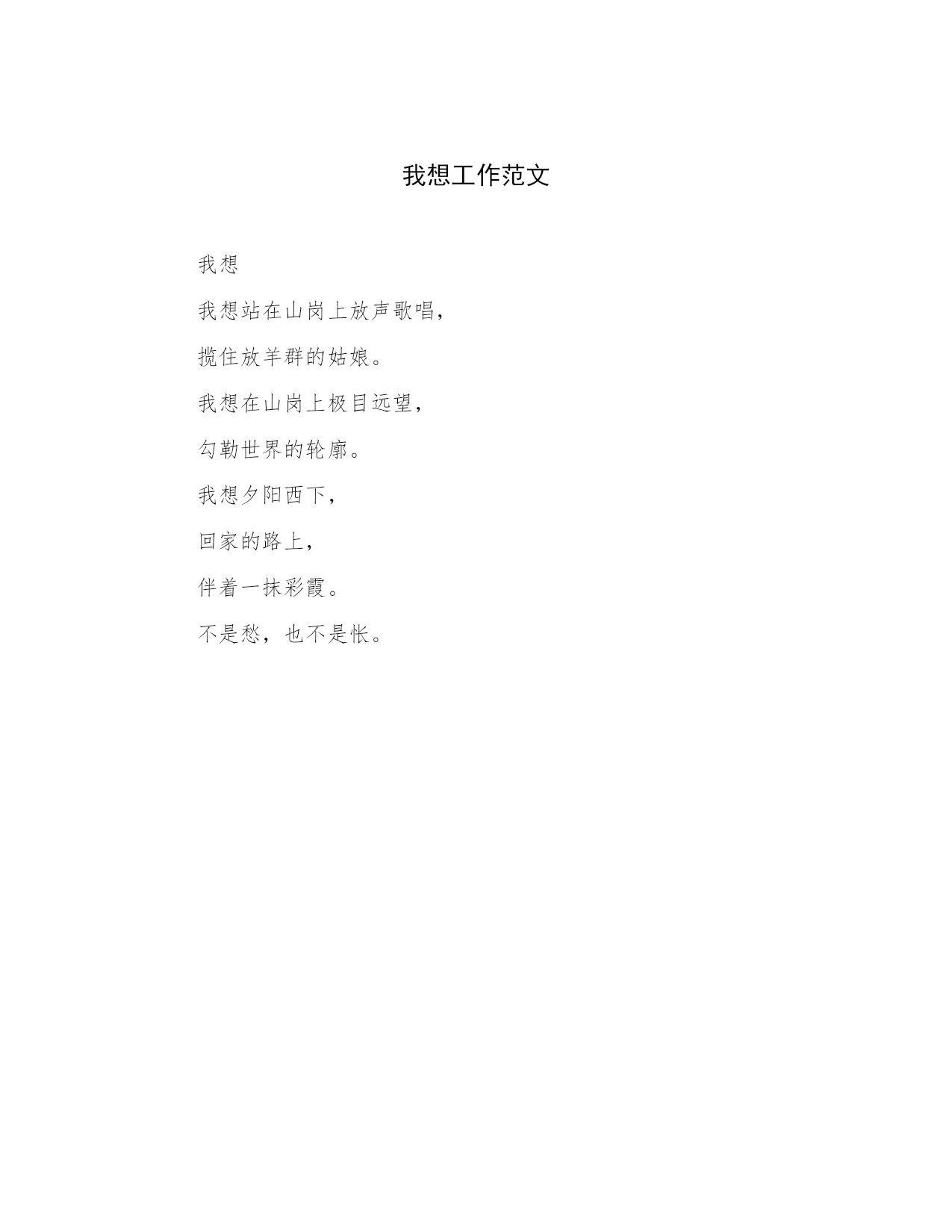 我想工作范文我想我想站在山岗上放声歌唱,揽住放羊群的姑娘。我想在山岗上极目远望,勾勒世界的轮廓。我想夕阳西下,回家的路上,伴着一抹彩霞。不是愁,也不是怅。