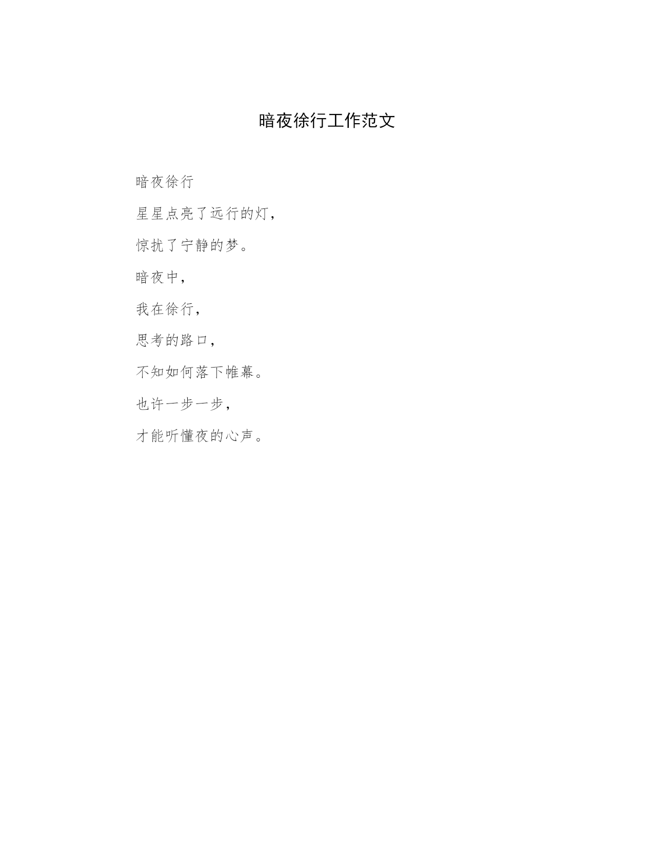暗夜徐行工作范文暗夜徐行星星点亮了远行的灯,惊扰了宁静的梦。暗夜中,我在徐行,思考的路口,不知如何落下帷幕。也许一步一步,才能听懂夜的心声。