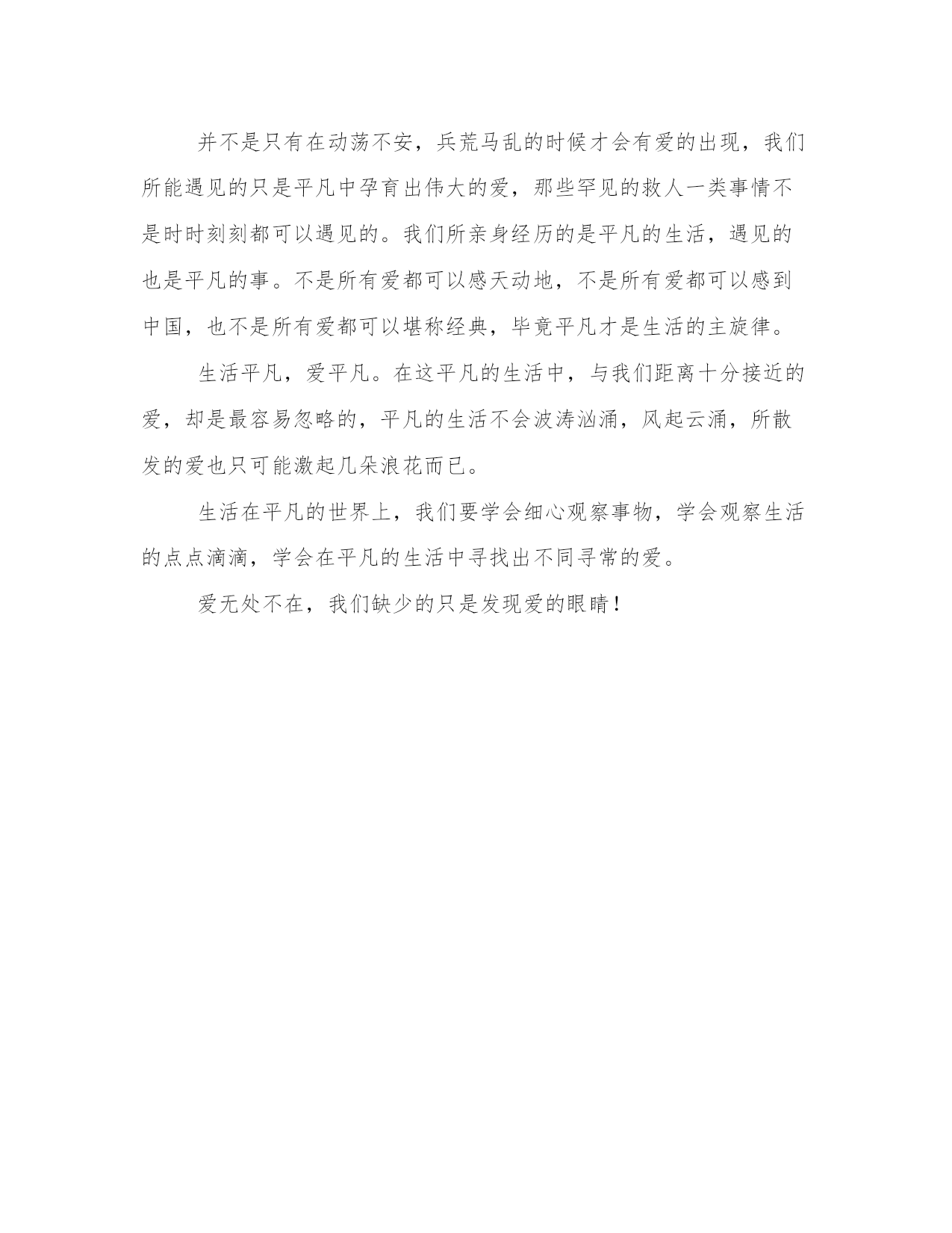 平凡的爱工作范文真正的爱不分大小,不分等级,不论你我。生活中每时每刻都有爱的存在,爱有时感天动地,爱有时润物无声,爱有时难以言状。5。12汶川大地震,撼天动地,这场地震震动了大半个中国,即使现在提起此事,许多人依旧记得当时的情况,这些场景十年难忘,并早已经镌刻在记忆最深处。这场灾难牵动亿万中华人民的心,这场地震也让我们见识许多爱的存在,许多原本看似平凡普通的人,在这紧要关头不顾自己的安危,救助他人,有的人甚至牺牲了自己宝贵的生命……在这场灾难面前,一个个平凡的人都拥有博大的爱,有亲情,有友情,有互帮互助之情,她们的行为感动无数中国人,我们虽然没有亲身经历这场地震,但是这些事情却是早有耳闻。有一部经典的电视剧<丑娘>,讲述的是一个老母亲对自己的亲生儿子,儿媳以怨报德,付出无数心血,吃尽万般苦楚,耗尽所有生命的故事。这是中国母亲对子女的无限爱意,这同样是我们的母亲也会做出的行为。平凡的生活因为爱而不平凡,平凡的人也因为爱而不平凡。人之所以与机器不同,是因为人学会了思考,拥有感情,懂得爱是什么!不会像机器那样不为万物所动,所有都是由系统自动控制,它们的只有程序,无法发现爱,同样无法理解爱的存在。并不是只有在动荡不安,兵荒马乱的时候才会有爱的出现,我们所能遇见的只是平凡中孕育出伟大的爱,那些罕见的救人一类事情不是时时刻刻都可以遇见的。我们所亲身经历的是平凡的生活,遇见的也是平凡的事。不是所有爱都可以感天动地,不是所有爱都可以感到中国,也不是所有爱都可以堪称经典,毕竟平凡才是生活的主旋律。生活平凡,爱平凡。在这平凡的生活中,与我们距离十分接近的爱,却是最容易忽略的,平凡的生活不会波涛汹涌,风起云涌,所散发的爱也只可能激起几朵浪花而已。生活在平凡的世界上,我们要学会细心观察事物,学会观察生活的点点滴滴,学会在平凡的生活中寻找出不同寻常的爱。爱无处不在,我们缺少的只是发现爱的眼睛!