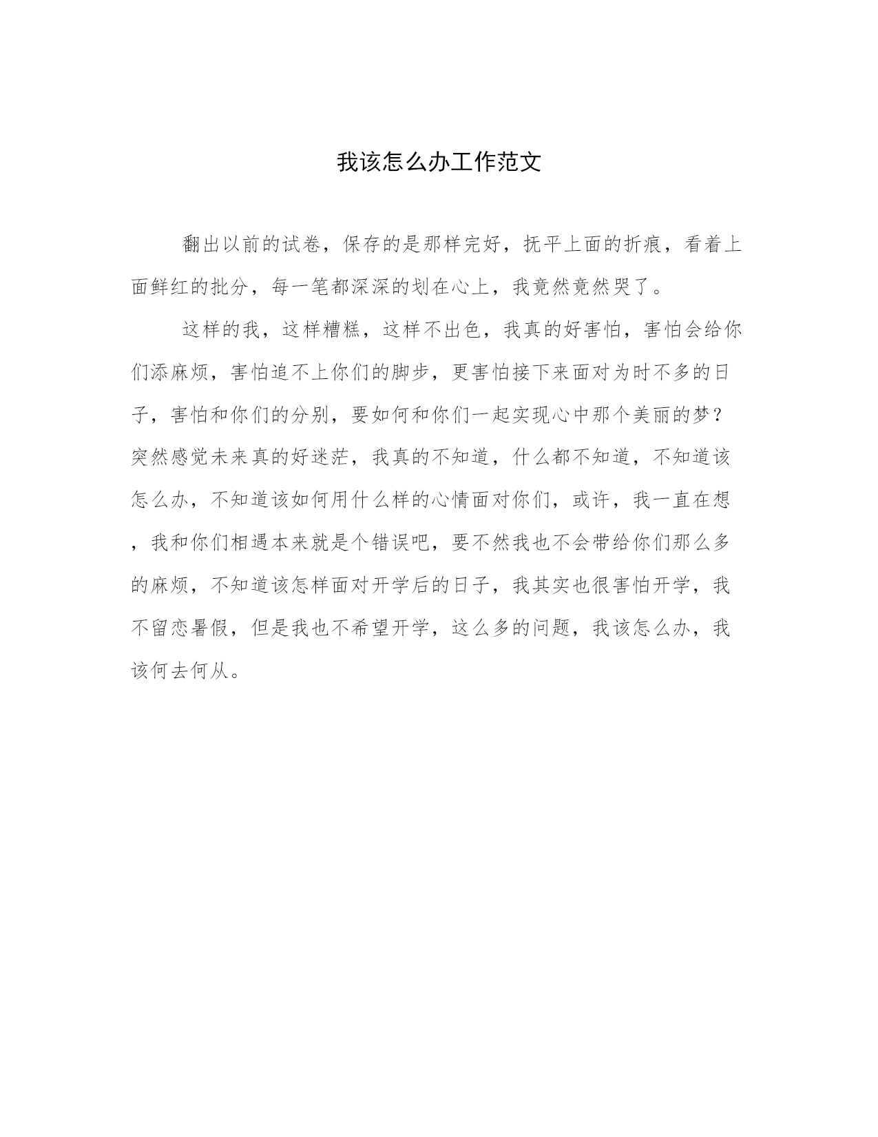 我该怎么办工作范文翻出以前的试卷,保存的是那样完好,抚平上面的折痕,看着上面鲜红的批分,每一笔都深深的划在心上,我竟然竟然哭了。这样的我,这样糟糕,这样不出色,我真的好害怕,害怕会给你们添麻烦,害怕追不上你们的脚步,更害怕接下来面对为时不多的日子,害怕和你们的分别,要如何和你们一起实现心中那个美丽的梦?突然感觉未来真的好迷茫,我真的不知道,什么都不知道,不知道该怎么办,不知道该如何用什么样的心情面对你们,或许,我一直在想,我和你们相遇本来就是个错误吧,要不然我也不会带给你们那么多的麻烦,不知道该怎样面对开学后的日子,我其实也很害怕开学,我不留恋暑假,但是我也不希望开学,这么多的问题,我该怎么办,我该何去何从。