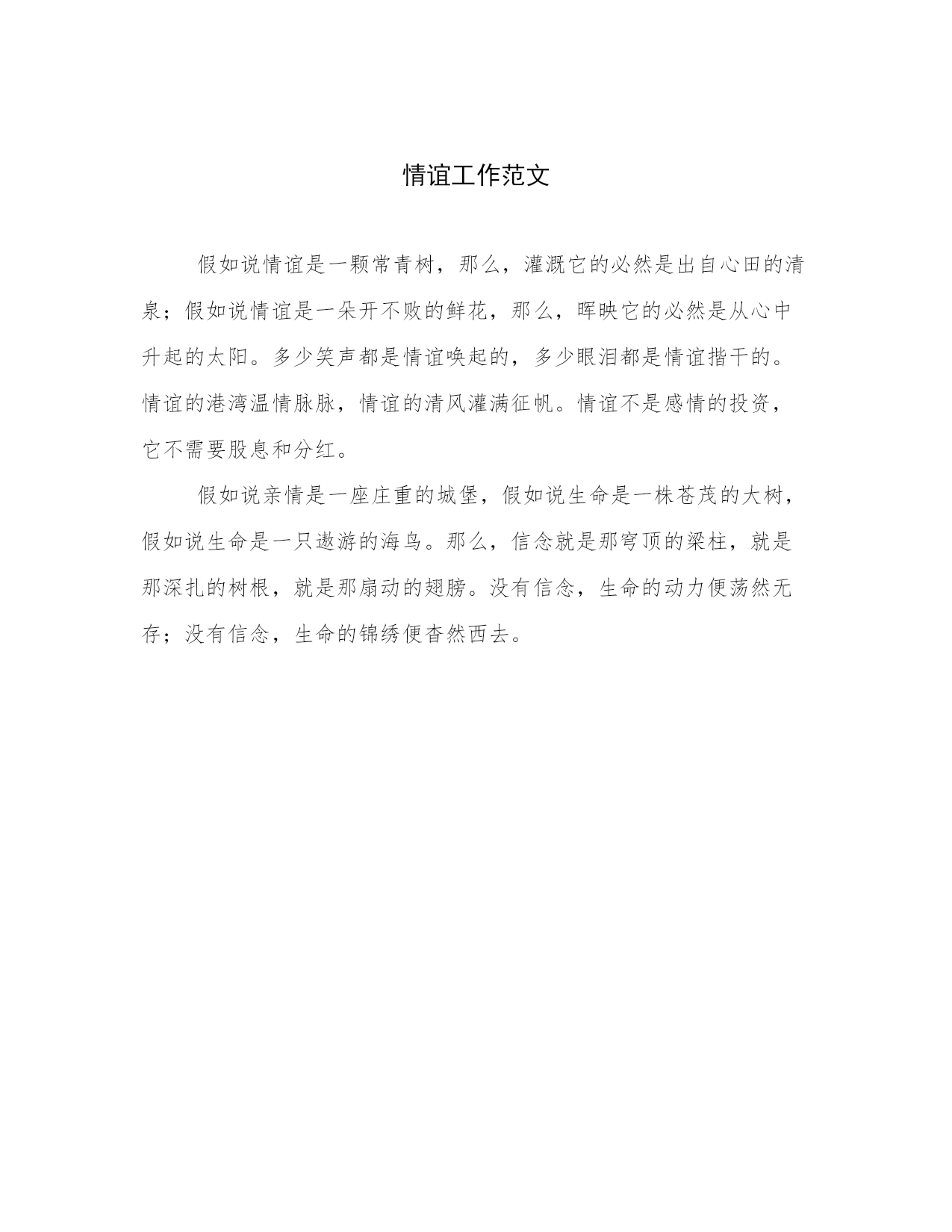 情谊工作范文假如说情谊是一颗常青树,那么,灌溉它的必然是出自心田的清泉;假如说情谊是一朵开不败的鲜花,那么,晖映它的必然是从心中升起的太阳。多少笑声都是情谊唤起的,多少眼泪都是情谊揩干的。情谊的港湾温情脉脉,情谊的清风灌满征帆。情谊不是感情的投资,它不需要股息和分红。假如说亲情是一座庄重的城堡,假如说生命是一株苍茂的大树,假如说生命是一只遨游的海鸟。那么,信念就是那穹顶的梁柱,就是那深扎的树根,就是那扇动的翅膀。没有信念,生命的动力便荡然无存;没有信念,生命的锦绣便杳然西去。
