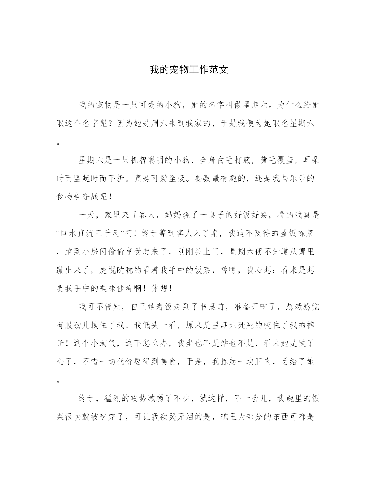 我的宠物工作范文我的宠物是一只可爱的小狗,她的名字叫做星期六。为什么给她取这个名字呢?因为她是周六来到我家的,于是我便为她取名星期六。星期六是一只机智聪明的小狗,全身白毛打底,黄毛覆盖,耳朵时而竖起时而下折。真是可爱至极。要数最有趣的,还是我与乐乐的食物争夺战呢!一天,家里来了客人,妈妈烧了一桌子的好饭好菜,看的我真是“口水直流三千尺”啊!终于等到客人入了桌,我迫不及待的盛饭拣菜,跑到小房间偷偷享受起来了,刚刚关上门,星期六便不知道从哪里蹦出来了,虎视眈眈的看着我手中的饭菜,哼哼,我心想:看来是想要我手中的美味佳肴啊!休想!我可不管她,自己端着饭走到了书桌前,准备开吃了,忽然感觉有股劲儿拽住了我。我低头一看,原来是星期六死死的咬住了我的裤子!这个小淘气,这下怎么办,我坐也不是站也不是,看来她是铁了心了,不惜一切代价要得到美食,于是,我拣起一块肥肉,丢给了她。终于,猛烈的攻势减弱了不少,就这样,不一会儿,我碗里的饭菜很快就被吃完了,可让我欲哭无泪的是,碗里大部分的东西可都是星期六吃掉的。“妈妈,还有饭么?”“还要吃啊?饭可没了,菜也只有一点了哟~”“什么!唉——”我叹了一口气,便悻悻的回房了这就是让我可气又可爱的小狗——星期六。你喜欢么?