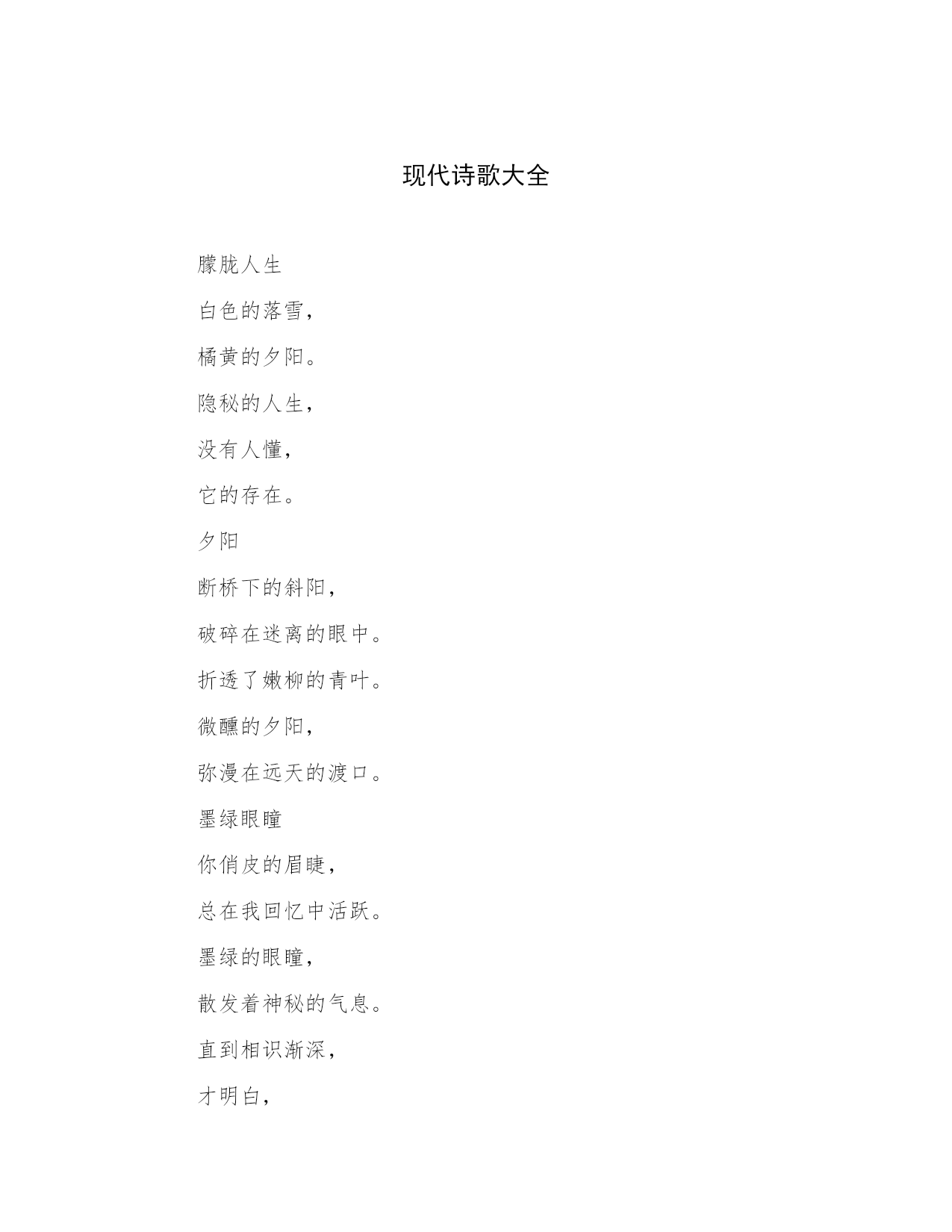 现代诗歌大全朦胧人生白色的落雪,橘黄的夕阳。隐秘的人生,没有人懂,它的存在。夕阳断桥下的斜阳,破碎在迷离的眼中。折透了嫩柳的青叶。微醺的夕阳,弥漫在远天的渡口。墨绿眼瞳你俏皮的眉睫,总在我回忆中活跃。墨绿的眼瞳,散发着神秘的气息。直到相识渐深,才明白,墨绿的眼瞳,渗透着孤独的忧伤。