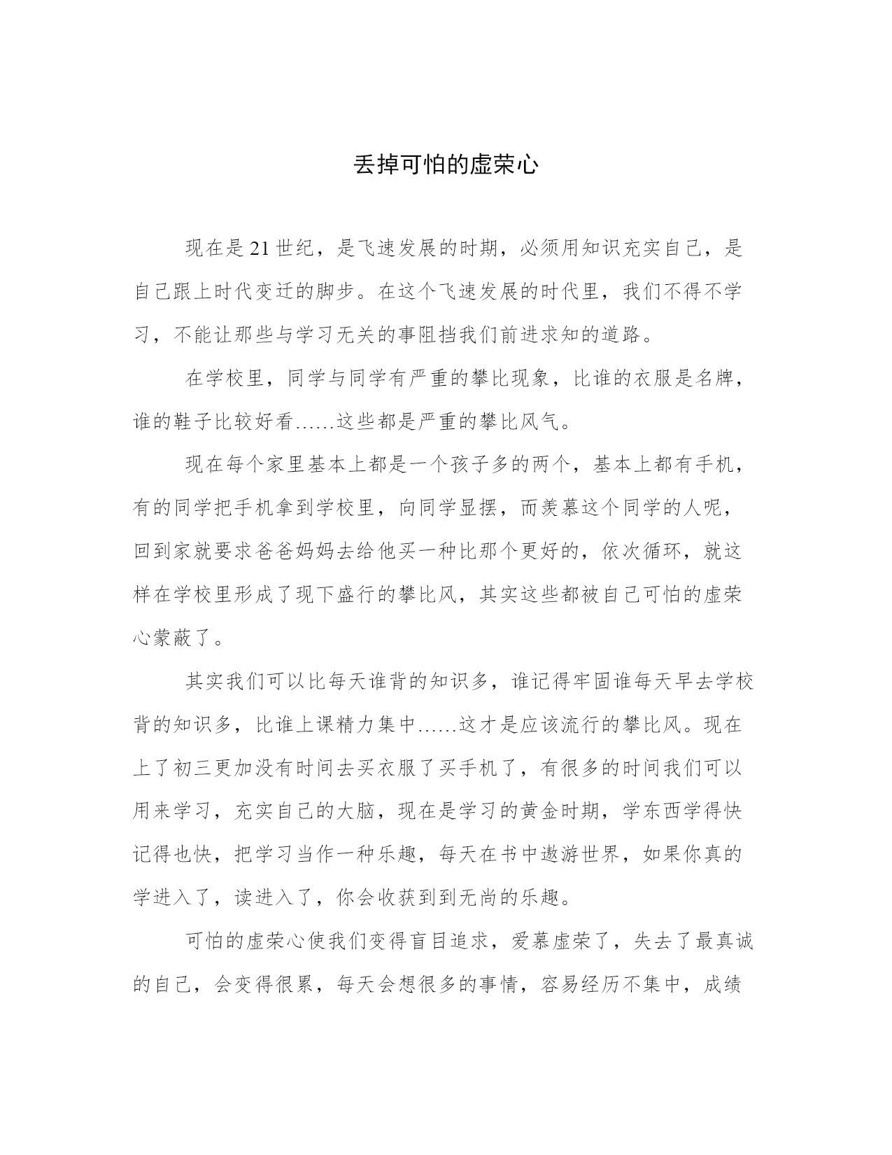 丢掉可怕的虚荣心现在是21世纪,是飞速发展的时期,必须用知识充实自己,是自己跟上时代变迁的脚步。在这个飞速发展的时代里,我们不得不学习,不能让那些与学习无关的事阻挡我们前进求知的道路。在学校里,同学与同学有严重的攀比现象,比谁的衣服是名牌,谁的鞋子比较好看……这些都是严重的攀比风气。现在每个家里基本上都是一个孩子多的两个,基本上都有手机,有的同学把手机拿到学校里,向同学显摆,而羡慕这个同学的人呢,回到家就要求爸爸妈妈去给他买一种比那个更好的,依次循环,就这样在学校里形成了现下盛行的攀比风,其实这些都被自己可怕的虚荣心蒙蔽了。其实我们可以比每天谁背的知识多,谁记得牢固谁每天早去学校背的知识多,比谁上课精力集中……这才是应该流行的攀比风。现在上了初三更加没有时间去买衣服了买手机了,有很多的时间我们可以用来学习,充实自己的大脑,现在是学习的黄金时期,学东西学得快记得也快,把学习当作一种乐趣,每天在书中遨游世界,如果你真的学进入了,读进入了,你会收获到到无尚的乐趣。可怕的虚荣心使我们变得盲目追求,爱慕虚荣了,失去了最真诚的自己,会变得很累,每天会想很多的事情,容易经历不集中,成绩会下降,会变得很不自在,使它变成自己的累赘,自己也会越来越爱慕虚荣。可是如果丢掉虚荣心,我们会变得更加灵活,学起来也带劲,整个人都会变得特轻松,学习成绩会直线上升,做到在学习中攀比,但不要嫉妒别人,要正确把握自己,利用好能使自己蓬勃的时期,让自己跟上时代变迁的脚步,告别虚荣心,用知识装扮自己。