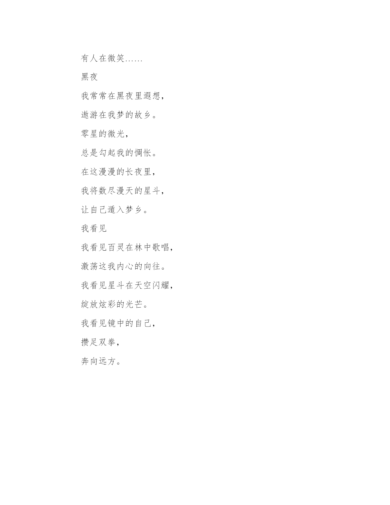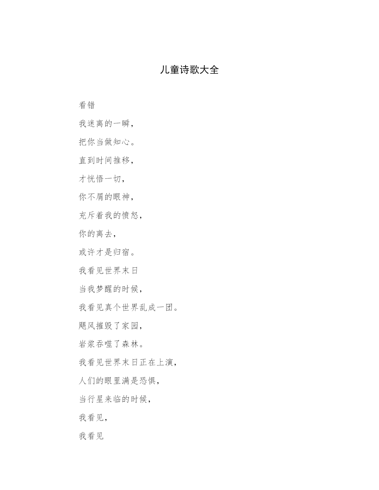 儿童诗歌大全看错我迷离的一瞬,把你当做知心。直到时间推移,才恍悟一切,你不屑的眼神,充斥着我的愤怒,你的离去,或许才是归宿。我看见世界末日当我梦醒的时候,我看见真个世界乱成一团。飓风摧毁了家园,岩浆吞噬了森林。我看见世界末日正在上演,人们的眼里满是恐惧,当行星来临的时候,我看见,我看见有人在微笑……黑夜我常常在黑夜里遐想,遨游在我梦的故乡。零星的微光,总是勾起我的惆怅。在这漫漫的长夜里,我将数尽漫天的星斗,让自己遁入梦乡。我看见我看见百灵在林中歌唱,激荡这我内心的向往。我看见星斗在天空闪耀,绽放炫彩的光芒。我看见镜中的自己,攒足双拳,奔向远方。