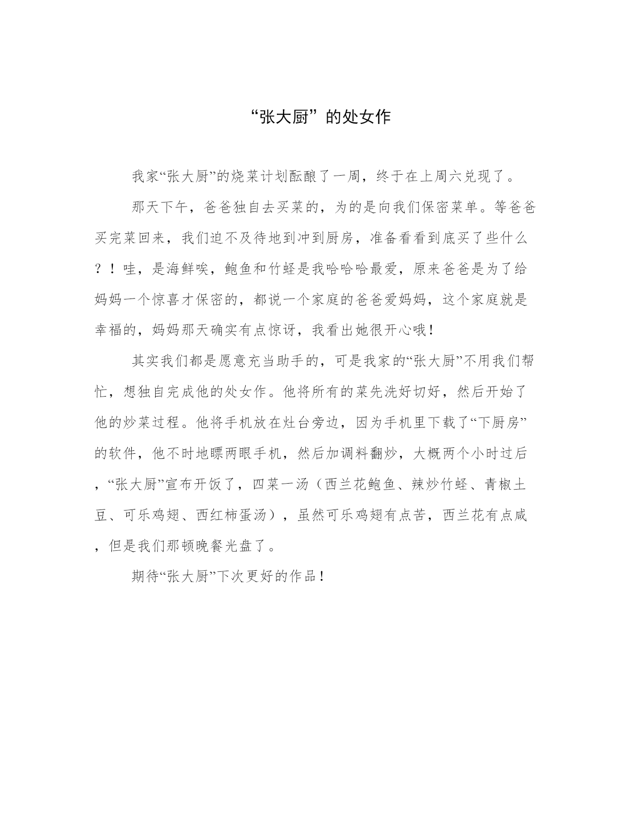 “张大厨”的处女作我家“张大厨”的烧菜计划酝酿了一周,终于在上周六兑现了。那天下午,爸爸独自去买菜的,为的是向我们保密菜单。等爸爸买完菜回来,我们迫不及待地到冲到厨房,准备看看到底买了些什么?!哇,是海鲜唉,鲍鱼和竹蛏是我哈哈哈最爱,原来爸爸是为了给妈妈一个惊喜才保密的,都说一个家庭的爸爸爱妈妈,这个家庭就是幸福的,妈妈那天确实有点惊讶,我看出她很开心哦!其实我们都是愿意充当助手的,可是我家的“张大厨”不用我们帮忙,想独自完成他的处女作。他将所有的菜先洗好切好,然后开始了他的炒菜过程。他将手机放在灶台旁边,因为手机里下载了“下厨房”的软件,他不时地瞟两眼手机,然后加调料翻炒,大概两个小时过后,“张大厨”宣布开饭了,四菜一汤(西兰花鲍鱼、辣炒竹蛏、青椒土豆、可乐鸡翅、西红柿蛋汤),虽然可乐鸡翅有点苦,西兰花有点咸,但是我们那顿晚餐光盘了。期待“张大厨”下次更好的作品!