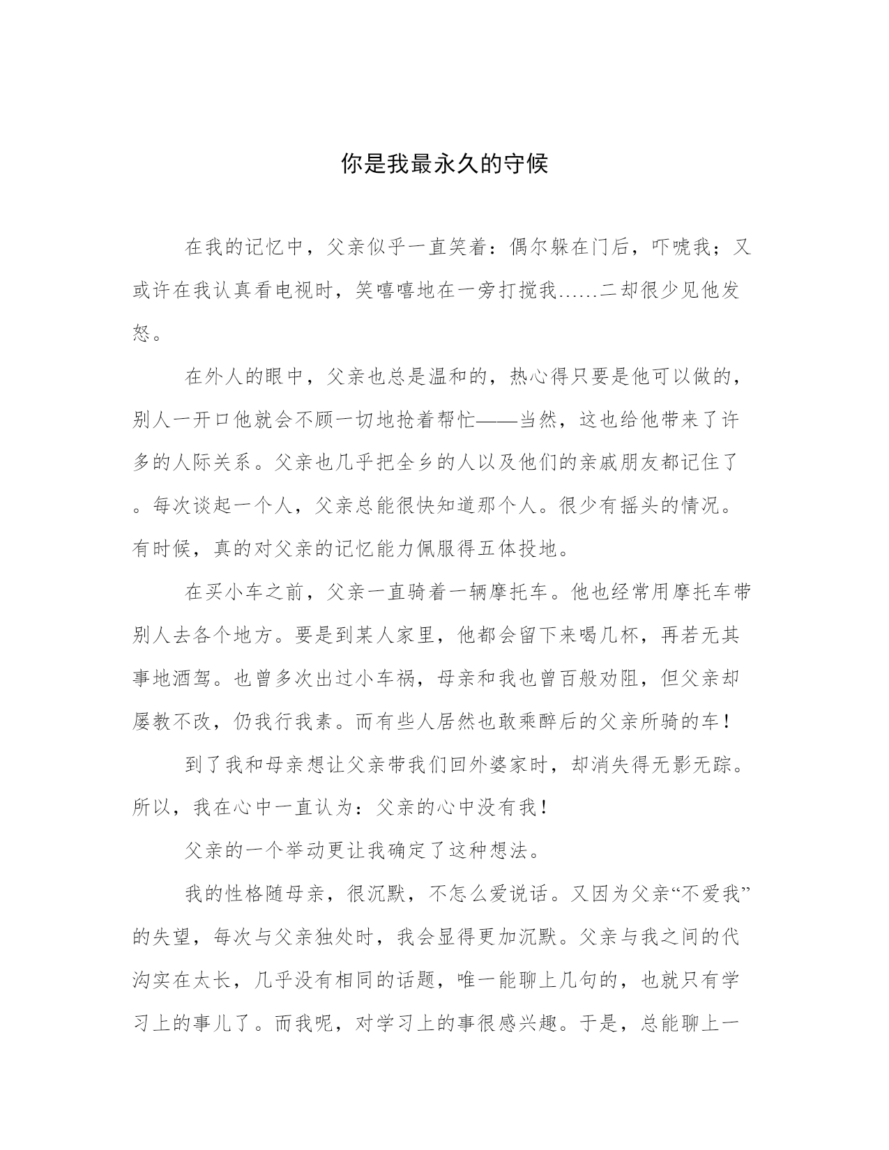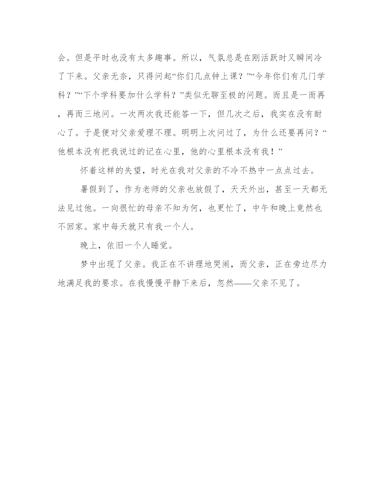 你是我最永久的守候在我的记忆中,父亲似乎一直笑着:偶尔躲在门后,吓唬我;又或许在我认真看电视时,笑嘻嘻地在一旁打搅我……二却很少见他发怒。在外人的眼中,父亲也总是温和的,热心得只要是他可以做的,别人一开口他就会不顾一切地抢着帮忙——当然,这也给他带来了许多的人际关系。父亲也几乎把全乡的人以及他们的亲戚朋友都记住了。每次谈起一个人,父亲总能很快知道那个人。很少有摇头的情况。有时候,真的对父亲的记忆能力佩服得五体投地。在买小车之前,父亲一直骑着一辆摩托车。他也经常用摩托车带别人去各个地方。要是到某人家里,他都会留下来喝几杯,再若无其事地酒驾。也曾多次出过小车祸,母亲和我也曾百般劝阻,但父亲却屡教不改,仍我行我素。而有些人居然也敢乘醉后的父亲所骑的车!到了我和母亲想让父亲带我们回外婆家时,却消失得无影无踪。所以,我在心中一直认为:父亲的心中没有我!父亲的一个举动更让我确定了这种想法。我的性格随母亲,很沉默,不怎么爱说话。又因为父亲“不爱我”的失望,每次与父亲独处时,我会显得更加沉默。父亲与我之间的代沟实在太长,几乎没有相同的话题,唯一能聊上几句的,也就只有学习上的事儿了。而我呢,对学习上的事很感兴趣。于是,总能聊上一会。但是平时也没有太多趣事。所以,气氛总是在刚活跃时又瞬间冷了下来。父亲无奈,只得问起“你们几点钟上课?”“今年你们有几门学科?”“下个学科要加什么学科?”类似无聊至极的问题。而且是一而再,再而三地问。一次两次我还能答一下,但几次之后,我实在没有耐心了。于是便对父亲爱理不理。明明上次问过了,为什么还要再问?“他根本没有把我说过的记在心里,他的心里根本没有我!”怀着这样的失望,时光在我对父亲的不冷不热中一点点过去。暑假到了,作为老师的父亲也放假了,天天外出,甚至一天都无法见过他。一向很忙的母亲不知为何,也更忙了,中午和晚上竟然也不回家。家中每天就只有我一个人。晚上,依旧一个人睡觉。梦中出现了父亲。我正在不讲理地哭闹,而父亲,正在旁边尽力地满足我的要求。在我慢慢平静下来后,忽然——父亲不见了。