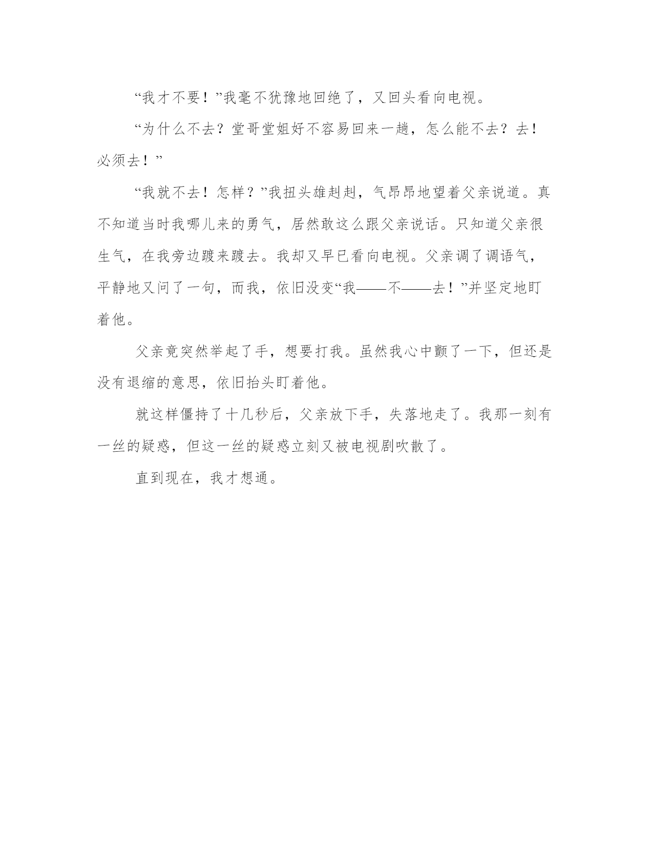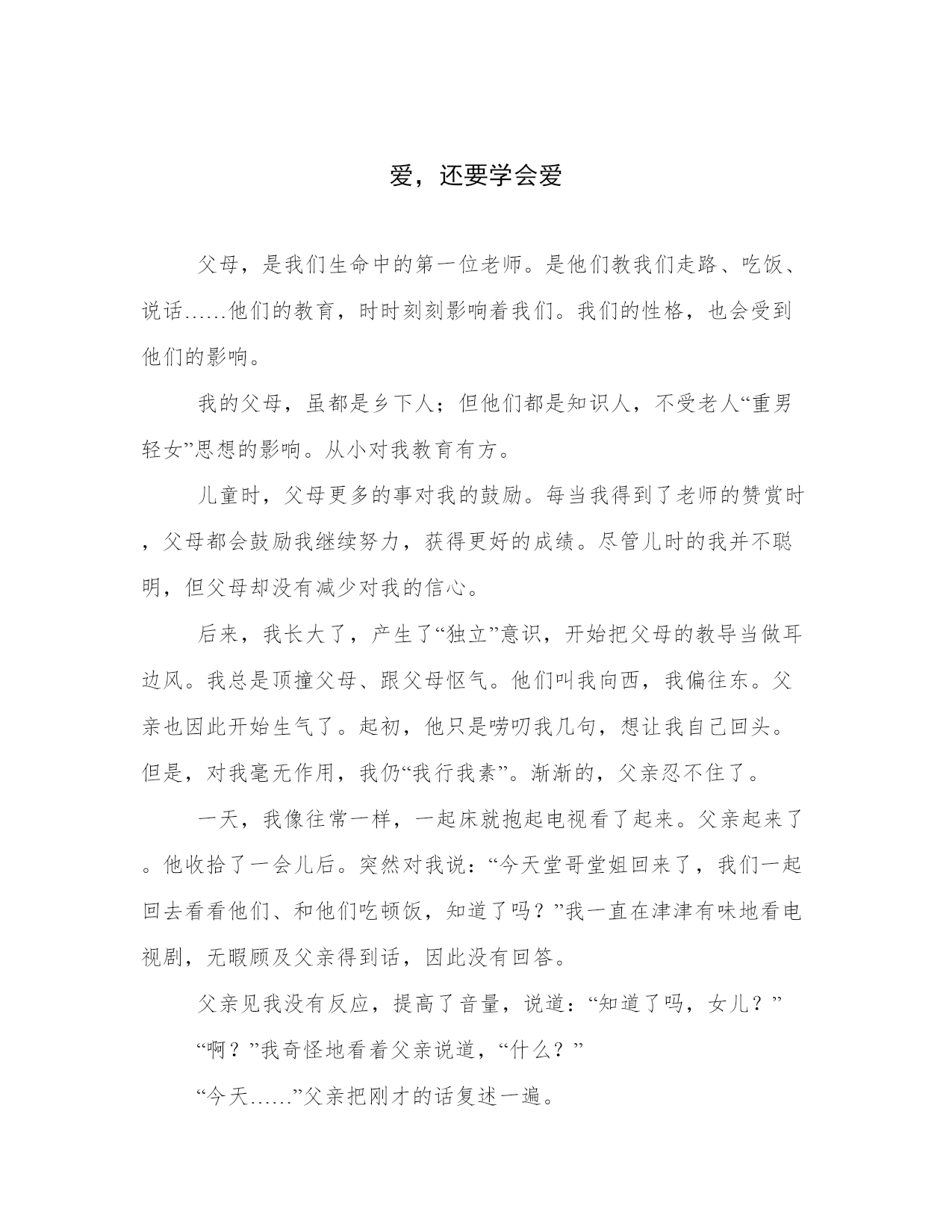 爱,还要学会爱父母,是我们生命中的第一位老师。是他们教我们走路、吃饭、说话……他们的教育,时时刻刻影响着我们。我们的性格,也会受到他们的影响。我的父母,虽都是乡下人;但他们都是知识人,不受老人“重男轻女”思想的影响。从小对我教育有方。儿童时,父母更多的事对我的鼓励。每当我得到了老师的赞赏时,父母都会鼓励我继续努力,获得更好的成绩。尽管儿时的我并不聪明,但父母却没有减少对我的信心。后来,我长大了,产生了“独立”意识,开始把父母的教导当做耳边风。我总是顶撞父母、跟父母怄气。他们叫我向西,我偏往东。父亲也因此开始生气了。起初,他只是唠叨我几句,想让我自己回头。但是,对我毫无作用,我仍“我行我素”。渐渐的,父亲忍不住了。一天,我像往常一样,一起床就抱起电视看了起来。父亲起来了。他收拾了一会儿后。突然对我说:“今天堂哥堂姐回来了,我们一起回去看看他们、和他们吃顿饭,知道了吗?”我一直在津津有味地看电视剧,无暇顾及父亲得到话,因此没有回答。父亲见我没有反应,提高了音量,说道:“知道了吗,女儿?”“啊?”我奇怪地看着父亲说道,“什么?”“今天……”父亲把刚才的话复述一遍。“我才不要!”我毫不犹豫地回绝了,又回头看向电视。“为什么不去?堂哥堂姐好不容易回来一趟,怎么能不去?去!必须去!”“我就不去!怎样?”我扭头雄赳赳,气昂昂地望着父亲说道。真不知道当时我哪儿来的勇气,居然敢这么跟父亲说话。只知道父亲很生气,在我旁边踱来踱去。我却又早已看向电视。父亲调了调语气,平静地又问了一句,而我,依旧没变“我——不——去!”并坚定地盯着他。父亲竟突然举起了手,想要打我。虽然我心中颤了一下,但还是没有退缩的意思,依旧抬头盯着他。就这样僵持了十几秒后,父亲放下手,失落地走了。我那一刻有一丝的疑惑,但这一丝的疑惑立刻又被电视剧吹散了。直到现在,我才想通。