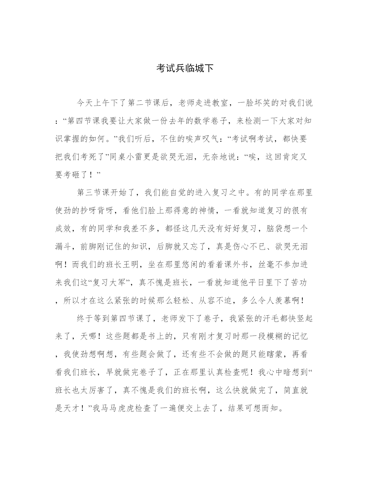 考试兵临城下今天上午下了第二节课后,老师走进教室,一脸坏笑的对我们说:“第四节课我要让大家做一份去年的数学卷子,来检测一下大家对知识掌握的如何。”我们听后,不住的唉声叹气:“考试啊考试,都快要把我们考死了”同桌小雷更是欲哭无泪,无奈地说:“唉,这回肯定又要考砸了!”第三节课开始了,我们能自觉的进入复习之中。有的同学在那里使劲的抄呀背呀,看他们脸上那得意的神情,一看就知道复习的很有成效,有的同学和我差不多,都怪这几天没有好好复习,脑袋想一个漏斗,前脚刚记住的知识,后脚就又忘了,真是伤心不已、欲哭无泪啊!而我们的班长王明,坐在那里悠闲的看着课外书,丝毫不参加进来我们这“复习大军”,真不愧是班长,一看就知道他平日里下了苦功,所以才在这么紧张的时候那么轻松、从容不迫,多么令人羡慕啊!终于等到第四节课了,老师发下了卷子,我紧张的汗毛都快竖起来了,天哪!这些题都是书上的,只有刚才复习时那一段模糊的记忆,我使劲想啊想,有些题会做了,还有些不会做的题只能瞎蒙,再看看我们班长,早就做完卷子了,正在那里认真检查呢!我心中暗想到“班长也太厉害了,真不愧是我们的班长啊,这么快就做完了,简直就是天才!”我马马虎虎检查了一遍便交上去了,结果可想而知。细细想来,这完全都是因为我平时不努力造成的,如果我经常温习课本上的知识,考试时不就像班长一样轻而易举了吗?