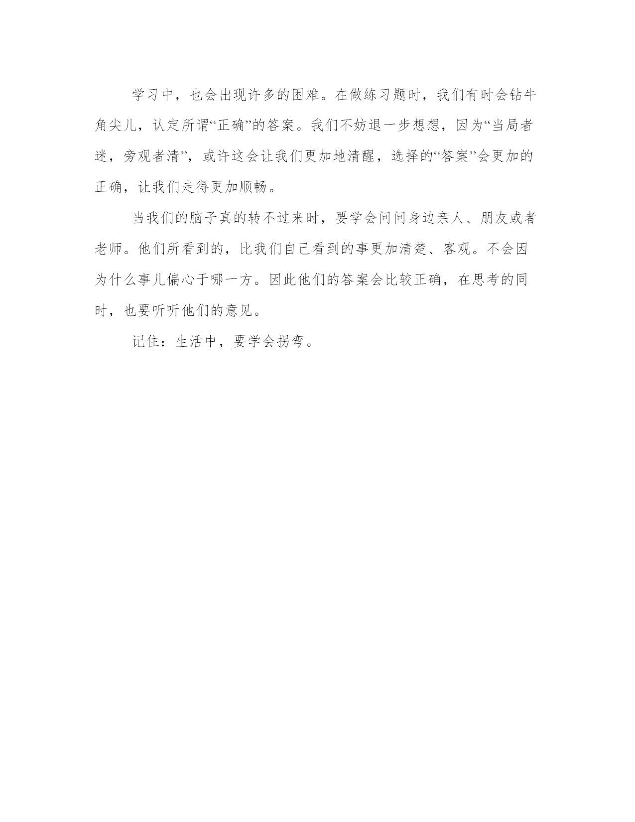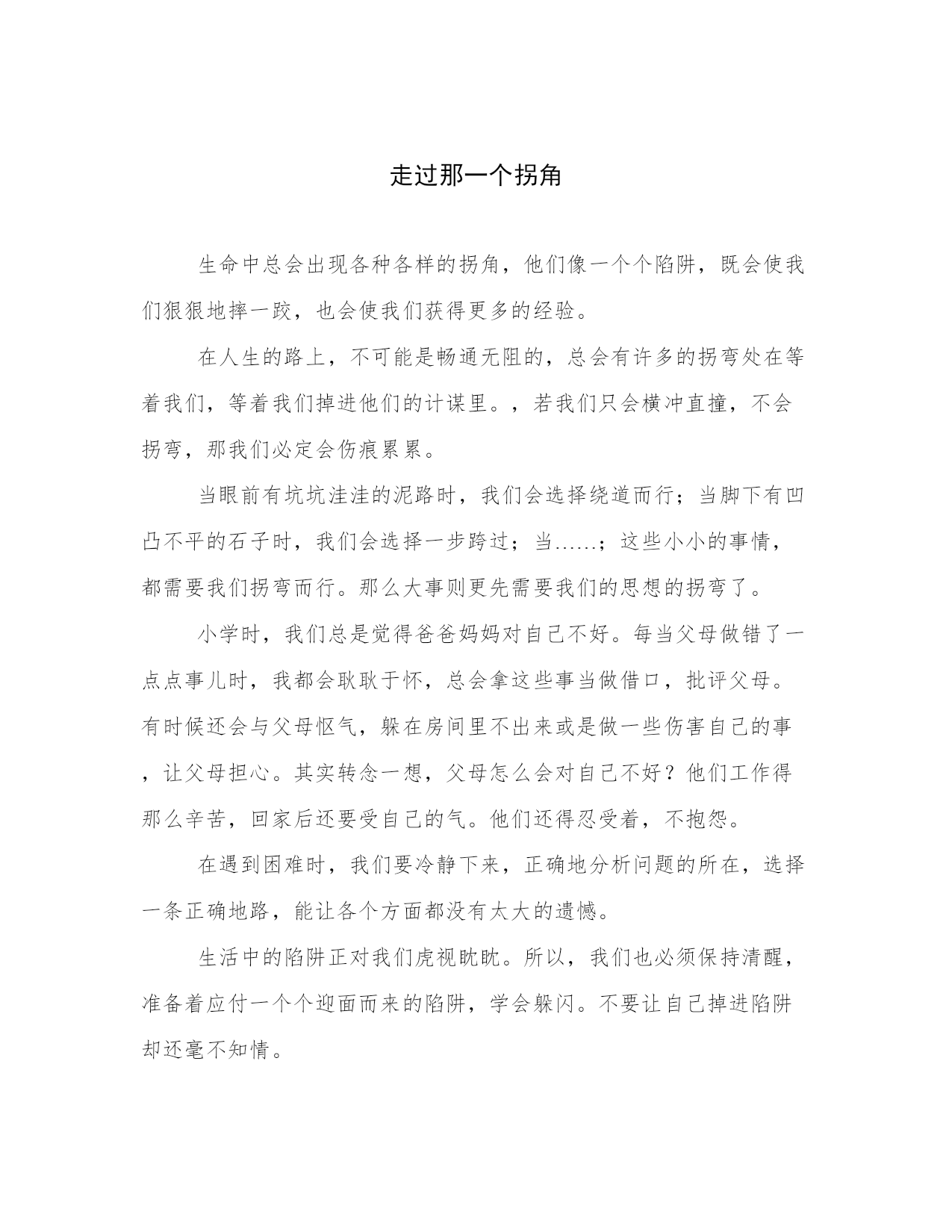 走过那一个拐角生命中总会出现各种各样的拐角,他们像一个个陷阱,既会使我们狠狠地摔一跤,也会使我们获得更多的经验。在人生的路上,不可能是畅通无阻的,总会有许多的拐弯处在等着我们,等着我们掉进他们的计谋里。,若我们只会横冲直撞,不会拐弯,那我们必定会伤痕累累。当眼前有坑坑洼洼的泥路时,我们会选择绕道而行;当脚下有凹凸不平的石子时,我们会选择一步跨过;当……;这些小小的事情,都需要我们拐弯而行。那么大事则更先需要我们的思想的拐弯了。小学时,我们总是觉得爸爸妈妈对自己不好。每当父母做错了一点点事儿时,我都会耿耿于怀,总会拿这些事当做借口,批评父母。有时候还会与父母怄气,躲在房间里不出来或是做一些伤害自己的事,让父母担心。其实转念一想,父母怎么会对自己不好?他们工作得那么辛苦,回家后还要受自己的气。他们还得忍受着,不抱怨。在遇到困难时,我们要冷静下来,正确地分析问题的所在,选择一条正确地路,能让各个方面都没有太大的遗憾。生活中的陷阱正对我们虎视眈眈。所以,我们也必须保持清醒,准备着应付一个个迎面而来的陷阱,学会躲闪。不要让自己掉进陷阱却还毫不知情。学习中,也会出现许多的困难。在做练习题时,我们有时会钻牛角尖儿,认定所谓“正确”的答案。我们不妨退一步想想,因为“当局者迷,旁观者清”,或许这会让我们更加地清醒,选择的“答案”会更加的正确,让我们走得更加顺畅。当我们的脑子真的转不过来时,要学会问问身边亲人、朋友或者老师。他们所看到的,比我们自己看到的事更加清楚、客观。不会因为什么事儿偏心于哪一方。因此他们的答案会比较正确,在思考的同时,也要听听他们的意见。记住:生活中,要学会拐弯。