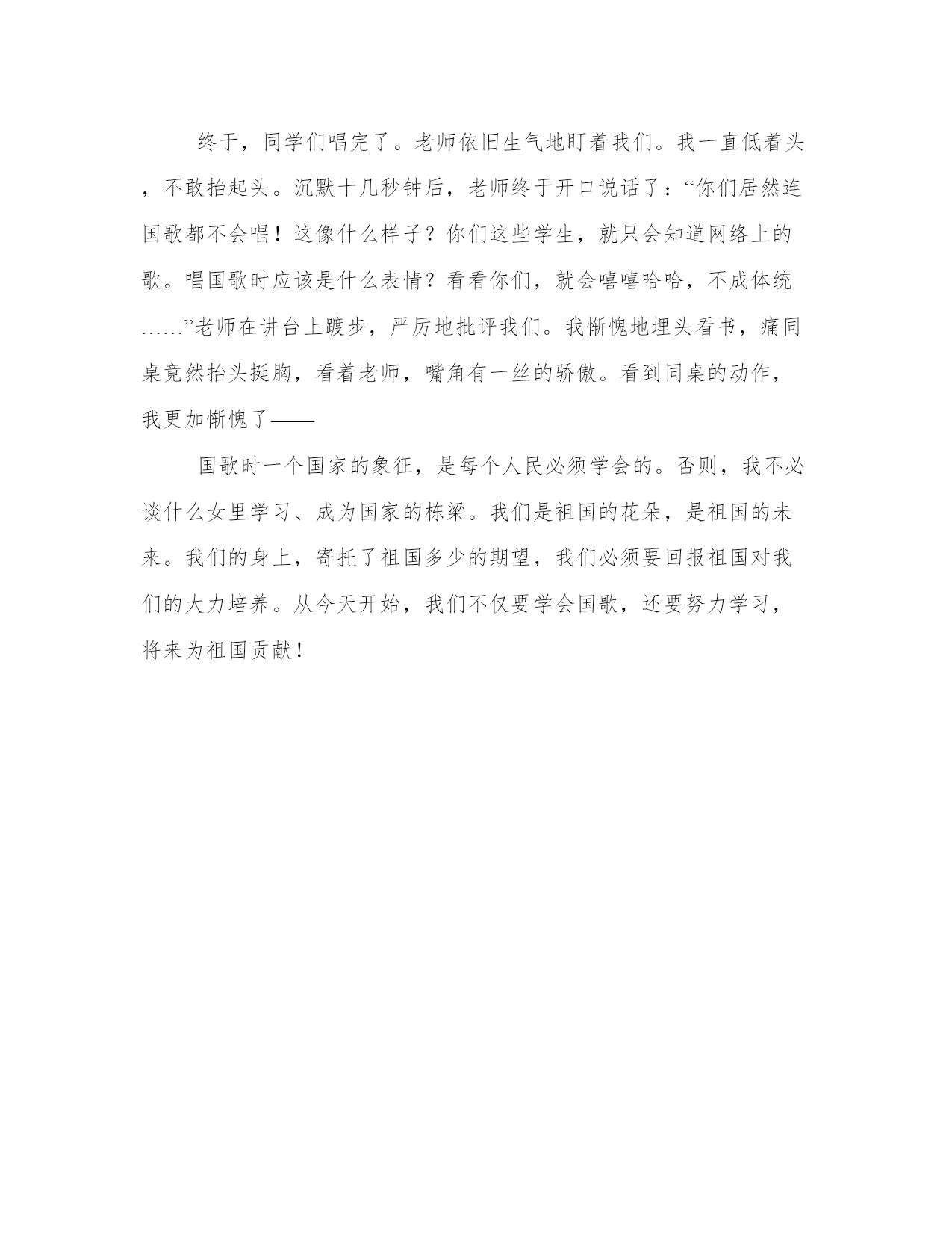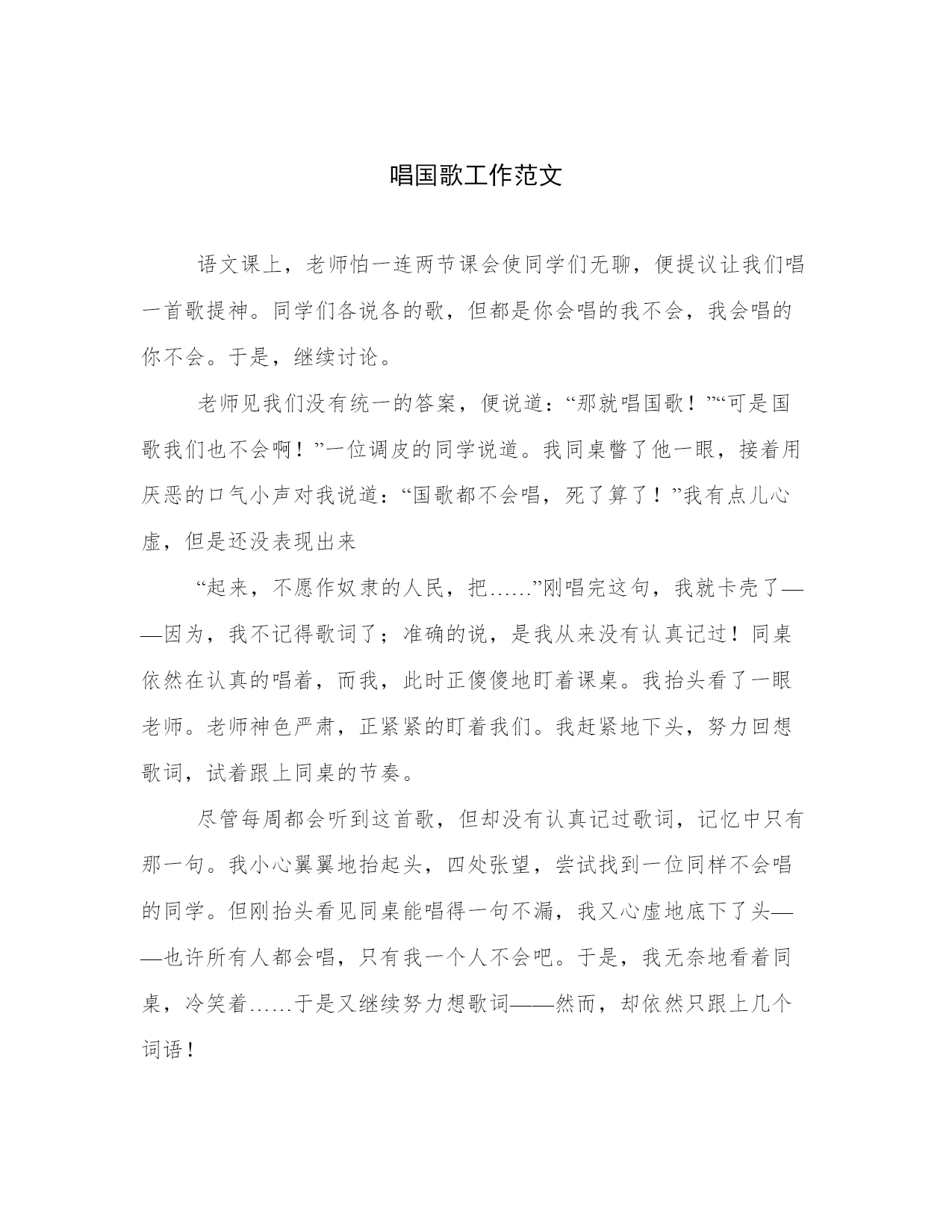 唱国歌工作范文语文课上,老师怕一连两节课会使同学们无聊,便提议让我们唱一首歌提神。同学们各说各的歌,但都是你会唱的我不会,我会唱的你不会。于是,继续讨论。老师见我们没有统一的答案,便说道:“那就唱国歌!”“可是国歌我们也不会啊!”一位调皮的同学说道。我同桌瞥了他一眼,接着用厌恶的口气小声对我说道:“国歌都不会唱,死了算了!”我有点儿心虚,但是还没表现出来“起来,不愿作奴隶的人民,把……”刚唱完这句,我就卡壳了——因为,我不记得歌词了;准确的说,是我从来没有认真记过!同桌依然在认真的唱着,而我,此时正傻傻地盯着课桌。我抬头看了一眼老师。老师神色严肃,正紧紧的盯着我们。我赶紧地下头,努力回想歌词,试着跟上同桌的节奏。尽管每周都会听到这首歌,但却没有认真记过歌词,记忆中只有那一句。我小心翼翼地抬起头,四处张望,尝试找到一位同样不会唱的同学。但刚抬头看见同桌能唱得一句不漏,我又心虚地底下了头——也许所有人都会唱,只有我一个人不会吧。于是,我无奈地看着同桌,冷笑着……于是又继续努力想歌词——然而,却依然只跟上几个词语!终于,同学们唱完了。老师依旧生气地盯着我们。我一直低着头,不敢抬起头。沉默十几秒钟后,老师终于开口说话了:“你们居然连国歌都不会唱!这像什么样子?你们这些学生,就只会知道网络上的歌。唱国歌时应该是什么表情?看看你们,就会嘻嘻哈哈,不成体统……”老师在讲台上踱步,严厉地批评我们。我惭愧地埋头看书,痛同桌竟然抬头挺胸,看着老师,嘴角有一丝的骄傲。看到同桌的动作,我更加惭愧了——国歌时一个国家的象征,是每个人民必须学会的。否则,我不必谈什么女里学习、成为国家的栋梁。我们是祖国的花朵,是祖国的未来。我们的身上,寄托了祖国多少的期望,我们必须要回报祖国对我们的大力培养。从今天开始,我们不仅要学会国歌,还要努力学习,将来为祖国贡献!