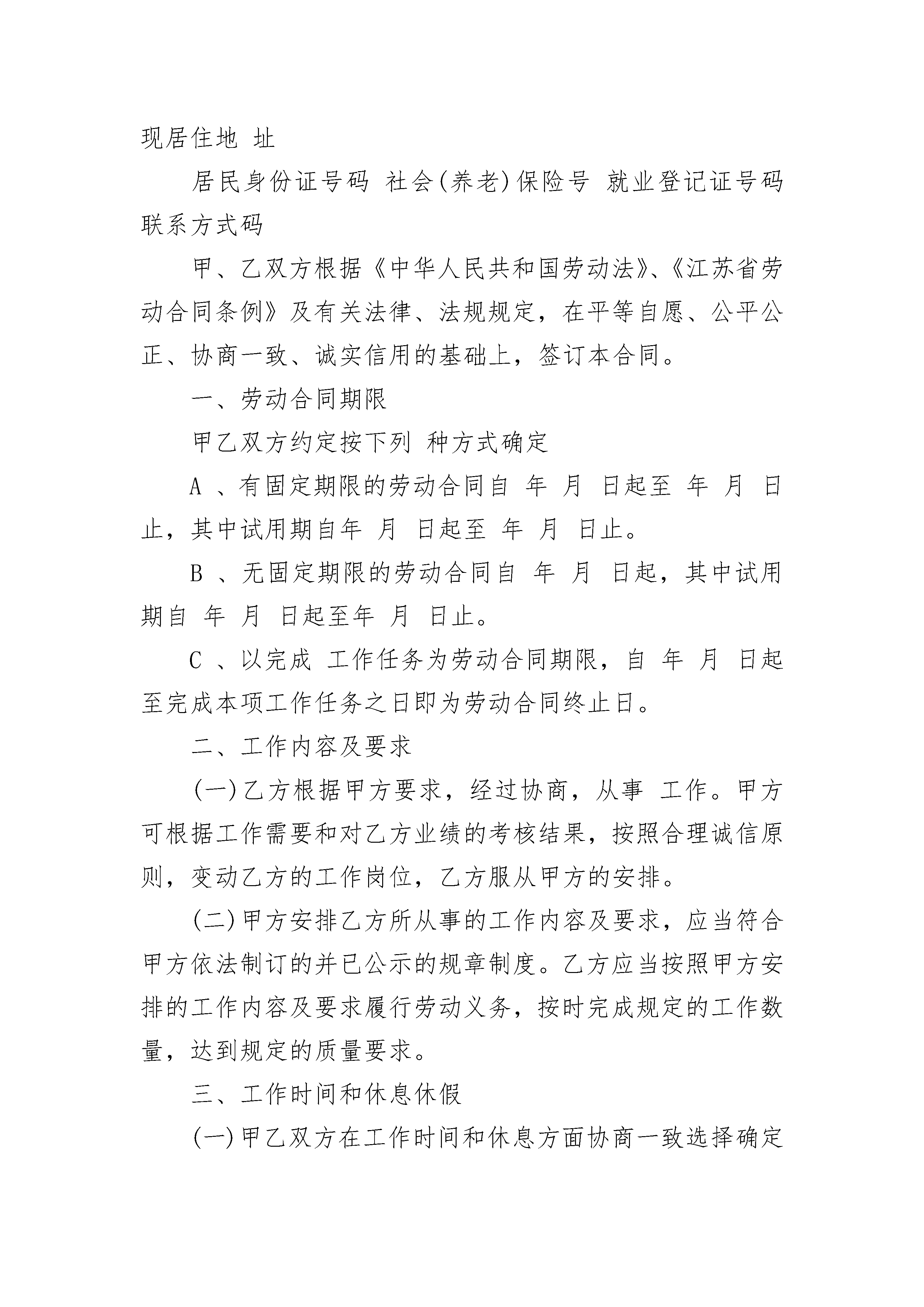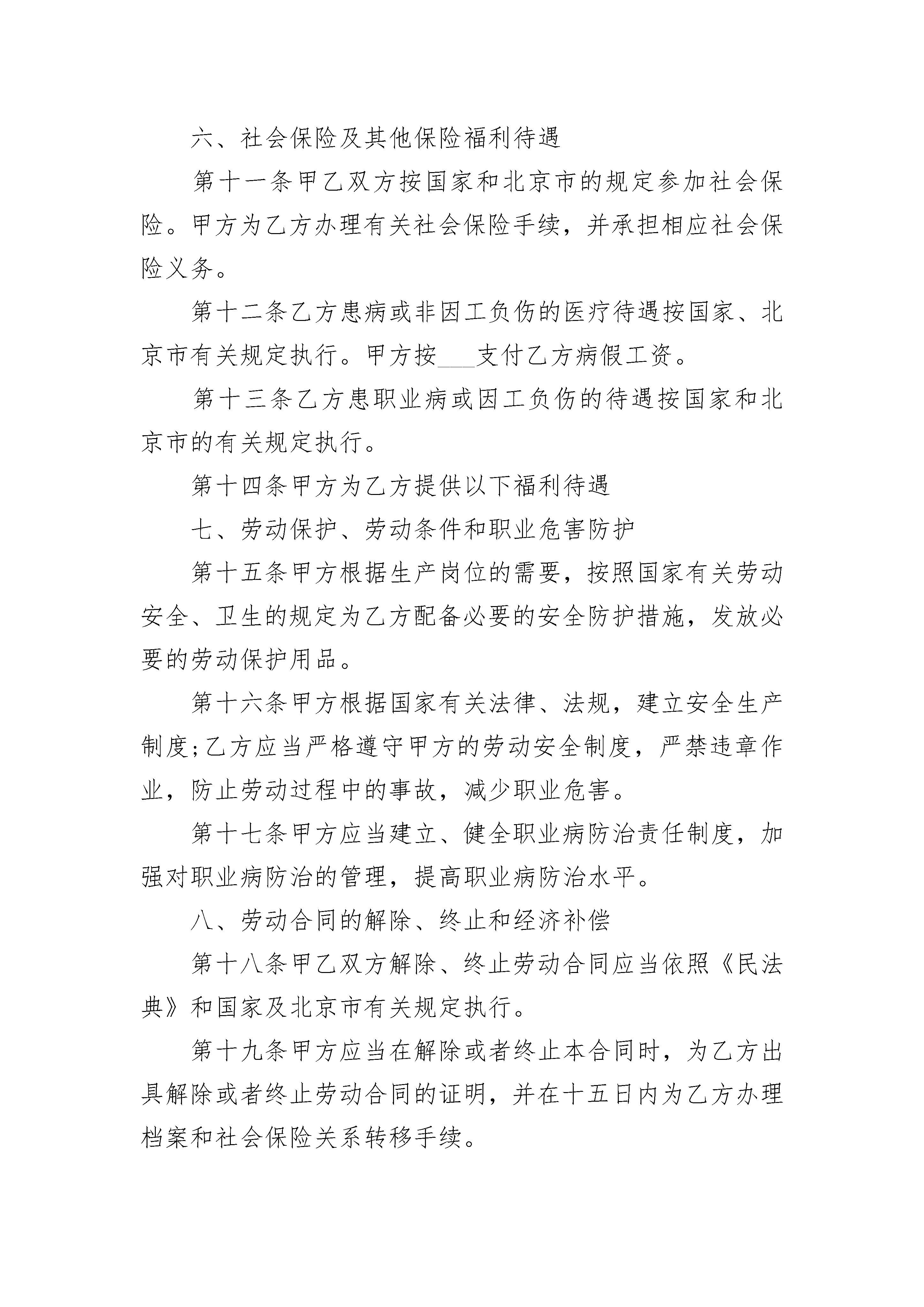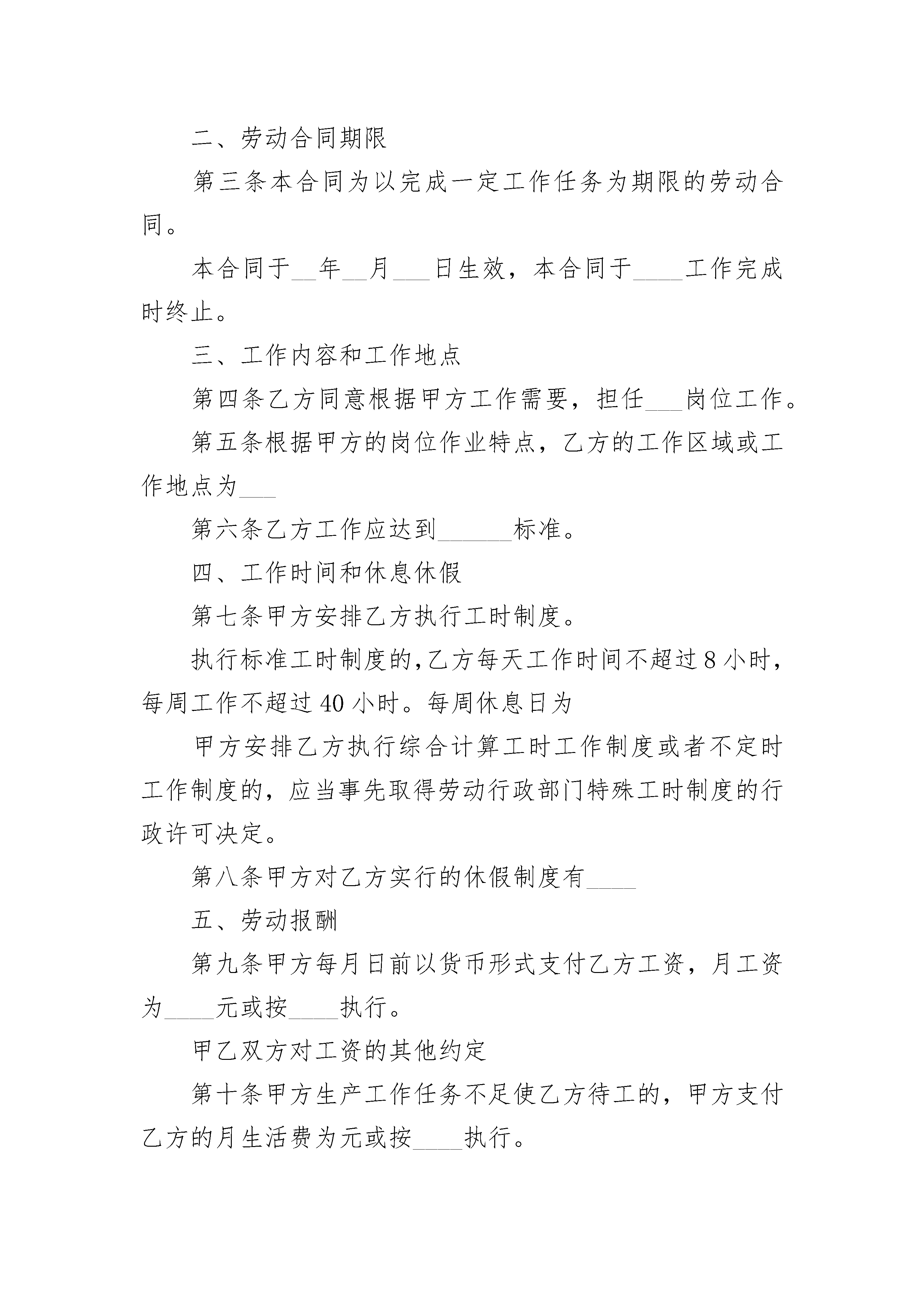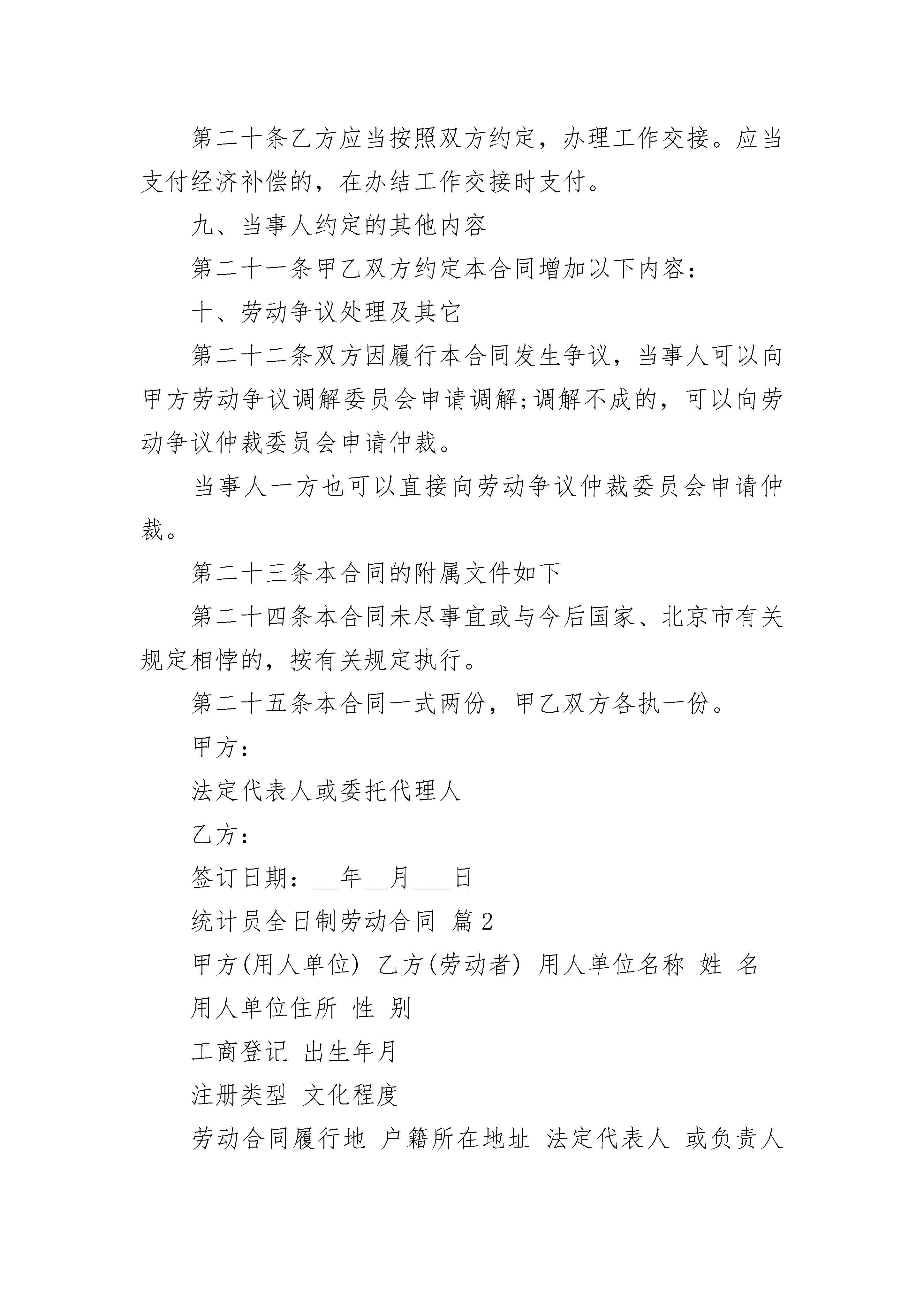统计员全日制劳动合同统计员全日制劳动合同(精选19篇)统计员全日制劳动合同篇1甲方:乙方:签订日期:__年__月___日北京市劳动和社会保障局监制根据《中华人民共和国劳动法》、《民法典》和有关法律、法规,甲乙双方经平等自愿、协商一致签订本合同,共同遵守本合同所列条款。一、劳动合同双方当事人基本情况第一条甲方法定代表人或委托代理人注册地址经营地址第二条乙方性别户籍类型居民身份证号码或者其他有效证件名称证件号码在甲方工作起始时间__年__月___日家庭住址邮政编码在京居住地址邮政编码户口所在地省区街道二、劳动合同期限第三条本合同为以完成一定工作任务为期限的劳动合同。本合同于__年__月___日生效,本合同于____工作完成时终止。三、工作内容和工作地点第四条乙方同意根据甲方工作需要,担任___岗位工作。第五条根据甲方的岗位作业特点,乙方的工作区域或工作地点为___第六条乙方工作应达到______标准。四、工作时间和休息休假第七条甲方安排乙方执行工时制度。执行标准工时制度的,乙方每天工作时间不超过8小时,每周工作不超过40小时。每周休息日为甲方安排乙方执行综合计算工时工作制度或者不定时工作制度的,应当事先取得劳动行政部门特殊工时制度的行政许可决定。第八条甲方对乙方实行的休假制度有____五、劳动报酬第九条甲方每月日前以货币形式支付乙方工资,月工资为____元或按____执行。甲乙双方对工资的其他约定第十条甲方生产工作任务不足使乙方待工的,甲方支付乙方的月生活费为元或按____执行。六、社会保险及其他保险福利待遇第十一条甲乙双方按国家和北京市的规定参加社会保险。甲方为乙方办理有关社会保险手续,并承担相应社会保险义务。第十二条乙方患病或非因工负伤的医疗待遇按国家、北京市有关规定执行。甲方按___支付乙方病假工资。第十三条乙方患职业病或因工负伤的待遇按国家和北京市的有关规定执行。第十四条甲方为乙方提供以下福利待遇七、劳动保护、劳动条件和职业危害防护第十五条甲方根据生产岗位的需要,按照国家有关劳动安全、卫生的规定为乙方配备必要的安全防护措施,发放必要的劳动保护用品。第十六条甲方根据国家有关法律、法规,建立安全生产制度;乙方应当严格遵守甲方的劳动安全制度,严禁违章作业,防止劳动过程中的事故,减少职业危害。第十七条甲方应当建立、健全职业病防治责任制度,加强对职业病防治的管理,提高职业病防治水平。八、劳动合同的解除、终止和经济补偿第十八条甲乙双方解除、终止劳动合同应当依照《民法典》和国家及北京市有关规定执行。第十九条甲方应当在解除或者终止本合同时,为乙方出具解除或者终止劳动合同的证明,并在十五日内为乙方办理档案和社会保险关系转移手续。第二十条乙方应当按照双方约定,办理工作交接。应当支付经济补偿的,在办结工作交接时支付。九、当事人约定的其他内容第二十一条甲乙双方约定本合同增加以下内容:十、劳动争议处理及其它第二十二条双方因履行本合同发生争议,当事人可以向甲方劳动争议调解委员会申请调解;调解不成的,可以向劳动争议仲裁委员会申请仲裁。当事人一方也可以直接向劳动争议仲裁委员会申请仲裁。第二十三条本合同的附属文件如下第二十四条本合同未尽事宜或与今后国家、北京市有关规定相悖的,按有关规定执行。第二十五条本合同一式两份,甲乙双方各执一份。甲方:法定代表人或委托代理人乙方:签订日期:__年__月___日统计员全日制劳动合同篇2甲方(用人单位)乙方(劳动者)用人单位名称姓名用人单位住所性别工商登记出生年月注册类型文化程度劳动合同履行地户籍所在地址法定代表人或负责人现居住地址居民身份证号码社会(养老)保险号就业登记证号码联系方式码甲、乙双方根据《中华人民共和国劳动法》、《江苏省劳动合同条例》及有关法律、法规规定,在平等自愿、公平公正、协商一致、诚实信用的基础上,签订本合同。一、劳动合同期限甲乙双方约定按下列种方式确定A、有固定期限的劳动合同自年月日起至年月日止,其中试用期自年月日起至年月日止。B、无固定期限的劳动合同自年月日起,其中试用期自年月日起至年月日止。C、以完成工作任务为劳动合同期限,自年月日起至完成本项工作任务之日即为劳动合同终止日。二、工作内容及要求(一)乙方根据甲方要求,经过协商,从事工作。甲方可根据工作需要和对乙方业绩的考核结果,按照合理诚信原则,变动乙方的工作岗位,乙方服从甲方的安排。(二)甲方安排乙方所从事的工作内容及要求,应当符合甲方依法制订的并已公示的规章制度。乙方应当按照甲方安排的工作内容及要求履行劳动义务,按时完成规定的工作数量,达到规定的质量要求。三、工作时间和休息休假(一)甲乙双方在工作时间和休息方面协商一致选择确定条款,平均每周工作四十小时:A、甲方实行每天小时工作制。具体作息时间,甲方安排如下:每周周至周工作,上午,下午。每周