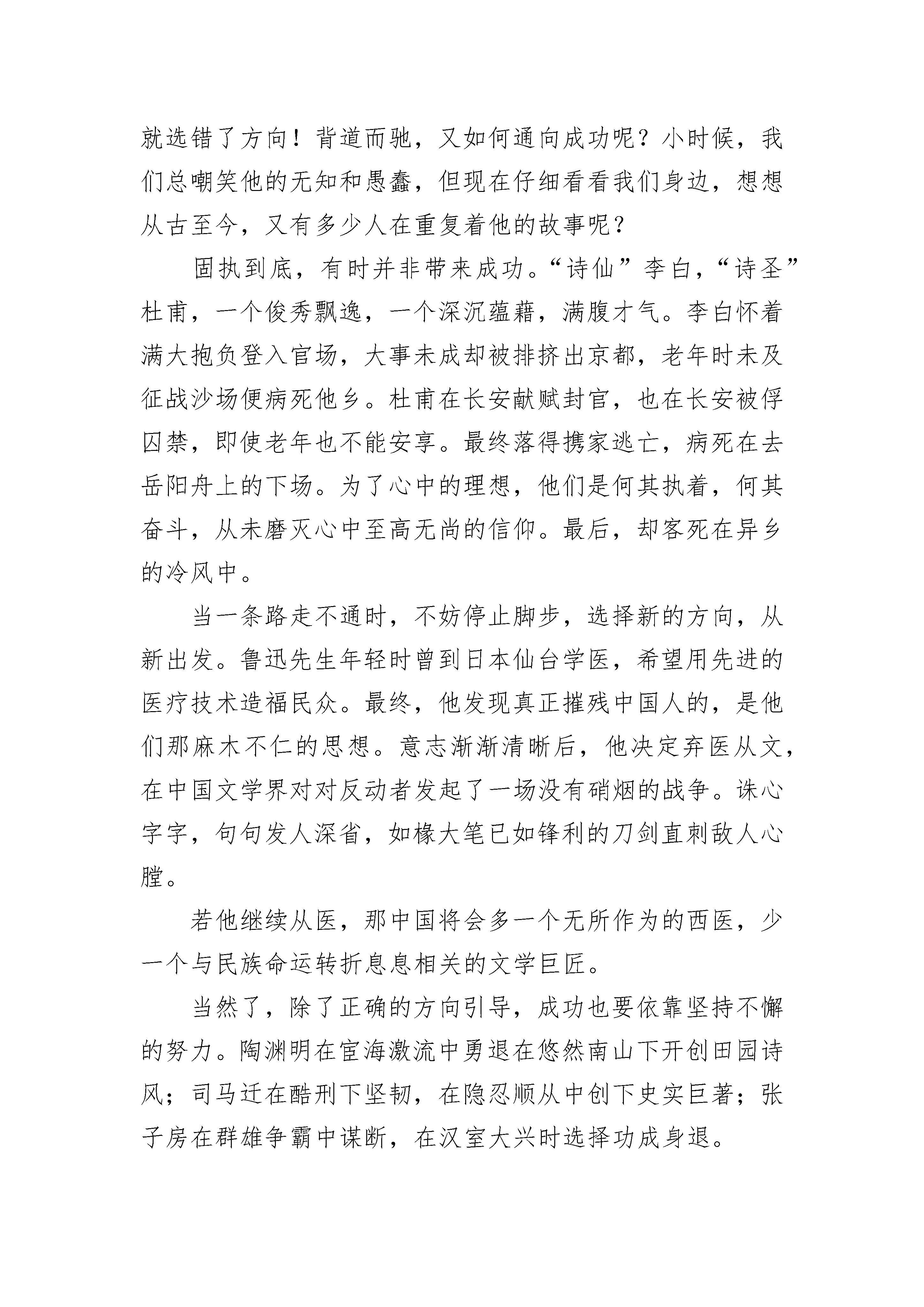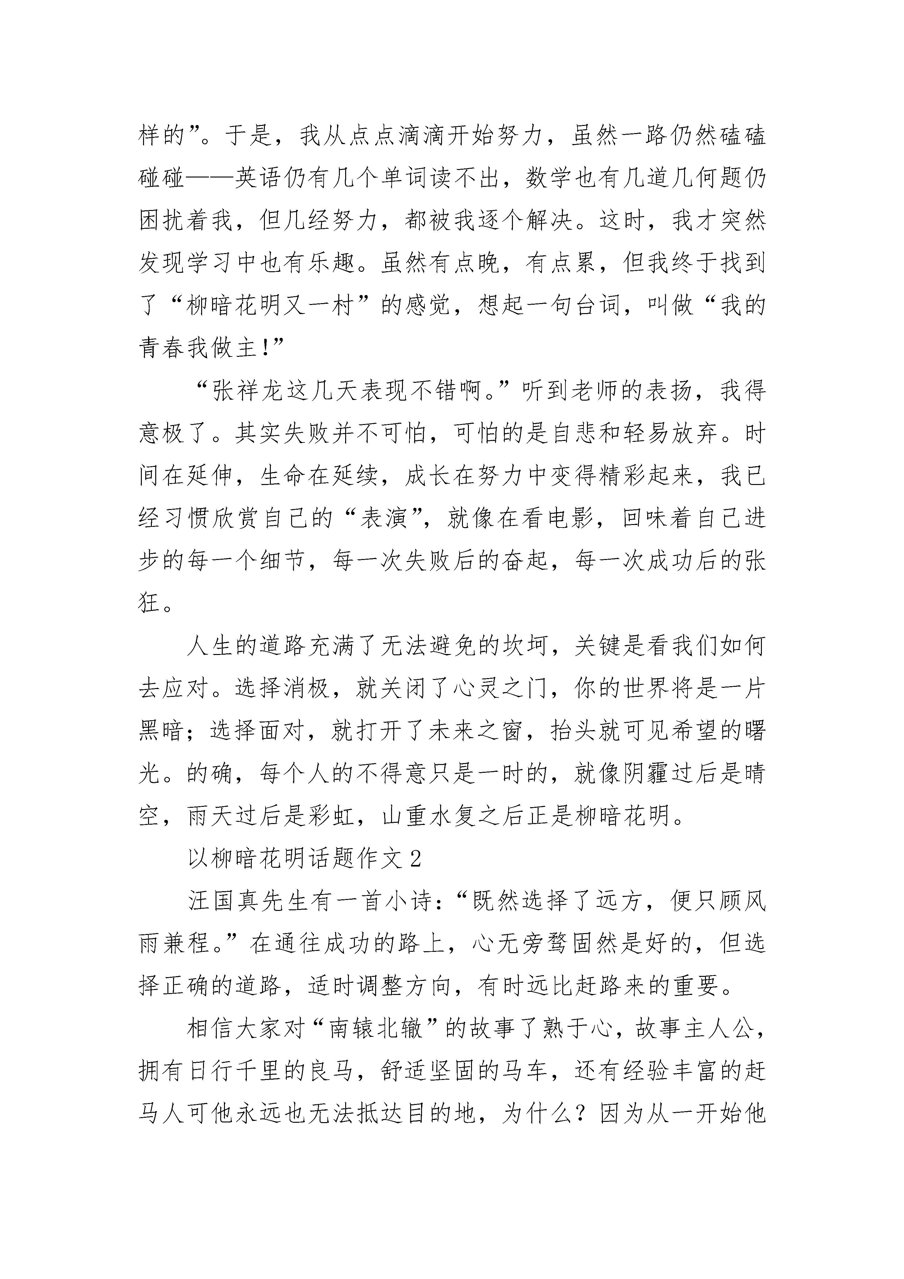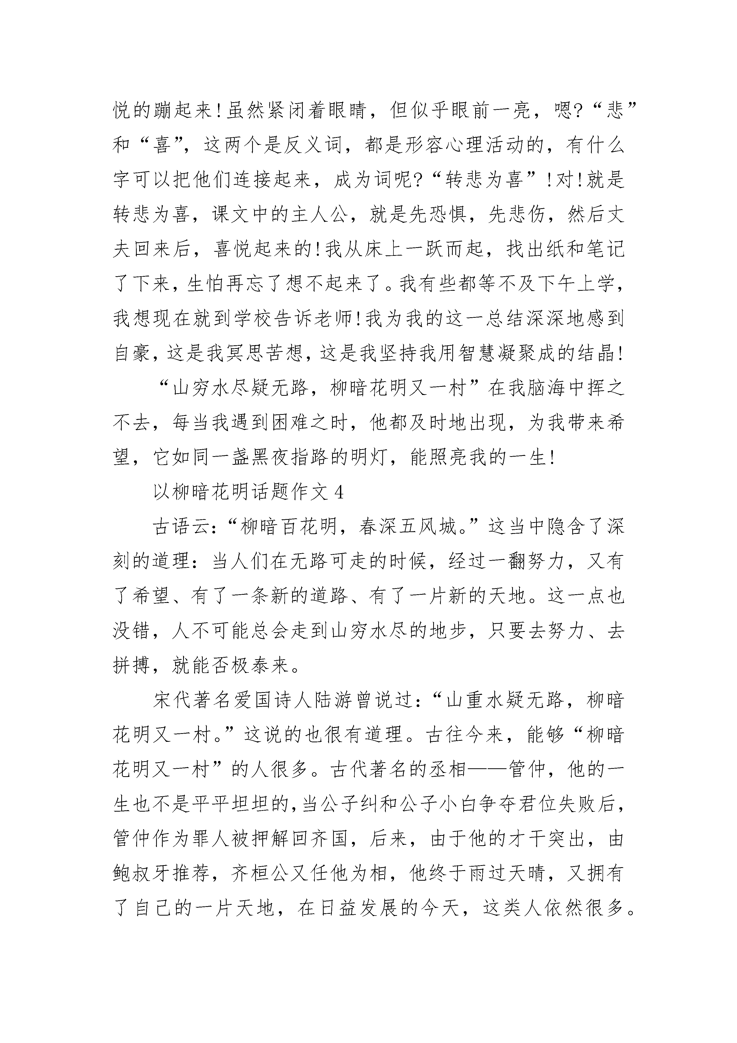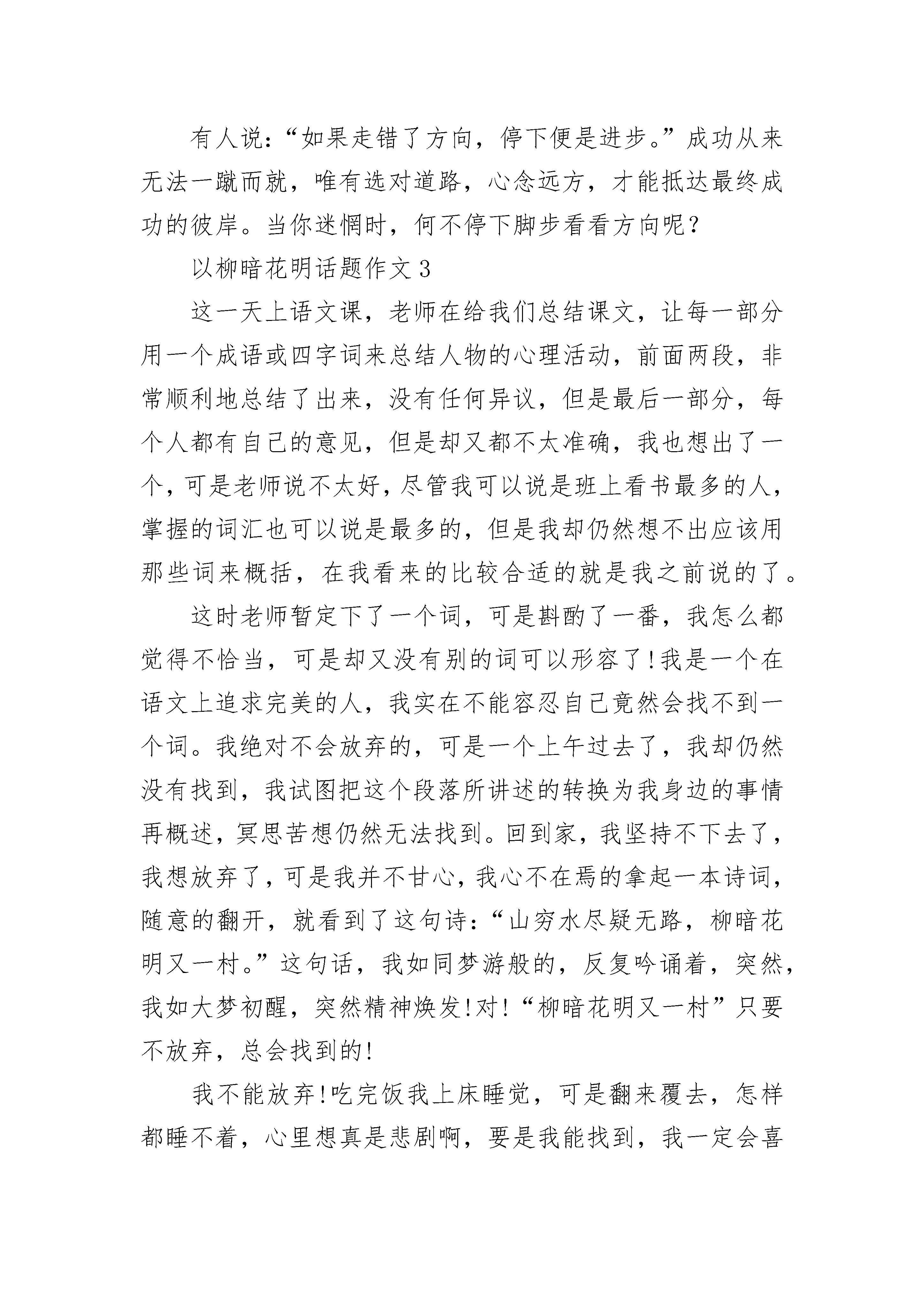 以柳暗花明话题作文精选阳光总在风雨后,不经历风雨,怎能见彩虹?事实告诉我,没有谁的一生是一帆风顺的。人们之所以会失败,往往是因为做事情半途而废,也许只要继续坚持下去,下一刻便是柳暗花明。面对耳聋,贝多芬还是选择了他所向往的音乐,他的不放弃,成就了流传至今的不朽名曲;面对流放,苏武还是选择了在无际草原上与群羊共度寒暑,他的不放弃,让他最终成为众口皆碑的爱国英雄;面对接踵而至的失败,爱迪生还是选择了投身实验,他的不放弃,带来的是造福人类的众多发明成果。我想,既然他们都能在“疑无路”时坚强地熬到“柳暗花明”,我为什么不行呢?画面切换到几星期前。作业上的大红叉、卷子上不堪入眼的分数、老师关心的询问、父母急切的叮嘱、同学异样的眼光……这一切变得重复出现,时时缠绕在我的左右,束缚了我的思维,眼前一切变得模糊起来,前路渺茫。“要是这样,我就会失败,可是那样……”“张祥龙!你来解一下这道题。”糟糕,我在“思考”昨天的事,老师的讲课,似乎根本就未曾经过我的大脑。“这个……”大家都看到了我的手足无措,狼狈万分。“你坐下,认真听!”恍恍惚惚,一天过去了。“不能这样了,班主任说过,这是懦弱,可我也不想这样的”。于是,我从点点滴滴开始努力,虽然一路仍然磕磕碰碰——英语仍有几个单词读不出,数学也有几道几何题仍困扰着我,但几经努力,都被我逐个解决。这时,我才突然发现学习中也有乐趣。虽然有点晚,有点累,但我终于找到了“柳暗花明又一村”的感觉,想起一句台词,叫做“我的青春我做主!”“张祥龙这几天表现不错啊。”听到老师的表扬,我得意极了。其实失败并不可怕,可怕的是自悲和轻易放弃。时间在延伸,生命在延续,成长在努力中变得精彩起来,我已经习惯欣赏自己的“表演”,就像在看电影,回味着自己进步的每一个细节,每一次失败后的奋起,每一次成功后的张狂。人生的道路充满了无法避免的坎坷,关键是看我们如何去应对。选择消极,就关闭了心灵之门,你的世界将是一片黑暗;选择面对,就打开了未来之窗,抬头就可见希望的曙光。的确,每个人的不得意只是一时的,就像阴霾过后是晴空,雨天过后是彩虹,山重水复之后正是柳暗花明。以柳暗花明话题作文2汪国真先生有一首小诗:“既然选择了远方,便只顾风雨兼程。”在通往成功的路上,心无旁骛固然是好的,但选择正确的道路,适时调整方向,有时远比赶路来的重要。相信大家对“南辕北辙”的故事了熟于心,故事主人公,拥有日行千里的良马,舒适坚固的马车,还有经验丰富的赶马人可他永远也无法抵达目的地,为什么?因为从一开始他就选错了方向!背道而驰,又如何通向成功呢?小时候,我们总嘲笑他的无知和愚蠢,但现在仔细看看我们身边,想想从古至今,又有多少人在重复着他的故事呢?固执到底,有时并非带来成功。“诗仙”李白,“诗圣”杜甫,一个俊秀飘逸,一个深沉蕴藉,满腹才气。李白怀着满大抱负登入官场,大事未成却被排挤出京都,老年时未及征战沙场便病死他乡。杜甫在长安献赋封官,也在长安被俘囚禁,即使老年也不能安享。最终落得携家逃亡,病死在去岳阳舟上的下场。为了心中的理想,他们是何其执着,何其奋斗,从未磨灭心中至高无尚的信仰。最后,却客死在异乡的冷风中。当一条路走不通时,不妨停止脚步,选择新的方向,从新出发。鲁迅先生年轻时曾到日本仙台学医,希望用先进的医疗技术造福民众。最终,他发现真正摧残中国人的,是他们那麻木不仁的思想。意志渐渐清晰后,他决定弃医从文,在中国文学界对对反动者发起了一场没有硝烟的战争。诛心字字,句句发人深省,如椽大笔已如锋利的刀剑直刺敌人心膛。若他继续从医,那中国将会多一个无所作为的西医,少一个与民族命运转折息息相关的文学巨匠。当然了,除了正确的方向引导,成功也要依靠坚持不懈的努力。陶渊明在宦海激流中勇退在悠然南山下开创田园诗风;司马迁在酷刑下坚韧,在隐忍顺从中创下史实巨著;张子房在群雄争霸中谋断,在汉室大兴时选择功成身退。有人说:“如果走错了方向,停下便是进步。”成功从来无法一蹴而就,唯有选对道路,心念远方,才能抵达最终成功的彼岸。当你迷惘时,何不停下脚步看看方向呢?以柳暗花明话题作文3这一天上语文课,老师在给我们总结课文,让每一部分用一个成语或四字词来总结人物的心理活动,前面两段,非常顺利地总结了出来,没有任何异议,但是最后一部分,每个人都有自己的意见,但是却又都不太准确,我也想出了一个,可是老师说不太好,尽管我可以说是班上看书最多的人,掌握的词汇也可以说是最多的,但是我却仍然想不出应该用那些词来概括,在我看来的比较合适的就是我之前说的了。这时老师暂定下了一个词,可是斟酌了一番,我怎么都觉得不恰当,可是却又没有别的词可以形容了!我是一个在语文上追求完美的人,我实在不能容忍自己竟然会找不到一个词。我绝对不会放弃的,可是一个上午过去了,我却仍然没有找到,我试图把这个段落所讲述的转换为我身边