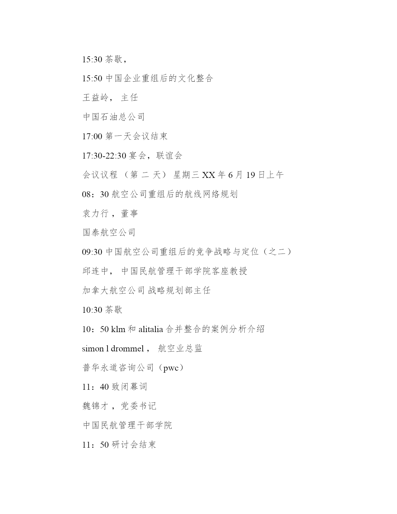 民航会议议程范文民航会议议程会议议程(第一天)星期二XX年6月18日08:30签到09:00中国民用航空总局领导致辞09:10主办单位袁耀辉司长致开幕辞09:20承办单位致辞段继延,院长中国民航管理干部学院09:30航空公司重组的关键因素laurenceh.alberts,副总裁jonathangove,亚洲合伙人美智咨询公司(mercer)10:30茶歇10:50中国航空公司重组后的竞争战略与定位(之一)邱连中,中国民航管理干部学院客座教授加拿大航空公司战略规划部主任12:00专家楼a座餐厅:自助餐14:00重组航空公司的战略规划制定罗义德(mr.peterliver),中国地区总经理英国航空公司15:30茶歇,15:50中国企业重组后的文化整合王益岭,主任中国石油总公司17:00第一天会议结束17:30-22:30宴会,联谊会会议议程(第二天)星期三XX年6月19日上午08:30航空公司重组后的航线网络规划袁力行,董事国泰航空公司09:30中国航空公司重组后的竞争战略与定位(之二)邱连中,中国民航管理干部学院客座教授加拿大航空公司战略规划部主任10:30茶歇10:50klm和alitalia合并整合的案例分析介绍simonldrommel,航空业总监普华永道咨询公司(pwc)11:40致闭幕词魏锦才,党委书记中国民航管理干部学院11:50研讨会结束