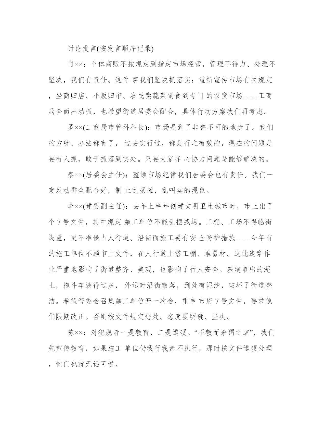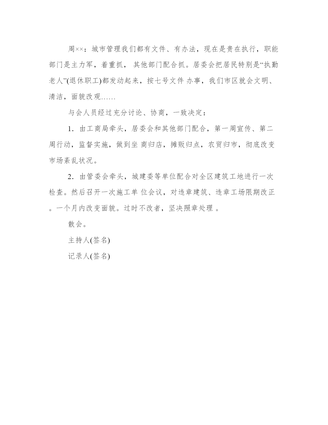 优秀会议记录范例文档时间:4月8日上午地点:管委会会议室主持人:李××(管委会主任)出席者:杨××(管委会副主任)、周××(管委会副主任管城建)、李××(市建委副主任)、肖××(市工商局副局长)、陈××(市建委城建科科长)及建委、工商局有关科室宣传人员。街道居委会负责人。列席者:管委会全体干部记录:邹××(管委会办公室秘书)讨论议题:1.如何整顿城市市场秩序。2.如何制止违章建筑、维护市容市貌。杨主任报告城市现状:我区过去在开发区党委领导下,各职能单位同心协力、齐抓共管在创建文明卫生城市方面取得了一定成绩,相应的城市市场秩序有一定进步,市容街道也较可观。可近几个月来,市场秩序倒退了,街道上小商贩逐渐多起来,水果摊、菜担、小百货满街乱摆……一些建筑施工单位沿街违章搭棚。乱堆放材料,搬运泥土撒落大街……这些情况严重地破坏了市容市貌,使大街变得又乱又脏;社会各界反应很强烈。因此今天请大家来分析:如何整顿市场秩序?如何治理违章建筑、违章作业、维护市容……讨论发言(按发言顺序记录)肖××:个体商贩不按规定到指定市场经营,管理不得力、处理不坚决,我们有责任。这件事我们坚决抓落实:重新宣传市场有关规定,坐商归店、小贩归市、农民卖蔬菜副食到专门的农贸市场……工商局全面出动抓,也希望街道居委会配合,具体行动方案我们再考虑。罗××(工商局市管科科长):市场是到了非整不可的地步了。我们的方针、办法都有了,过去实行过,都是行之有效的,现在的问题是要有人抓,敢于抓落到实处。只要大家齐心协力问题是能够解决的。秦××(居委会主任):整顿市场纪律我们居委会也有责任。我们一定发动群众配合好,制止乱摆摊,乱叫卖的现象。李××(建委副主任):去年上半年创建文明卫生城市时,市上出了个7号文件,其中规定施工单位不能乱摆战场。工棚、工场不得临街设置,更不准侵占人行道。沿街面施工要有安全防护措施……今年有的施工单位不顾市上文件,在人行道上搭工棚、堆器材。这此违章作业严重地影响了街道整齐、美观,也影响了行人安全。基建取出的泥土,拖斗车装得过多,外运时沿街散落,到处有泥沙,破坏了街道整洁。希望管委会召集施工单位开一次会,重申市府7号文件,要求他们限期改正。否则按文件规定惩处。态度要明确、坚决。陈××:对犯规者一是教育,二是逗硬。“不教而杀谓之虐”,我们先宣传教育,如果施工单位仍我行我素不执行,那时按文件逗硬处理,他们也就无话可说。周××:城市管理我们都有文件、有办法,现在是贵在执行,职能部门是主力军,着重抓,其他部门配合抓。居委会把居民特别是“执勤老人”(退休职工)都发动起来,按七号文件办事,我们市区就会文明、清洁,面貌改观……与会人员经过充分讨论、协商,一致决定:1.由工商局牵头,居委会和其他部门配合,第一周宣传、第二周行动,监督实施,做到坐商归店,摊贩归点,农贸归市,彻底改变市场紊乱状况。2.由管委会牵头,城建委等单位配合对全区建筑工地进行一次检查。然后召开一次施工单位会议,对违章建筑、违章工场限期改正。一个月内改变面貌。过时不改者,坚决照章处理。散会。主持人(签名)记录人(签名)