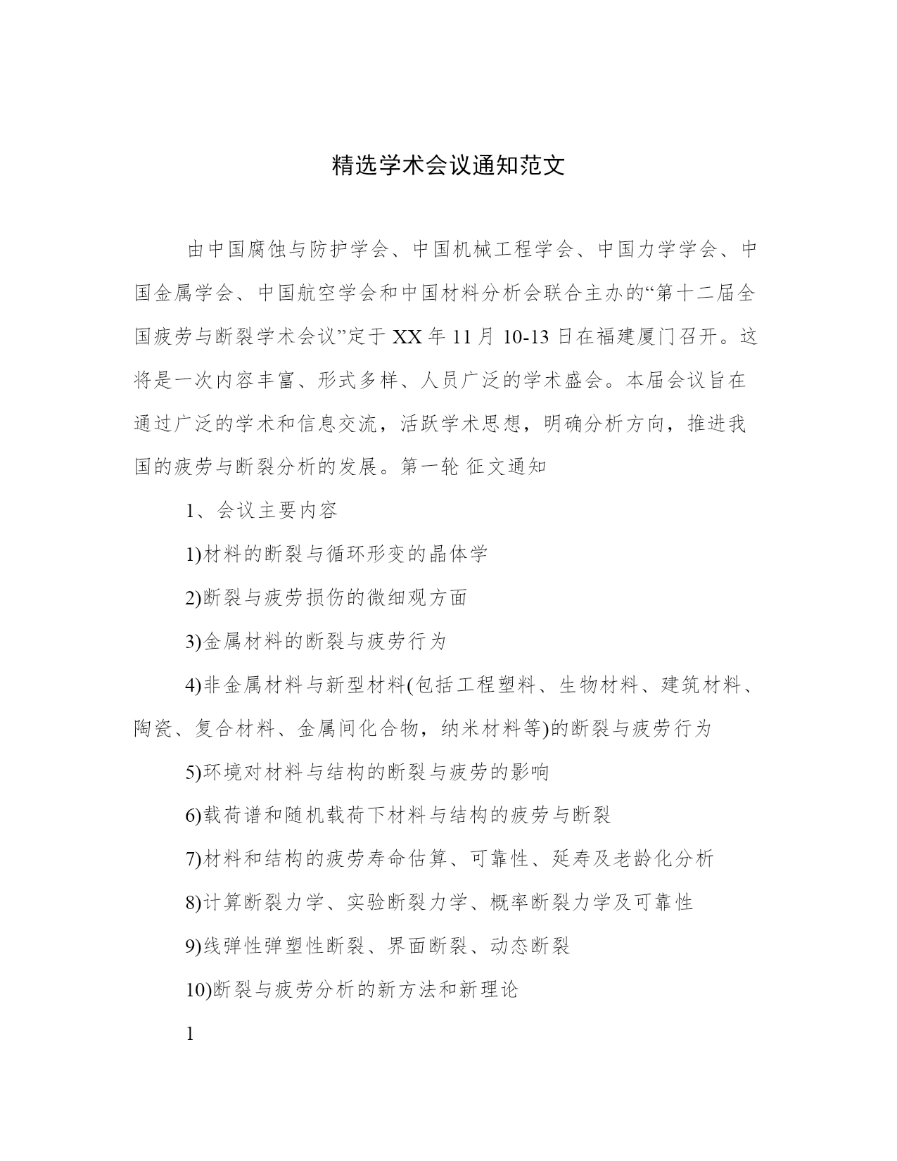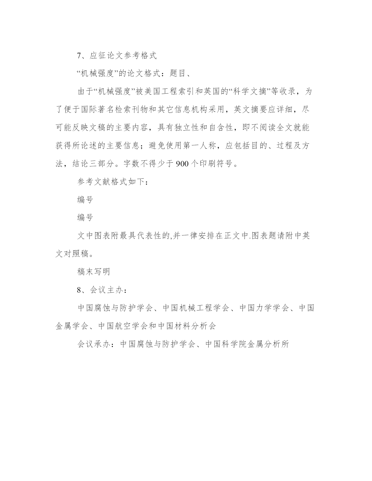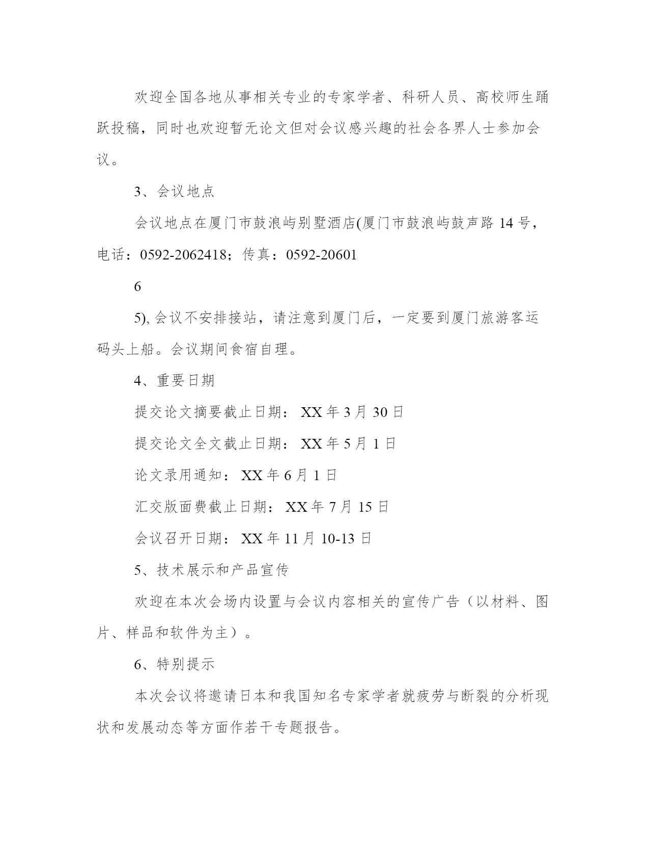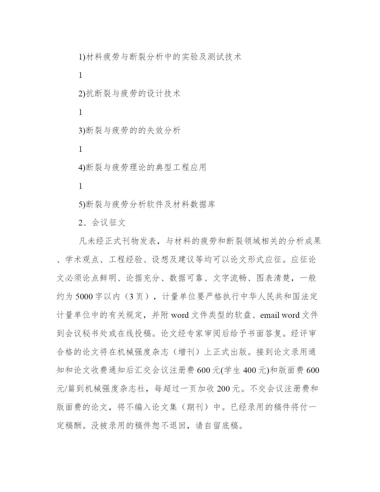 精选学术会议通知范文由中国腐蚀与防护学会、中国机械工程学会、中国力学学会、中国金属学会、中国航空学会和中国材料分析会联合主办的“第十二届全国疲劳与断裂学术会议”定于XX年11月10-13日在福建厦门召开。这将是一次内容丰富、形式多样、人员广泛的学术盛会。本届会议旨在通过广泛的学术和信息交流,活跃学术思想,明确分析方向,推进我国的疲劳与断裂分析的发展。第一轮征文通知1、会议主要内容1)材料的断裂与循环形变的晶体学2)断裂与疲劳损伤的微细观方面3)金属材料的断裂与疲劳行为4)非金属材料与新型材料(包括工程塑料、生物材料、建筑材料、陶瓷、复合材料、金属间化合物,纳米材料等)的断裂与疲劳行为5)环境对材料与结构的断裂与疲劳的影响6)载荷谱和随机载荷下材料与结构的疲劳与断裂7)材料和结构的疲劳寿命估算、可靠性、延寿及老龄化分析8)计算断裂力学、实验断裂力学、概率断裂力学及可靠性9)线弹性弹塑性断裂、界面断裂、动态断裂10)断裂与疲劳分析的新方法和新理论11)材料疲劳与断裂分析中的实验及测试技术12)抗断裂与疲劳的设计技术13)断裂与疲劳的的失效分析14)断裂与疲劳理论的典型工程应用15)断裂与疲劳分析软件及材料数据库2、会议征文凡未经正式刊物发表,与材料的疲劳和断裂领域相关的分析成果、学术观点、工程经验、设想及建议等均可以论文形式应征。应征论文必须论点鲜明、论据充分、数据可靠、文字流畅、图表清楚,一般约为5000字以内(3页),计量单位要严格执行中华人民共和国法定计量单位中的有关规定,并附word文件类型的软盘、emailword文件到会议秘书处或在线投稿。论文经专家审阅后给予书面答复。经评审合格的论文将在机械强度杂志(增刊)上正式出版。接到论文录用通知和论文收费通知后汇交会议注册费600元(学生400元)和版面费600元/篇到机械强度杂志社,每超过一页加收200元。不交会议注册费和版面费的论文,将不编入论文集(期刊)中。已经录用的稿件将付一定稿酬。没被录用的稿件恕不退回,请自留底稿。欢迎全国各地从事相关专业的专家学者、科研人员、高校师生踊跃投稿,同时也欢迎暂无论文但对会议感兴趣的社会各界人士参加会议。3、会议地点会议地点在厦门市鼓浪屿别墅酒店(厦门市鼓浪屿鼓声路14号,电话:0592-2062418;传真:0592-2060165),会议不安排接站,请注意到厦门后,一定要到厦门旅游客运码头上船。会议期间食宿自理。4、重要日期提交论文摘要截止日期:XX年3月30日提交论文全文截止日期:XX年5月1日论文录用通知:XX年6月1日汇交版面费截止日期:XX年7月15日会议召开日期:XX年11月10-13日5、技术展示和产品宣传欢迎在本次会场内设置与会议内容相关的宣传广告(以材料、图片、样品和软件为主)。6、特别提示本次会议将邀请日本和我国知名专家学者就疲劳与断裂的分析现状和发展动态等方面作若干专题报告。7、应征论文参考格式“机械强度”的论文格式:题目、由于“机械强度”被美国工程索引和英国的“科学文摘”等收录,为了便于国际著名检索刊物和其它信息机构采用,英文摘要应详细,尽可能反映文稿的主要内容,具有独立性和自含性,即不阅读全文就能获得所论述的主要信息;避免使用第一人称,应包括目的、过程及方法,结论三部分。字数不得少于900个印刷符号。参考文献格式如下:编号编号文中图表附最具代表性的,并一律安排在正文中.图表题请附中英文对照稿。稿末写明8、会议主办:中国腐蚀与防护学会、中国机械工程学会、中国力学学会、中国金属学会、中国航空学会和中国材料分析会会议承办:中国腐蚀与防护学会、中国科学院金属分析所