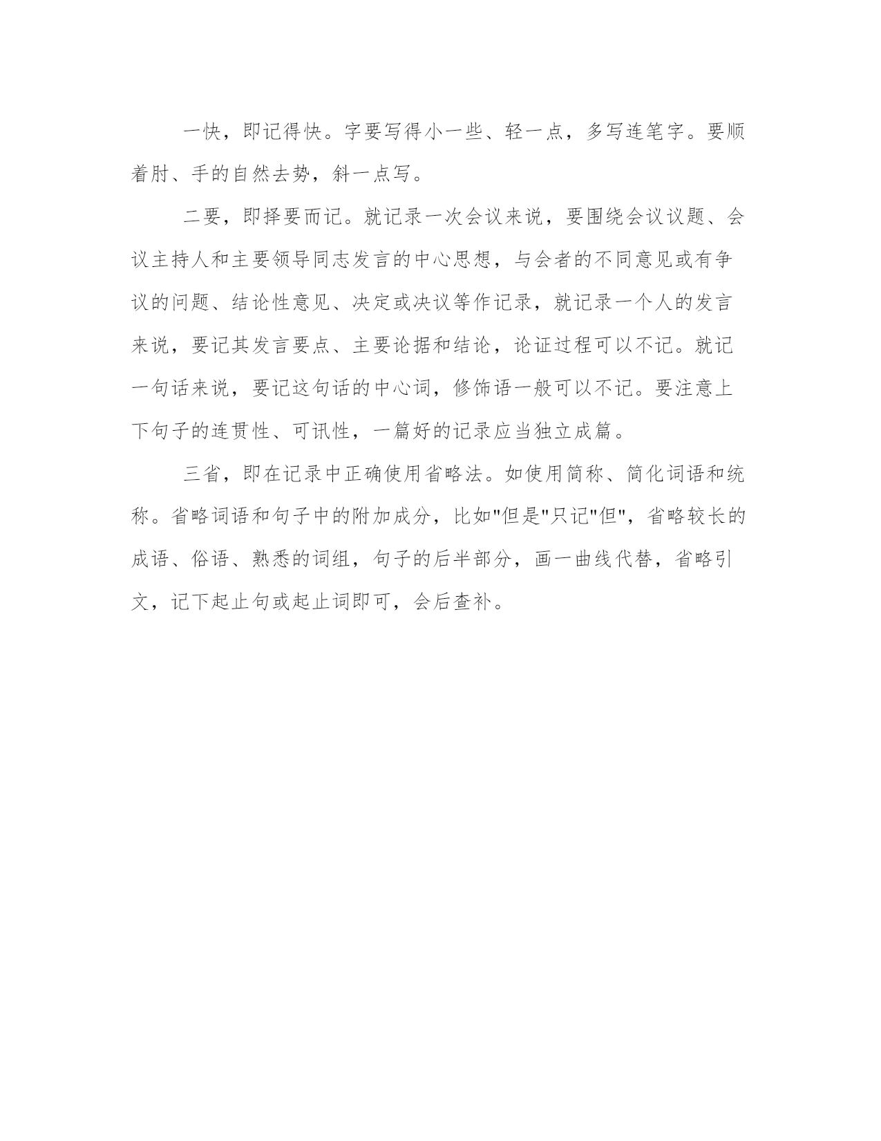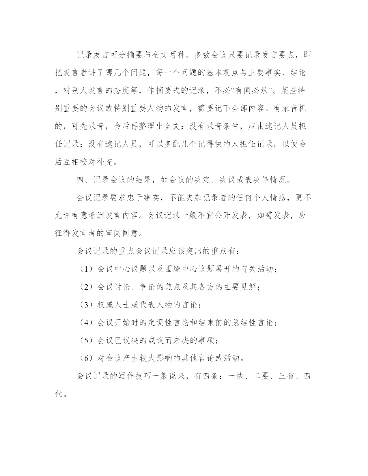 优秀会议记录介绍范文在会议过程中,由记录人员把会议的组织情况和具体内容记录下来,就形成了会议记录。“记”有详记与略记之别。略记是记会议大要,会议上的重要或主要言论。详记则要求记录的项目必须完备,记录的言论必须详细完整。若需要留下包括上述内容的会议记录则要靠“录”。“录”有笔录、音录和影像录几种,对会议记录而言,音录、像录通常只是手段,最终还要将录下的内容还原成文字。笔录也常常要借助音录、像录,以之作为记录内容最大限度地再现会议情境的保证。会议记录的基本要求一、准确写明会议名称(要写全称),开会时间、地点,会议性质。二、详细记下会议主持人、出席会议应到和实到人数,缺席、迟到或早退人数及其姓名、职务,记录者姓名。如果是群众性大会,只要记参加的对象和总人数,以及出席会议的较重要的领导成员即可。如果某些重要的会议,出席对象来自不同单位,应设置签名簿,请出席者签署姓名、单位、职务等。三、忠实记录会议上的发言和有关动态。会议发言的内容是记录的重点。其他会议动态,如发言中插话、笑声、掌声,临时中断以及别的重要的会场情况等,也应予以记录。记录发言可分摘要与全文两种。多数会议只要记录发言要点,即把发言者讲了哪几个问题,每一个问题的基本观点与主要事实、结论,对别人发言的态度等,作摘要式的记录,不必“有闻必录”。某些特别重要的会议或特别重要人物的发言,需要记下全部内容。有录音机的,可先录音,会后再整理出全文;没有录音条件,应由速记人员担任记录;没有速记人员,可以多配几个记得快的人担任记录,以便会后互相校对补充。四、记录会议的结果,如会议的决定、决议或表决等情况。会议记录要求忠于事实,不能夹杂记录者的任何个人情感,更不允许有意增删发言内容。会议记录一般不宜公开发表,如需发表,应征得发言者的审阅同意。会议记录的重点会议记录应该突出的重点有:(1)会议中心议题以及围绕中心议题展开的有关活动;(2)会议讨论、争论的焦点及其各方的主要见解;(3)权威人士或代表人物的言论;(4)会议开始时的定调性言论和结束前的总结性言论;(5)会议已议决的或议而未决的事项;(6)对会议产生较大影响的其他言论或活动。会议记录的写作技巧一般说来,有四条:一快、二要、三省、四代。一快,即记得快。字要写得小一些、轻一点,多写连笔字。要顺着肘、手的自然去势,斜一点写。二要,即择要而记。就记录一次会议来说,要围绕会议议题、会议主持人和主要领导同志发言的中心思想,与会者的不同意见或有争议的问题、结论性意见、决定或决议等作记录,就记录一个人的发言来说,要记其发言要点、主要论据和结论,论证过程可以不记。就记一句话来说,要记这句话的中心词,修饰语一般可以不记。要注意上下句子的连贯性、可讯性,一篇好的记录应当独立成篇。三省,即在记录中正确使用省略法。如使用简称、简化词语和统称。省略词语和句子中的附加成分,比如"但是"只记"但",省略较长的成语、俗语、熟悉的词组,句子的后半部分,画一曲线代替,省略引文,记下起止句或起止词即可,会后查补。