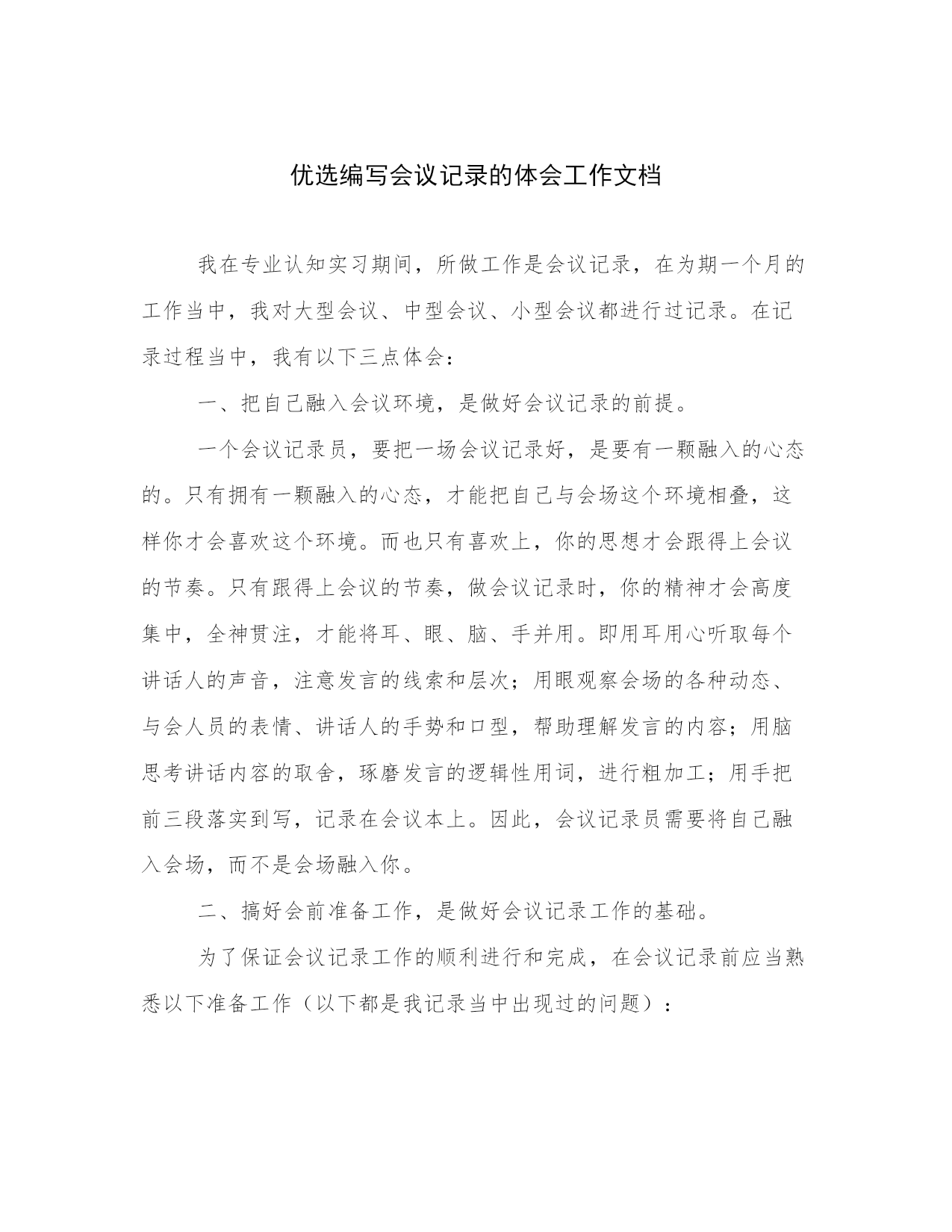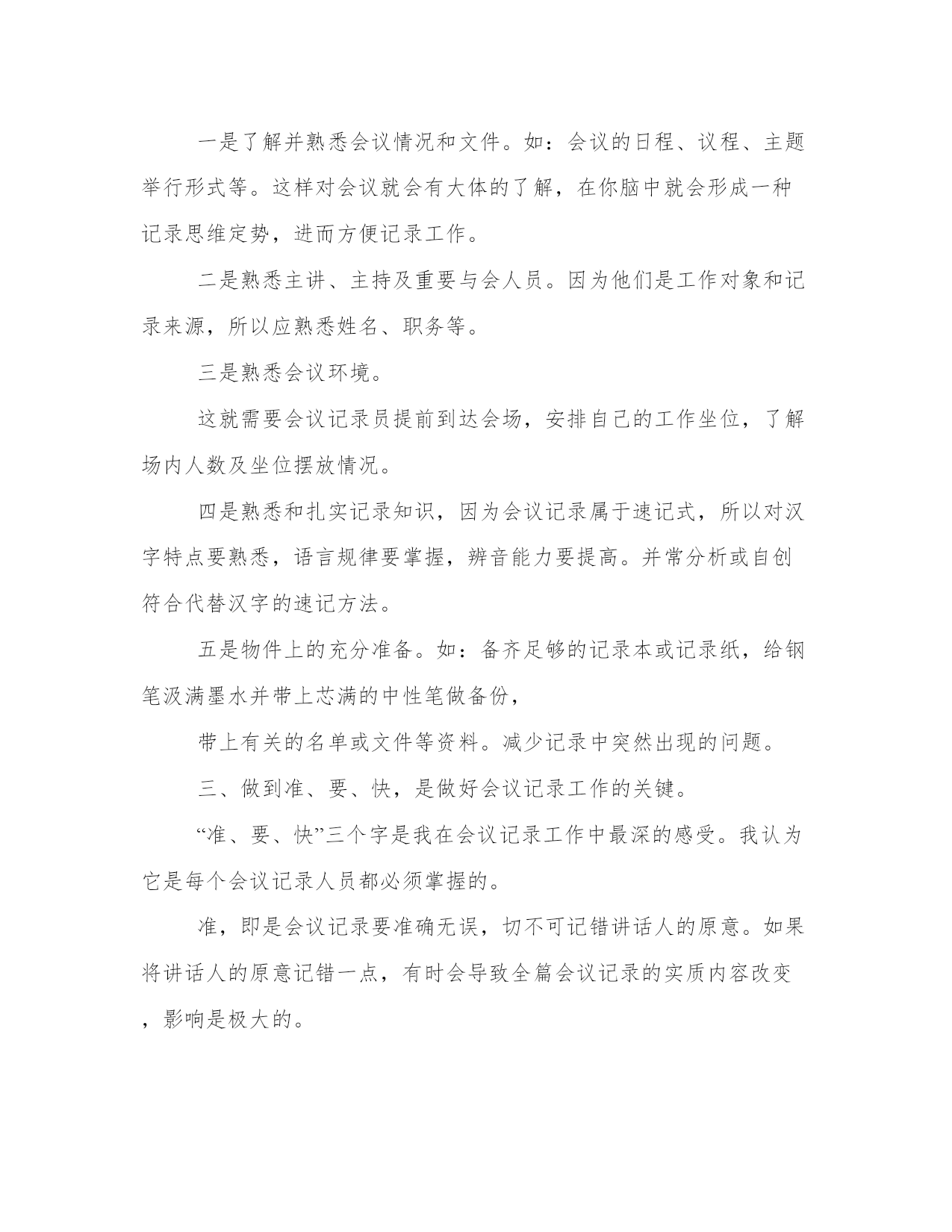 优选编写会议记录的体会工作文档我在专业认知实习期间,所做工作是会议记录,在为期一个月的工作当中,我对大型会议、中型会议、小型会议都进行过记录。在记录过程当中,我有以下三点体会:一、把自己融入会议环境,是做好会议记录的前提。一个会议记录员,要把一场会议记录好,是要有一颗融入的心态的。只有拥有一颗融入的心态,才能把自己与会场这个环境相叠,这样你才会喜欢这个环境。而也只有喜欢上,你的思想才会跟得上会议的节奏。只有跟得上会议的节奏,做会议记录时,你的精神才会高度集中,全神贯注,才能将耳、眼、脑、手并用。即用耳用心听取每个讲话人的声音,注意发言的线索和层次;用眼观察会场的各种动态、与会人员的表情、讲话人的手势和口型,帮助理解发言的内容;用脑思考讲话内容的取舍,琢磨发言的逻辑性用词,进行粗加工;用手把前三段落实到写,记录在会议本上。因此,会议记录员需要将自己融入会场,而不是会场融入你。二、搞好会前准备工作,是做好会议记录工作的基础。为了保证会议记录工作的顺利进行和完成,在会议记录前应当熟悉以下准备工作(以下都是我记录当中出现过的问题):一是了解并熟悉会议情况和文件。如:会议的日程、议程、主题举行形式等。这样对会议就会有大体的了解,在你脑中就会形成一种记录思维定势,进而方便记录工作。二是熟悉主讲、主持及重要与会人员。因为他们是工作对象和记录来源,所以应熟悉姓名、职务等。三是熟悉会议环境。这就需要会议记录员提前到达会场,安排自己的工作坐位,了解场内人数及坐位摆放情况。四是熟悉和扎实记录知识,因为会议记录属于速记式,所以对汉字特点要熟悉,语言规律要掌握,辨音能力要提高。并常分析或自创符合代替汉字的速记方法。五是物件上的充分准备。如:备齐足够的记录本或记录纸,给钢笔汲满墨水并带上芯满的中性笔做备份,带上有关的名单或文件等资料。减少记录中突然出现的问题。三、做到准、要、快,是做好会议记录工作的关键。“准、要、快”三个字是我在会议记录工作中最深的感受。我认为它是每个会议记录人员都必须掌握的。准,即是会议记录要准确无误,切不可记错讲话人的原意。如果将讲话人的原意记错一点,有时会导致全篇会议记录的实质内容改变,影响是极大的。要,即是会议记录要抓重点,避免丢掉讲话人重要的、基本的内容。如:基本观点、典型材料、关键词等。如果“要”丢了,则会议记录是一堆没有灵魂的垃圾。快,即是记录员要熟悉和掌握速记的一定方法和技能。这样脑才能快,只有脑快,手才能快。如果手不快,就将会漏掉许多有用的内容,则就会破坏会议记录的完整性。总之,会议记录工作是一项综合性的工作,它看似简单,但要把它做好做到位,是需要全方位的能力的。以上三点,是我在实习工作中得到的体会。希望能与同专业同学共同商榷、共同学习。
