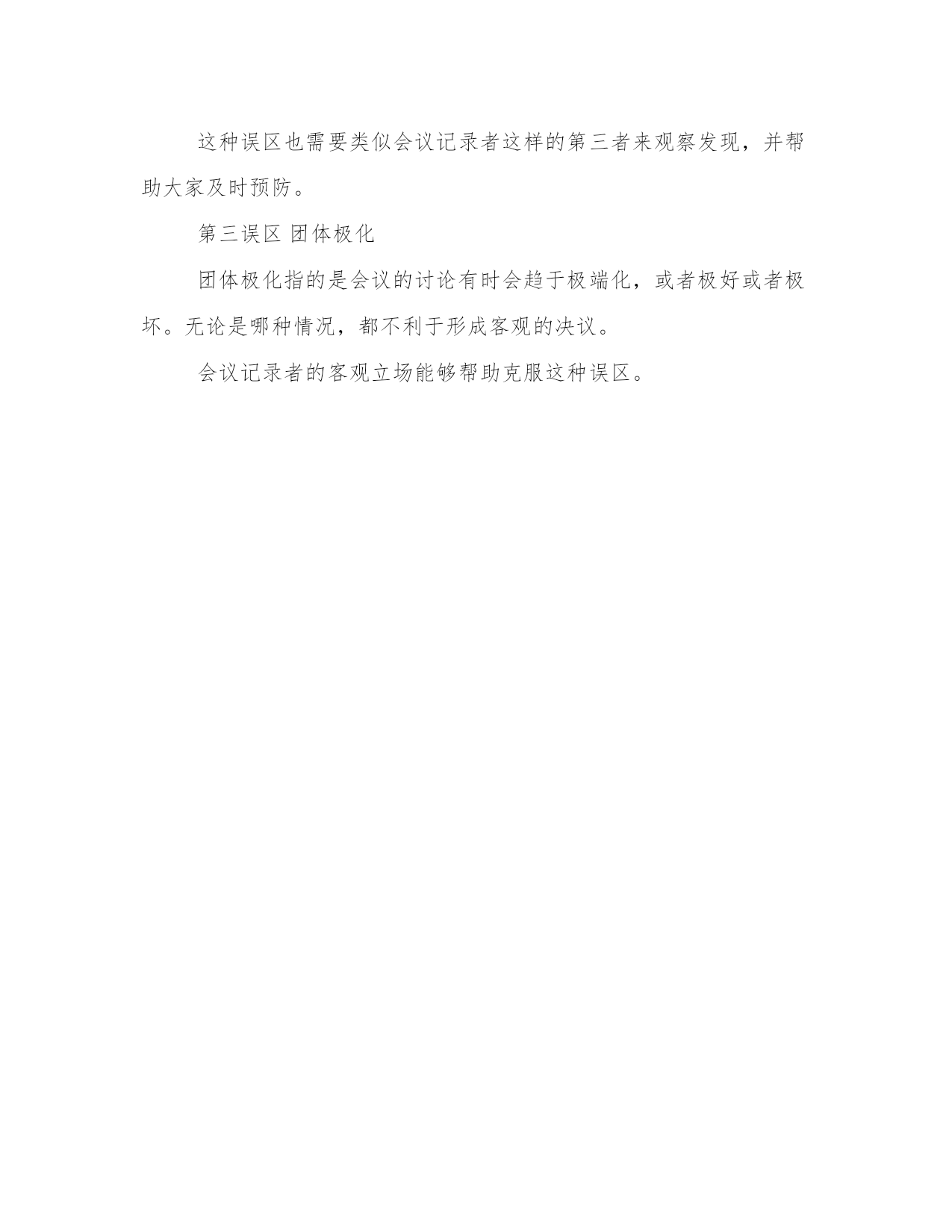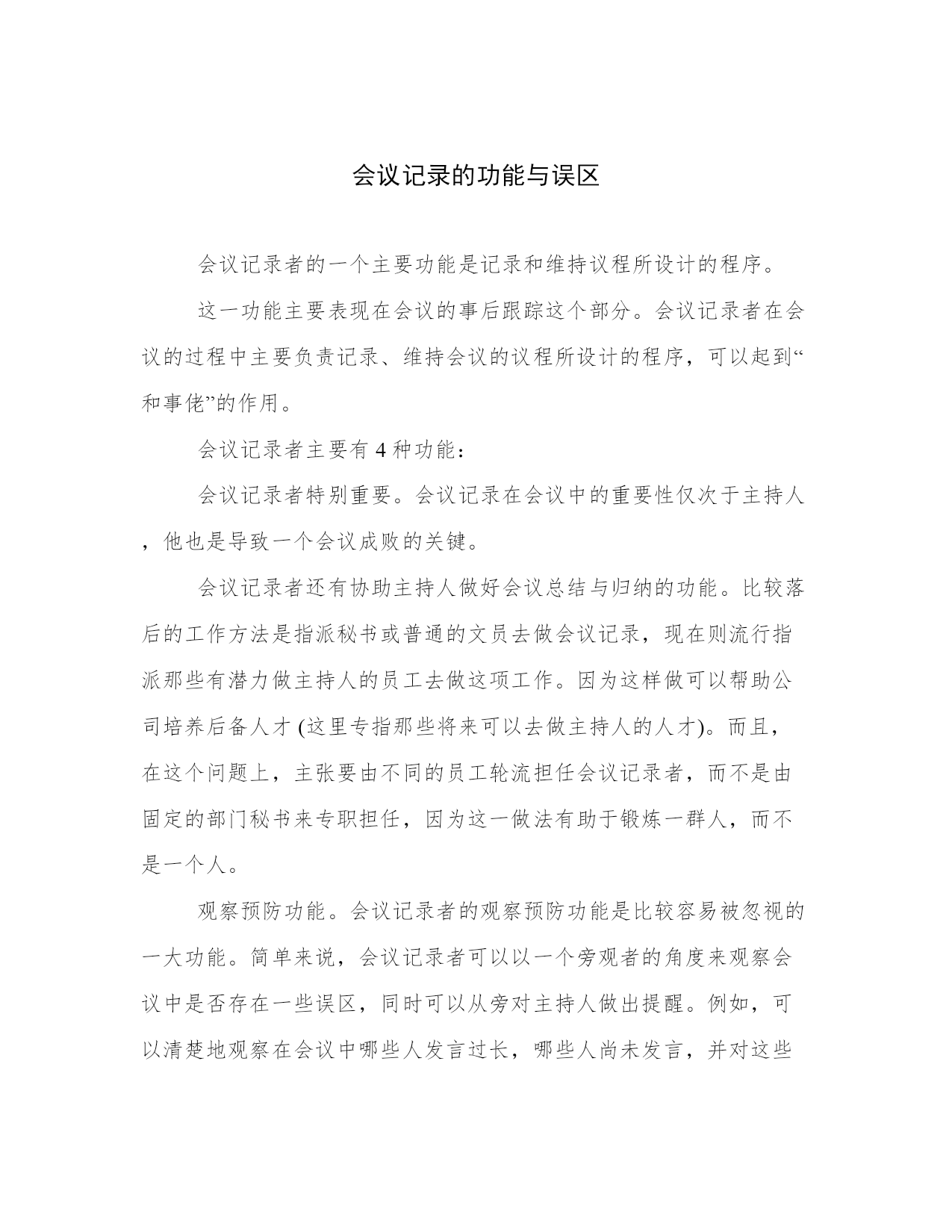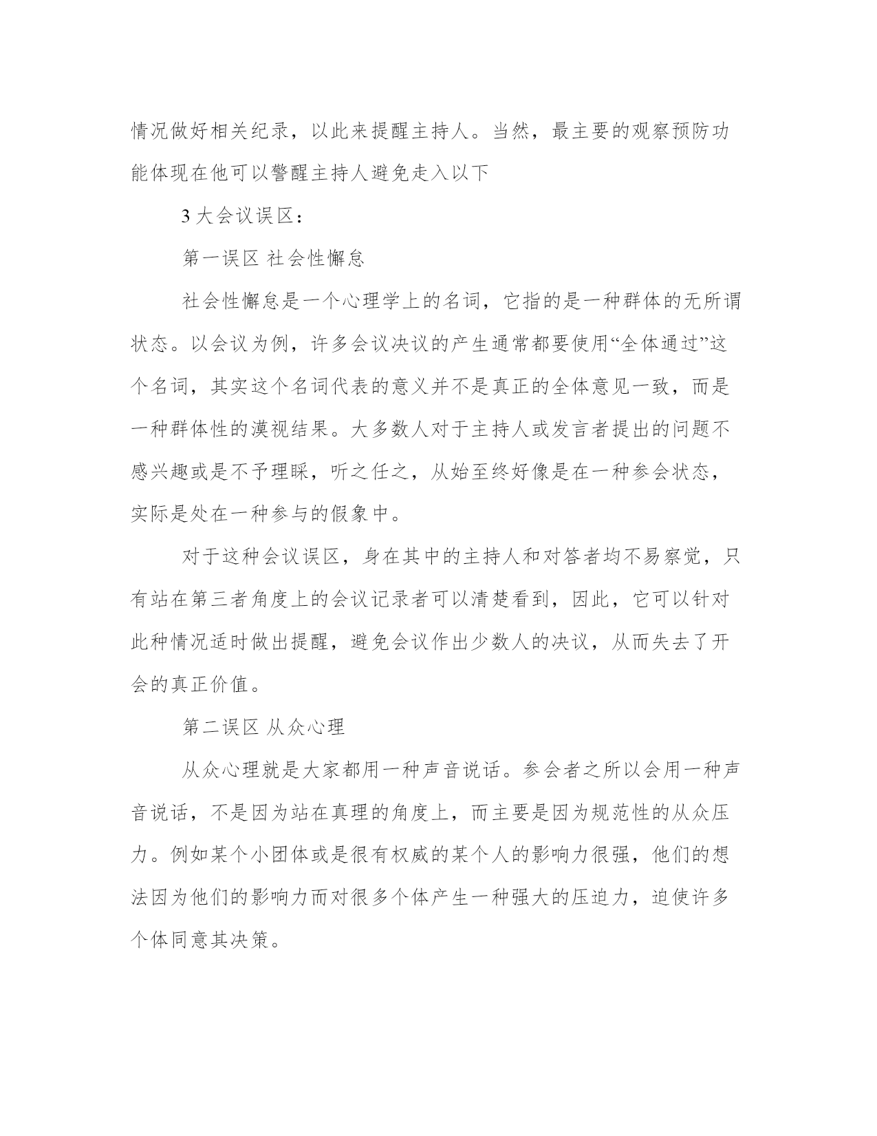 会议记录的功能与误区会议记录者的一个主要功能是记录和维持议程所设计的程序。这一功能主要表现在会议的事后跟踪这个部分。会议记录者在会议的过程中主要负责记录、维持会议的议程所设计的程序,可以起到“和事佬”的作用。会议记录者主要有4种功能:会议记录者特别重要。会议记录在会议中的重要性仅次于主持人,他也是导致一个会议成败的关键。会议记录者还有协助主持人做好会议总结与归纳的功能。比较落后的工作方法是指派秘书或普通的文员去做会议记录,现在则流行指派那些有潜力做主持人的员工去做这项工作。因为这样做可以帮助公司培养后备人才(这里专指那些将来可以去做主持人的人才)。而且,在这个问题上,主张要由不同的员工轮流担任会议记录者,而不是由固定的部门秘书来专职担任,因为这一做法有助于锻炼一群人,而不是一个人。观察预防功能。会议记录者的观察预防功能是比较容易被忽视的一大功能。简单来说,会议记录者可以以一个旁观者的角度来观察会议中是否存在一些误区,同时可以从旁对主持人做出提醒。例如,可以清楚地观察在会议中哪些人发言过长,哪些人尚未发言,并对这些情况做好相关纪录,以此来提醒主持人。当然,最主要的观察预防功能体现在他可以警醒主持人避免走入以下3大会议误区:第一误区社会性懈怠社会性懈怠是一个心理学上的名词,它指的是一种群体的无所谓状态。以会议为例,许多会议决议的产生通常都要使用“全体通过”这个名词,其实这个名词代表的意义并不是真正的全体意见一致,而是一种群体性的漠视结果。大多数人对于主持人或发言者提出的问题不感兴趣或是不予理睬,听之任之,从始至终好像是在一种参会状态,实际是处在一种参与的假象中。对于这种会议误区,身在其中的主持人和对答者均不易察觉,只有站在第三者角度上的会议记录者可以清楚看到,因此,它可以针对此种情况适时做出提醒,避免会议作出少数人的决议,从而失去了开会的真正价值。第二误区从众心理从众心理就是大家都用一种声音说话。参会者之所以会用一种声音说话,不是因为站在真理的角度上,而主要是因为规范性的从众压力。例如某个小团体或是很有权威的某个人的影响力很强,他们的想法因为他们的影响力而对很多个体产生一种强大的压迫力,迫使许多个体同意其决策。这种误区也需要类似会议记录者这样的第三者来观察发现,并帮助大家及时预防。第三误区团体极化团体极化指的是会议的讨论有时会趋于极端化,或者极好或者极坏。无论是哪种情况,都不利于形成客观的决议。会议记录者的客观立场能够帮助克服这种误区。