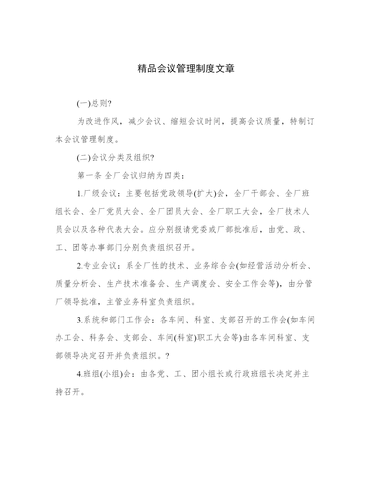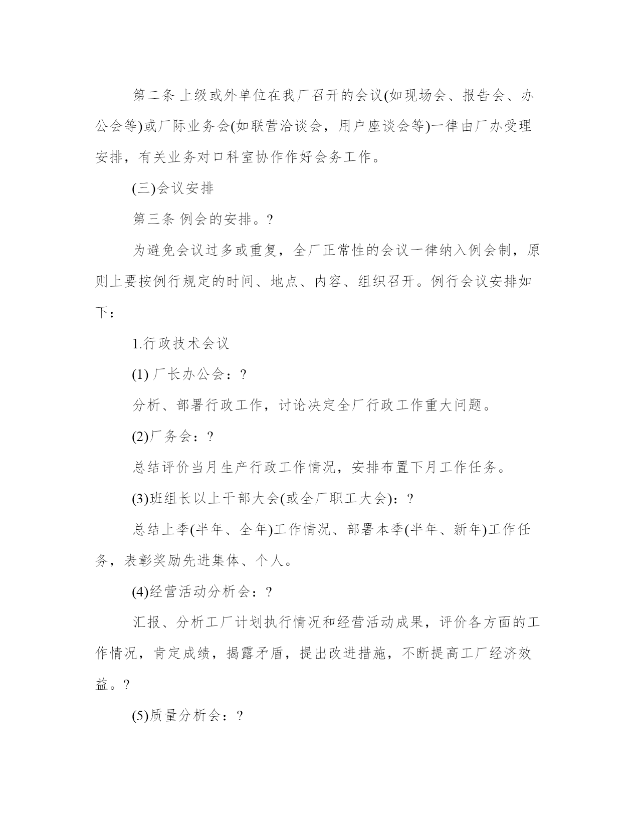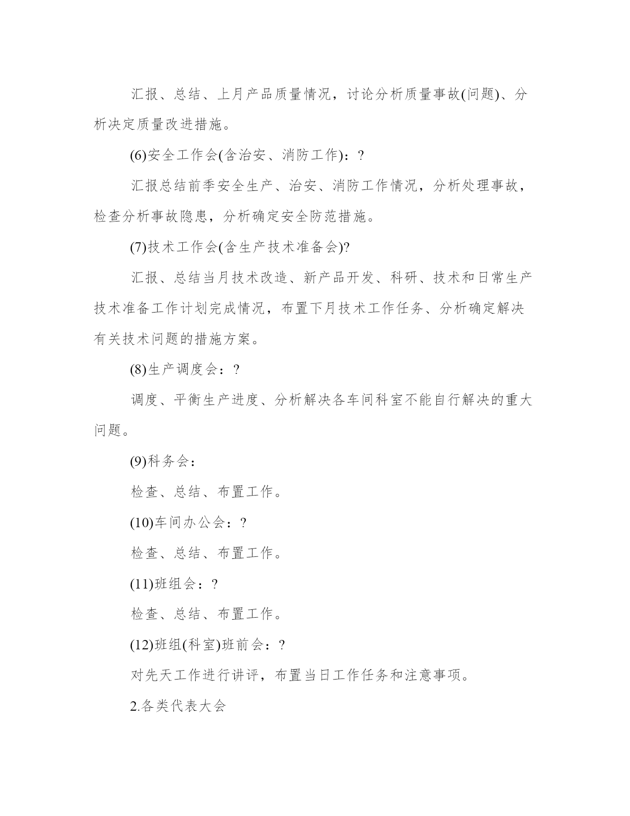 精品会议管理制度文章(一)总则?为改进作风,减少会议、缩短会议时间,提高会议质量,特制订本会议管理制度。(二)会议分类及组织?第一条全厂会议归纳为四类:1.厂级会议:主要包括党政领导(扩大)会,全厂干部会、全厂班组长会、全厂党员大会、全厂团员大会、全厂职工大会,全厂技术人员会以及各种代表大会。应分别报请党委或厂部批准后,由党、政、工、团等办事部门分别负责组织召开。2.专业会议:系全厂性的技术、业务综合会(如经营活动分析会、质量分析会、生产技术准备会、生产调度会、安全工作会等),由分管厂领导批准,主管业务科室负责组织。3.系统和部门工作会:各车间、科室、支部召开的工作会(如车间办工会、科务会、支部会、车间(科室)职工大会等)由各车间科室、支部领导决定召开并负责组织。?4.班组(小组)会:由各党、工、团小组长或行政班组长决定并主持召开。第二条上级或外单位在我厂召开的会议(如现场会、报告会、办公会等)或厂际业务会(如联营洽谈会,用户座谈会等)一律由厂办受理安排,有关业务对口科室协作作好会务工作。(三)会议安排第三条例会的安排。?为避免会议过多或重复,全厂正常性的会议一律纳入例会制,原则上要按例行规定的时间、地点、内容、组织召开。例行会议安排如下:1.行政技术会议(1)厂长办公会:?分析、部署行政工作,讨论决定全厂行政工作重大问题。(2)厂务会:?总结评价当月生产行政工作情况,安排布置下月工作任务。(3)班组长以上干部大会(或全厂职工大会):?总结上季(半年、全年)工作情况、部署本季(半年、新年)工作任务,表彰奖励先进集体、个人。(4)经营活动分析会:?汇报、分析工厂计划执行情况和经营活动成果,评价各方面的工作情况,肯定成绩,揭露矛盾,提出改进措施,不断提高工厂经济效益。?(5)质量分析会:?汇报、总结、上月产品质量情况,讨论分析质量事故(问题)、分析决定质量改进措施。(6)安全工作会(含治安、消防工作):?汇报总结前季安全生产、治安、消防工作情况,分析处理事故,检查分析事故隐患,分析确定安全防范措施。(7)技术工作会(含生产技术准备会)?汇报、总结当月技术改造、新产品开发、科研、技术和日常生产技术准备工作计划完成情况,布置下月技术工作任务、分析确定解决有关技术问题的措施方案。(8)生产调度会:?调度、平衡生产进度、分析解决各车间科室不能自行解决的重大问题。(9)科务会:检查、总结、布置工作。(10)车间办公会:?检查、总结、布置工作。(11)班组会:?检查、总结、布置工作。(12)班组(科室)班前会:?对先天工作进行讲评,布置当日工作任务和注意事项。2.各类代表大会(1)职工代表大会:?(2)车间(部门)职工大会(或职工代表小组会):?(3)党员代表大会:?(4)团员代表大会:?(5)科协会员代表大会:?(6)企协会员代表大会:3.民主管理会议?(1)工厂管理委员会:?(2)厂长、党委书记、工会主席联席会:?(3)生产管理委员会:?(4)生活福利委员会:4.论文、成果发布会。?(1)科协年会:?(2)企协年会:?(3)政治思想政治工作分析会年会:?(4)厂qc成果发布会:?