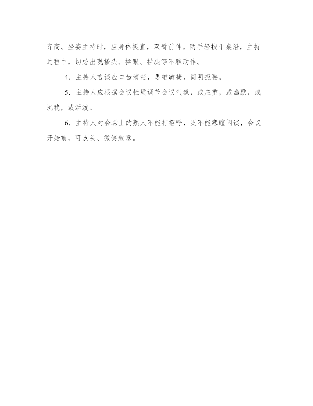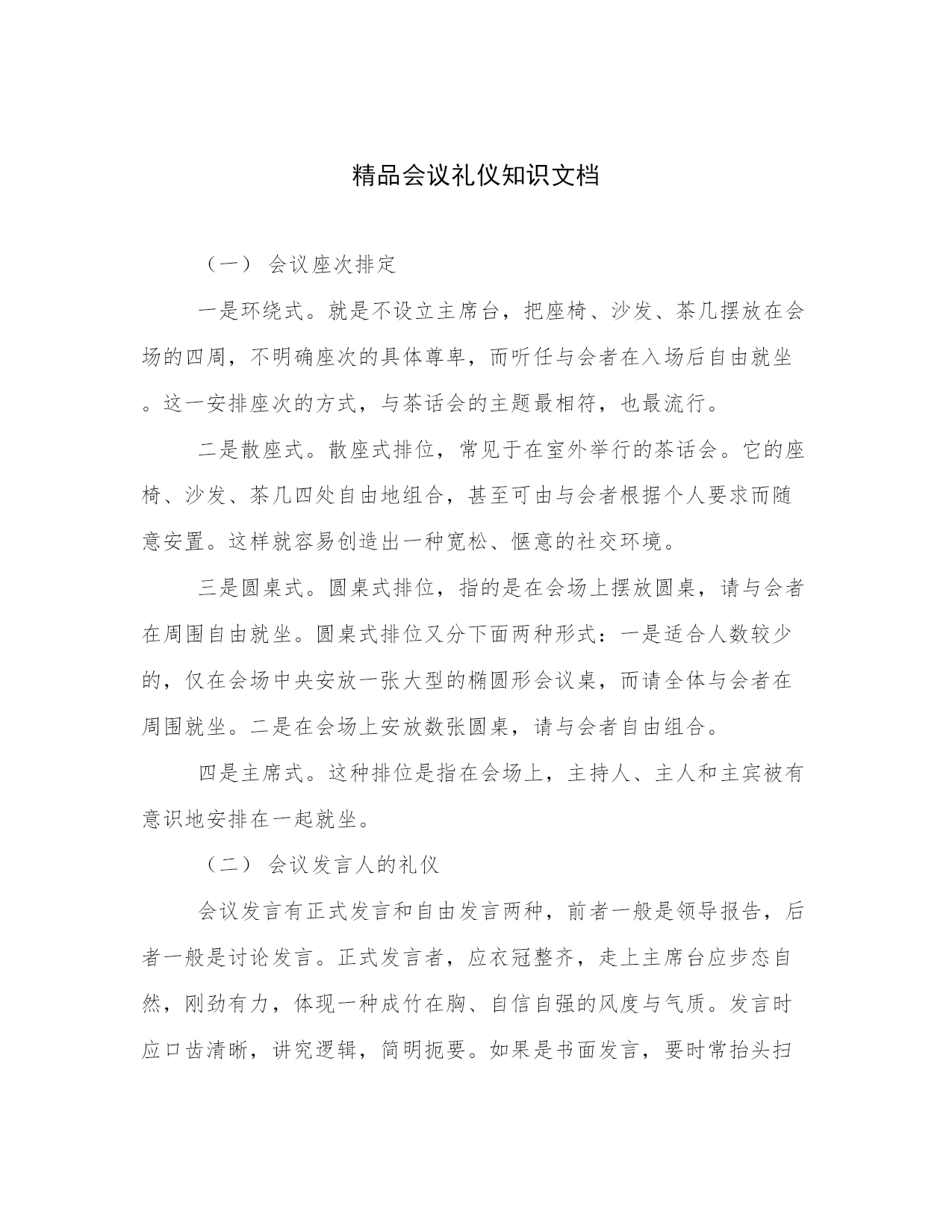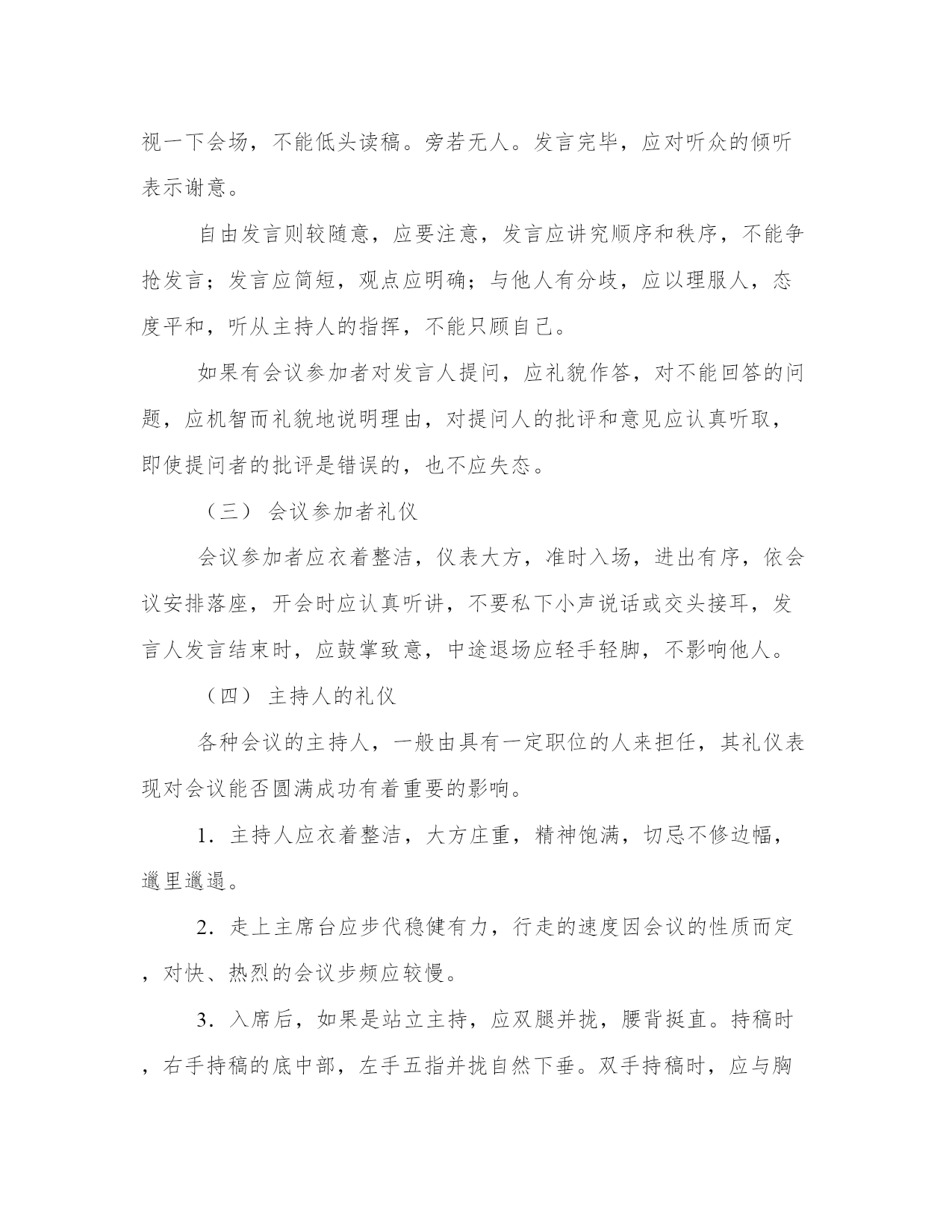 精品会议礼仪知识文档(一)会议座次排定一是环绕式。就是不设立主席台,把座椅、沙发、茶几摆放在会场的四周,不明确座次的具体尊卑,而听任与会者在入场后自由就坐。这一安排座次的方式,与茶话会的主题最相符,也最流行。二是散座式。散座式排位,常见于在室外举行的茶话会。它的座椅、沙发、茶几四处自由地组合,甚至可由与会者根据个人要求而随意安置。这样就容易创造出一种宽松、惬意的社交环境。三是圆桌式。圆桌式排位,指的是在会场上摆放圆桌,请与会者在周围自由就坐。圆桌式排位又分下面两种形式:一是适合人数较少的,仅在会场中央安放一张大型的椭圆形会议桌,而请全体与会者在周围就坐。二是在会场上安放数张圆桌,请与会者自由组合。四是主席式。这种排位是指在会场上,主持人、主人和主宾被有意识地安排在一起就坐。(二)会议发言人的礼仪会议发言有正式发言和自由发言两种,前者一般是领导报告,后者一般是讨论发言。正式发言者,应衣冠整齐,走上主席台应步态自然,刚劲有力,体现一种成竹在胸、自信自强的风度与气质。发言时应口齿清晰,讲究逻辑,简明扼要。如果是书面发言,要时常抬头扫视一下会场,不能低头读稿。旁若无人。发言完毕,应对听众的倾听表示谢意。自由发言则较随意,应要注意,发言应讲究顺序和秩序,不能争抢发言;发言应简短,观点应明确;与他人有分歧,应以理服人,态度平和,听从主持人的指挥,不能只顾自己。如果有会议参加者对发言人提问,应礼貌作答,对不能回答的问题,应机智而礼貌地说明理由,对提问人的批评和意见应认真听取,即使提问者的批评是错误的,也不应失态。(三)会议参加者礼仪会议参加者应衣着整洁,仪表大方,准时入场,进出有序,依会议安排落座,开会时应认真听讲,不要私下小声说话或交头接耳,发言人发言结束时,应鼓掌致意,中途退场应轻手轻脚,不影响他人。(四)主持人的礼仪各种会议的主持人,一般由具有一定职位的人来担任,其礼仪表现对会议能否圆满成功有着重要的影响。1.主持人应衣着整洁,大方庄重,精神饱满,切忌不修边幅,邋里邋遢。2.走上主席台应步代稳健有力,行走的速度因会议的性质而定,对快、热烈的会议步频应较慢。3.入席后,如果是站立主持,应双腿并拢,腰背挺直。持稿时,右手持稿的底中部,左手五指并拢自然下垂。双手持稿时,应与胸齐高。坐姿主持时,应身体挺直,双臂前伸。两手轻按于桌沿,主持过程中,切忌出现搔头、揉眼、拦腿等不雅动作。4.主持人言谈应口齿清楚,思维敏捷,简明扼要。5.主持人应根据会议性质调节会议气氛,或庄重,或幽默,或沉稳,或活泼。6.主持人对会场上的熟人不能打招呼,更不能寒暄闲谈,会议开始前,可点头、微笑致意。