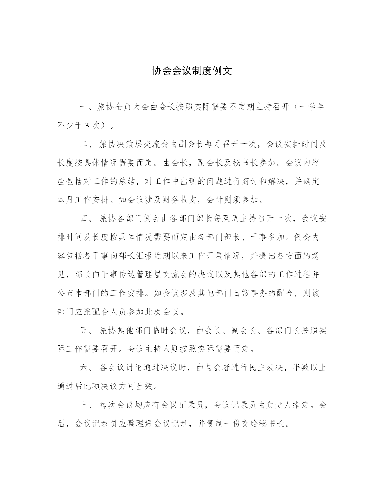 协会会议制度例文一、旅协全员大会由会长按照实际需要不定期主持召开(一学年不少于3次)。二、旅协决策层交流会由副会长每月召开一次,会议安排时间及长度按具体情况需要而定。由会长,副会长及秘书长参加。会议内容应包括对工作的总结,对工作中出现的问题进行商讨和解决,并确定本月工作安排。如会议涉及财务收支,会计则须参加。四、旅协各部门例会由各部门部长每双周主持召开一次,会议安排时间及长度按具体情况需要而定由各部门部长、干事参加。例会内容包括各干事向部长汇报近期以来工作开展情况,并提出各方面的意见,部长向干事传达管理层交流会的决议以及其他各部的工作进程并公布本部门的工作安排。如会议涉及其他部门日常事务的配合,则该部门应派配合人员参加此次会议。五、旅协其他部门临时会议,由会长、副会长、各部门长按照实际工作需要召开。会议主持人则按照实际需要而定。六、各会议讨论通过决议时,由与会者进行民主表决,半数以上通过后此项决议方可生效。七、每次会议均应有会议记录员,会议记录员由负责人指定。会后,会议记录员应整理好会议记录,并复制一份交给秘书长。八、旅协各种会议均应按照本会议制度执行,如有违反,将提交旅协理事会会议严肃处理。
