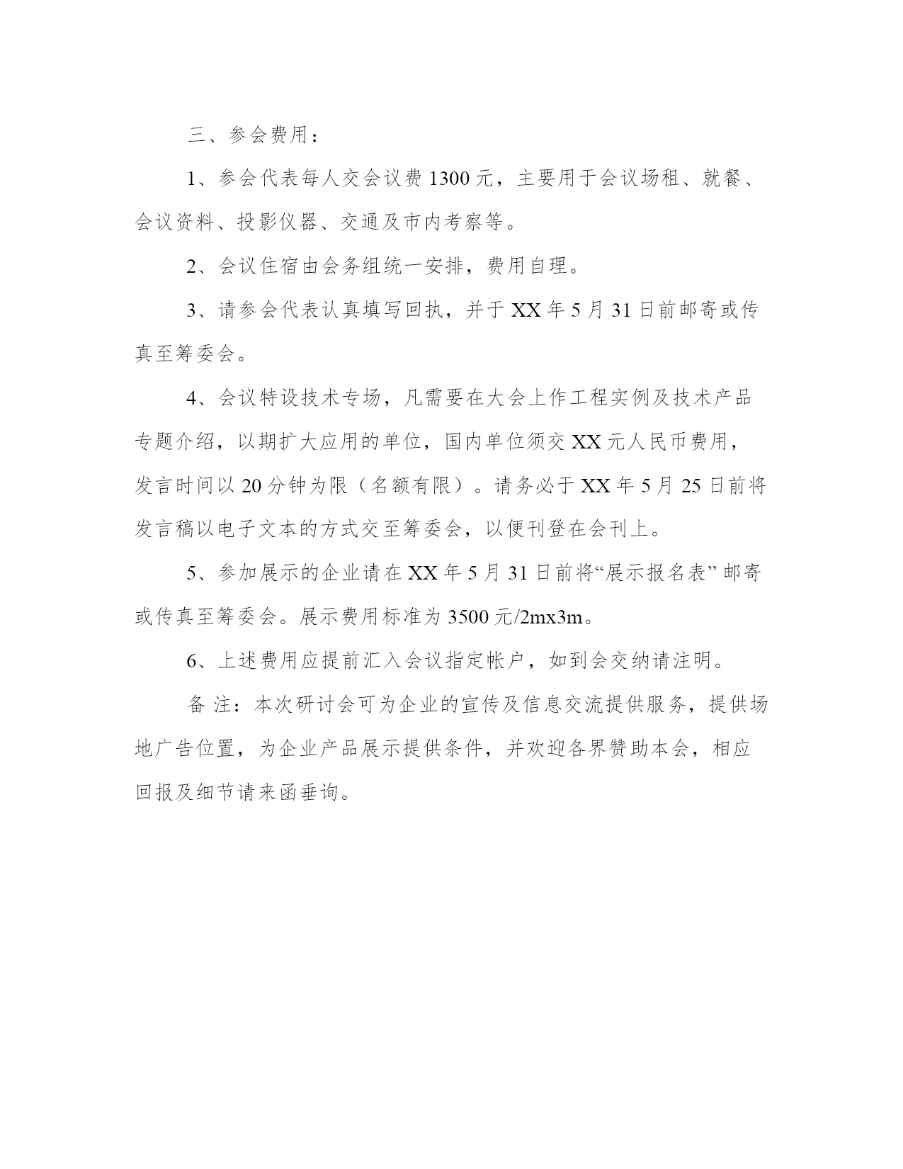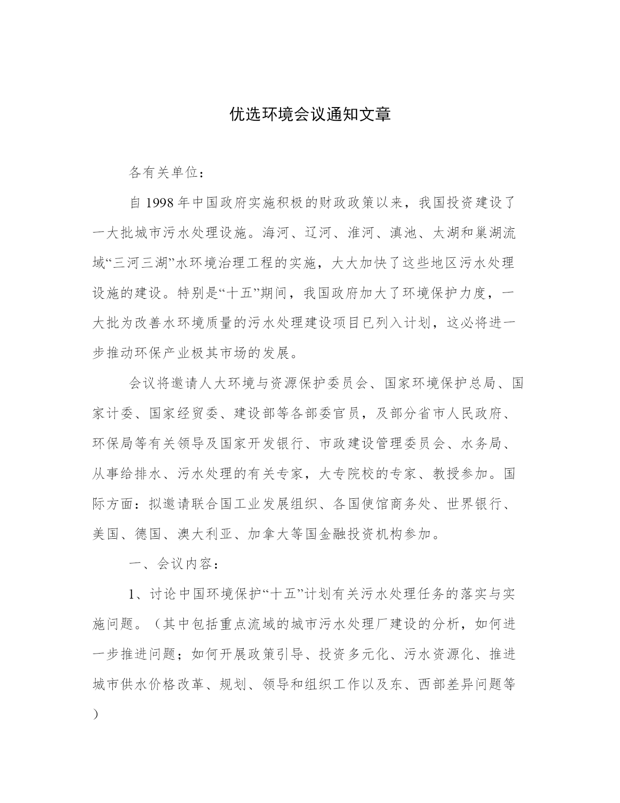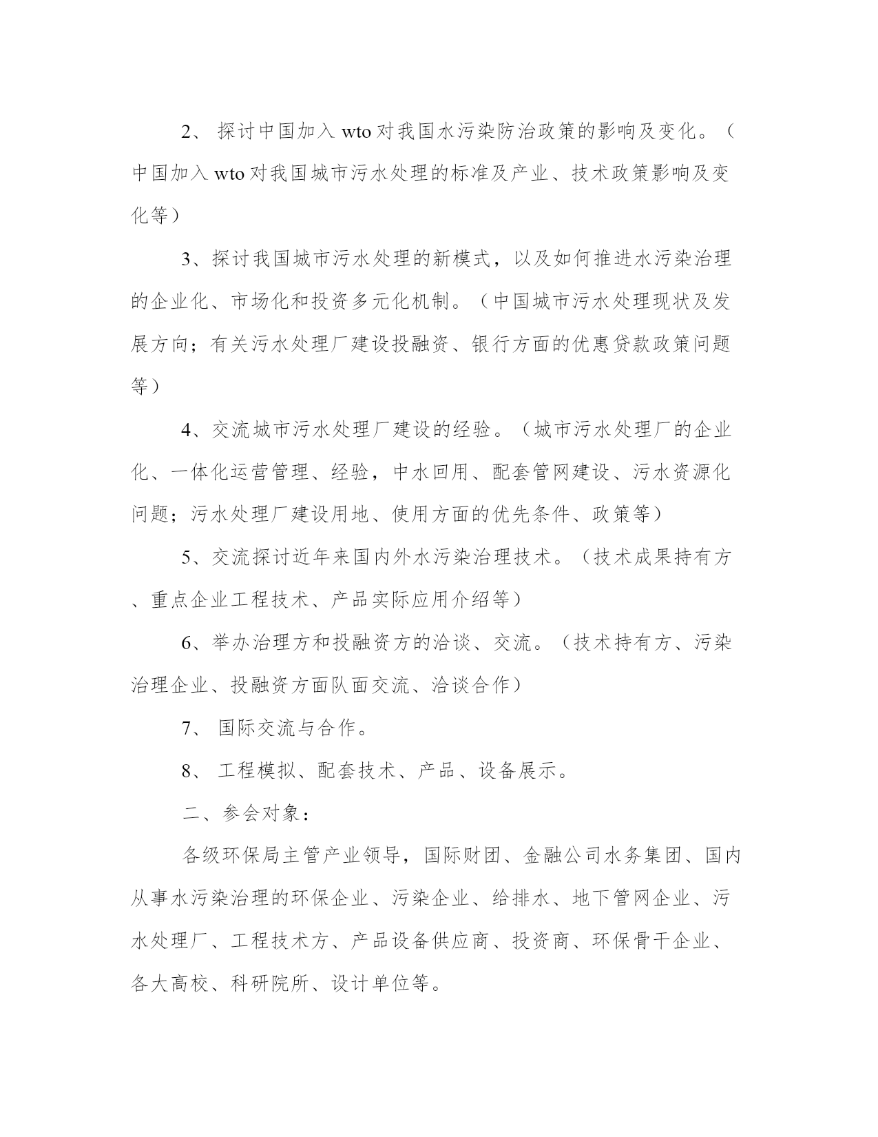 优选环境会议通知文章各有关单位:自1998年中国政府实施积极的财政政策以来,我国投资建设了一大批城市污水处理设施。海河、辽河、淮河、滇池、太湖和巢湖流域“三河三湖”水环境治理工程的实施,大大加快了这些地区污水处理设施的建设。特别是“十五”期间,我国政府加大了环境保护力度,一大批为改善水环境质量的污水处理建设项目已列入计划,这必将进一步推动环保产业极其市场的发展。会议将邀请人大环境与资源保护委员会、国家环境保护总局、国家计委、国家经贸委、建设部等各部委官员,及部分省市人民政府、环保局等有关领导及国家开发银行、市政建设管理委员会、水务局、从事给排水、污水处理的有关专家,大专院校的专家、教授参加。国际方面:拟邀请联合国工业发展组织、各国使馆商务处、世界银行、美国、德国、澳大利亚、加拿大等国金融投资机构参加。一、会议内容:1、讨论中国环境保护“十五”计划有关污水处理任务的落实与实施问题。(其中包括重点流域的城市污水处理厂建设的分析,如何进一步推进问题;如何开展政策引导、投资多元化、污水资源化、推进城市供水价格改革、规划、领导和组织工作以及东、西部差异问题等)2、探讨中国加入wto对我国水污染防治政策的影响及变化。(中国加入wto对我国城市污水处理的标准及产业、技术政策影响及变化等)3、探讨我国城市污水处理的新模式,以及如何推进水污染治理的企业化、市场化和投资多元化机制。(中国城市污水处理现状及发展方向;有关污水处理厂建设投融资、银行方面的优惠贷款政策问题等)4、交流城市污水处理厂建设的经验。(城市污水处理厂的企业化、一体化运营管理、经验,中水回用、配套管网建设、污水资源化问题;污水处理厂建设用地、使用方面的优先条件、政策等)5、交流探讨近年来国内外水污染治理技术。(技术成果持有方、重点企业工程技术、产品实际应用介绍等)6、举办治理方和投融资方的洽谈、交流。(技术持有方、污染治理企业、投融资方面队面交流、洽谈合作)7、国际交流与合作。8、工程模拟、配套技术、产品、设备展示。二、参会对象:各级环保局主管产业领导,国际财团、金融公司水务集团、国内从事水污染治理的环保企业、污染企业、给排水、地下管网企业、污水处理厂、工程技术方、产品设备供应商、投资商、环保骨干企业、各大高校、科研院所、设计单位等。三、参会费用:1、参会代表每人交会议费1300元,主要用于会议场租、就餐、会议资料、投影仪器、交通及市内考察等。2、会议住宿由会务组统一安排,费用自理。3、请参会代表认真填写回执,并于XX年5月31日前邮寄或传真至筹委会。4、会议特设技术专场,凡需要在大会上作工程实例及技术产品专题介绍,以期扩大应用的单位,国内单位须交XX元人民币费用,发言时间以20分钟为限(名额有限)。请务必于XX年5月25日前将发言稿以电子文本的方式交至筹委会,以便刊登在会刊上。5、参加展示的企业请在XX年5月31日前将“展示报名表”邮寄或传真至筹委会。展示费用标准为3500元/2mx3m。6、上述费用应提前汇入会议指定帐户,如到会交纳请注明。备注:本次研讨会可为企业的宣传及信息交流提供服务,提供场地广告位置,为企业产品展示提供条件,并欢迎各界赞助本会,相应回报及细节请来函垂询。
