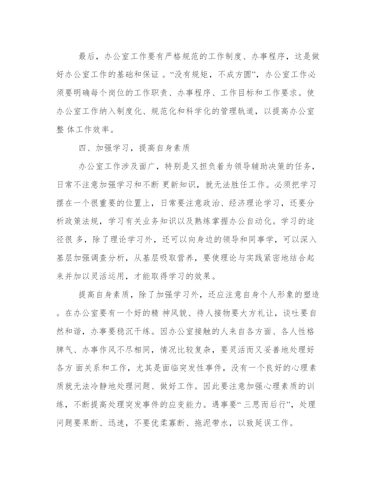 如何做好办公室工作工作文档随着社会的变革和市场经济发展,办公室工作的地位和作用日显重要,任务日益加重,要求越来越高,决不是仅仅限于文件转转发发,来人接待接待等此类琐碎工作了。下面就如何充分发挥办公室职能作用并不断扩大服务内涵和提高服务质量等谈一点自己的粗浅认识。一、解放思想、大胆创新社会在发展,历史在进步,人保公司也处于前所未有的历史变革时期,办公室工作人员必须搭准历史发展的脉搏,跟上历史发展的脚步,合上历史发展的节律。为此,就要解放思想、转变观念、大胆创新。日常工作中要敢于打破旧框框,革除陈规陋习,面对新情况、新问题,要勇于思考,敢于探索,大胆地推进工作创新。如:公文运转如何做到急事急办、特事特办?如何改进接待工作,如何适应业务发展加大宣传工作力度等等。有了超前的意识、大胆创新精神和灵活多变的手段,就能使办公室工作有声有色、富有成效。二、要热爱办公室工作,甘当人民的勤务员从大的方面讲,办公室位置很重要,也是领导的左膀右臂,公司的内管家。但是,办公室的工作头绪多、婆婆多,服务对象多,方方面面应酬也多。事情多而杂,而且哪一方面做得稍有不周,不是上级不满意,就是员工有意见。好比是老牛进磨坊,一年忙到头还出力不讨好,因而不少人都不愿意从事此项工作。话说回头,办公室工作难干总得有人干,既然从事了这项工作,就要安下心来并全身心地投入。办公室工作也是锻炼人的地方,办公室人员可以从领导身上吸取到很多营养(如:领导的决策能力、工作作风等),可以在工作实践中培养提高组织协调能力、公关技巧、综合分析判断能力以及文字综合能力等。可以说,能全面提升自身素质。因此要珍惜岗位、把握契机、使我们的全部聪明才智得以充分发挥。三、转变工作作风、改进工作方法办公室的工作千头万绪,每一项工作都与全局有着密切的联系。要做好办公室工作,首先要理清思路,抓大事,抓工作中的主要矛盾,分清轻重缓急、统筹兼顾、合理安排,才能做到忙而不乱、紧张有序。同时,要善于思考,不断摸索工作规律,防止埋于事务堆中。其次,要有强烈的事业心和责任感,增强工作时效性。工作要脚踏实地真抓实干,力戒浮夸。尤其是在遇到工作任务较多的情况下,一定要冷静思考、分清轻重缓急,一件一件落实并排出时间表。汇报工作要敢于讲真话、报实情,不能报喜不报忧,投其所好。另外,特别注意的是办公室工作要以事业为重,不能过多地掺杂个人感情、凭个人意志办事,做到对待上级与下级一样,对待领导与一般员工一个样。为职工办实事、办好事,杜绝“门难进、脸难看、话难听、事难办”的衙门作风。更不能利用手中权利谋私利。要堂堂正正做人、清清白白做官、踏踏实实做事。最后,办公室工作要有严格规范的工作制度、办事程序,这是做好办公室工作的基础和保证。“没有规矩,不成方圆”,办公室工作必须要明确每个岗位的工作职责、办事程序、工作目标和工作要求。使办公室工作纳入制度化、规范化和科学化的管理轨道,以提高办公室整体工作效率。四、加强学习,提高自身素质办公室工作涉及面广,特别是又担负着为领导辅助决策的任务,日常不注意加强学习和不断更新知识,就无法胜任工作。必须把学习摆在一个很重要的位置上,日常要注意政治、经济理论学习,还要分析政策法规,学习有关业务知识以及熟练掌握办公自动化。学习的途径很多,除了理论学习外,还可以向身边的领导和同事学,可以深入基层加强调查分析,从基层吸取营养,要使理论与实践紧密地结合起来并加以灵活运用,才能取得学习的效果。提高自身素质,除了加强学习外,还应注意自身个人形象的塑造。在办公室要有一个好的精神风貌、待人接物要大方礼让,谈吐要自然和谐,办事要稳沉干练。因办公室接触的人来自各方面、各人性格脾气、办事作风不尽相同,情况比较复杂,要灵活而又妥善地处理好各方面关系和工作,尤其是面临突发性事件,没有一个良好的心理素质就无法冷静地处理问题、做好工作。因此要注意加强心理素质的训练,不断提高处理突发事件的应变能力。遇事要“三思而后行”,处理问题要果断、迅速,不要优柔寡断、拖泥带水,以致延误工作。以上几点仅属个人在办公室工作实践中几点体会,但要使办公室工作做得扎扎实实并富有成效,还必须在工作中不断开拓创新、总结和提高。