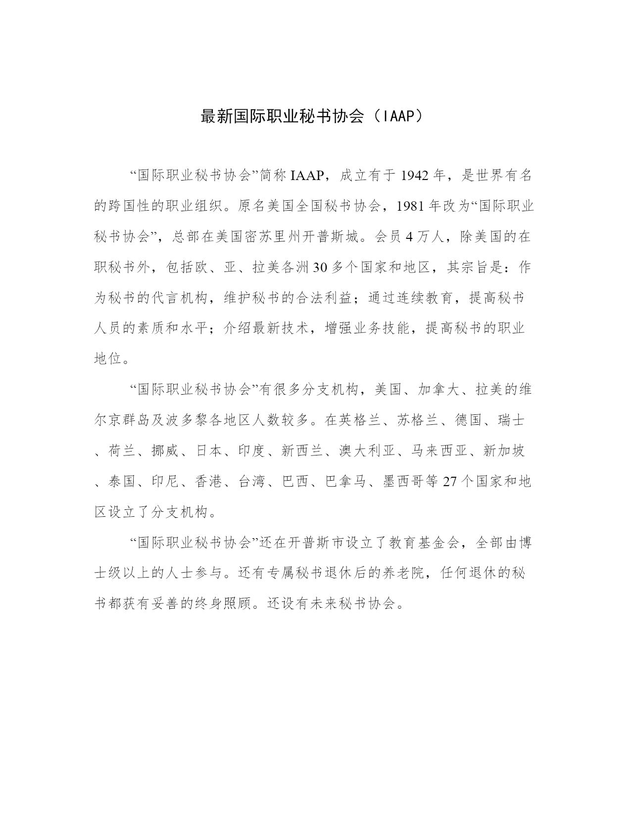 最新国际职业秘书协会(IAAP)“国际职业秘书协会”简称IAAP,成立有于1942年,是世界有名的跨国性的职业组织。原名美国全国秘书协会,1981年改为“国际职业秘书协会”,总部在美国密苏里州开普斯城。会员4万人,除美国的在职秘书外,包括欧、亚、拉美各洲30多个国家和地区,其宗旨是:作为秘书的代言机构,维护秘书的合法利益;通过连续教育,提高秘书人员的素质和水平;介绍最新技术,增强业务技能,提高秘书的职业地位。“国际职业秘书协会”有很多分支机构,美国、加拿大、拉美的维尔京群岛及波多黎各地区人数较多。在英格兰、苏格兰、德国、瑞士、荷兰、挪威、日本、印度、新西兰、澳大利亚、马来西亚、新加坡、泰国、印尼、香港、台湾、巴西、巴拿马、墨西哥等27个国家和地区设立了分支机构。“国际职业秘书协会”还在开普斯市设立了教育基金会,全部由博士级以上的人士参与。还有专属秘书退休后的养老院,任何退休的秘书都获有妥善的终身照顾。还设有未来秘书协会。