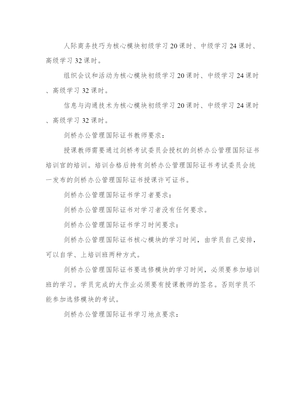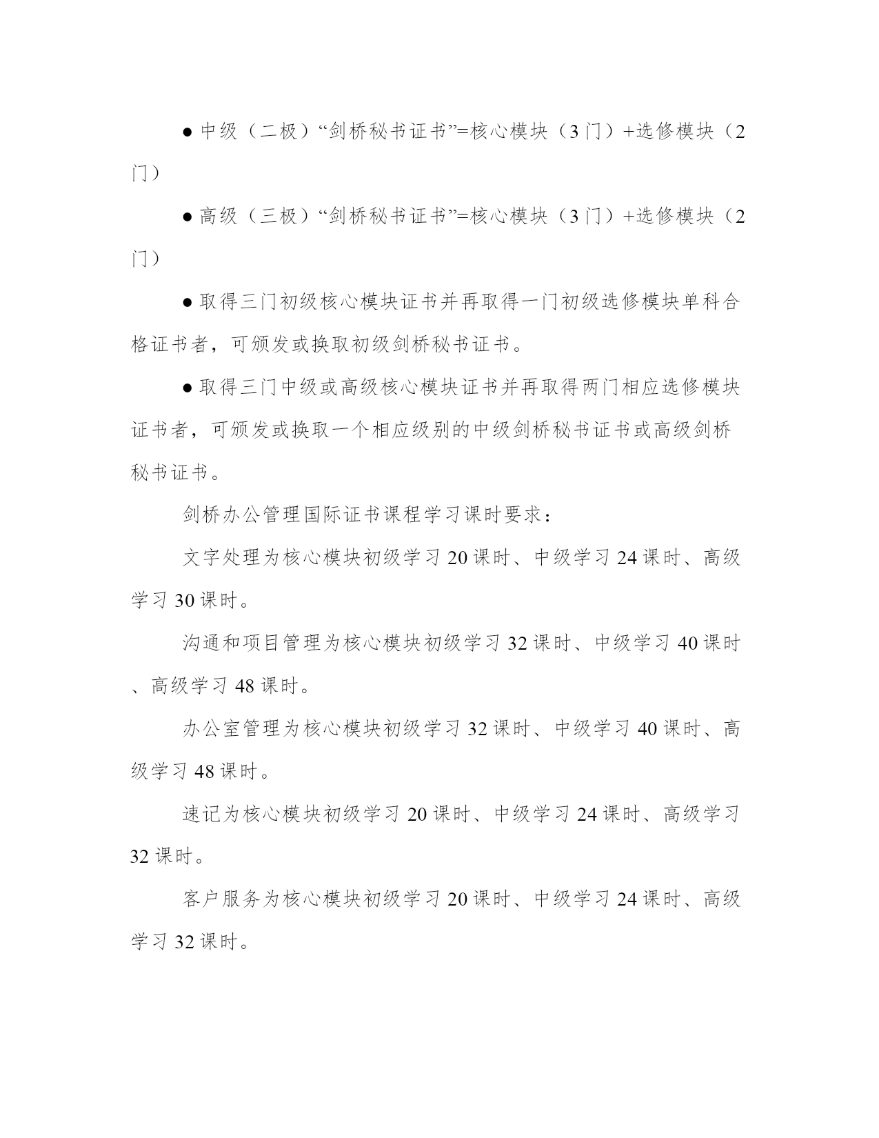 优选剑桥秘书证如何学习剑桥办公管理国际证书课程设置:办公室管理、沟通和项目管理、文字处理、人际商务技巧、客户服务、组织会议和活动、速记、信息与沟通技术,该教材由教育考试中心中英教育测量学术交流中心组编,共八本书。剑桥办公管理国际证书教材介绍:采用章节与知识模块相结合的形式,注重细节,主要以情景分析、讨论为主,以必要的教学参观和考察为辅。特别是要求大作业的课程,每项任务必须是经过考生亲身去做的,对过程的严谨性、真实性要求的非常强。学生在完成大作业的过程中,就是经历了实际工作的模式。所有授课教师必须全程跟踪提供帮助。剑桥办公管理国际证书课程学习:核心模块证书:完成文字处理、沟通和项目管理、办公室管理三门核心模块并通过相应级别的考生,颁发核心模块证书。选修模块证书:完成速记、客户服务、人际商务技巧、组织会议和活动、信息与沟通技术其中一门单科选修模块并通过相应级别的考生,颁发单科选修模块成证书。各级别证书要求:●初级(一级)“剑桥秘书证书”=核心模块(3门)+选修模块(1门)●中级(二极)“剑桥秘书证书”=核心模块(3门)+选修模块(2门)●高级(三极)“剑桥秘书证书”=核心模块(3门)+选修模块(2门)●取得三门初级核心模块证书并再取得一门初级选修模块单科合格证书者,可颁发或换取初级剑桥秘书证书。●取得三门中级或高级核心模块证书并再取得两门相应选修模块证书者,可颁发或换取一个相应级别的中级剑桥秘书证书或高级剑桥秘书证书。剑桥办公管理国际证书课程学习课时要求:文字处理为核心模块初级学习20课时、中级学习24课时、高级学习30课时。沟通和项目管理为核心模块初级学习32课时、中级学习40课时、高级学习48课时。办公室管理为核心模块初级学习32课时、中级学习40课时、高级学习48课时。速记为核心模块初级学习20课时、中级学习24课时、高级学习32课时。客户服务为核心模块初级学习20课时、中级学习24课时、高级学习32课时。人际商务技巧为核心模块初级学习20课时、中级学习24课时、高级学习32课时。组织会议和活动为核心模块初级学习20课时、中级学习24课时、高级学习32课时。信息与沟通技术为核心模块初级学习20课时、中级学习24课时、高级学习32课时。剑桥办公管理国际证书教师要求:授课教师需要通过剑桥考试委员会授权的剑桥办公管理国际证书培训官的培训。培训合格后持有剑桥办公管理国际证书考试委员会统一发布的剑桥办公管理国际证书授课许可证书。剑桥办公管理国际证书学习者要求:剑桥办公管理国际证书对学习者没有任何要求。剑桥办公管理国际证书学习时间要求:剑桥办公管理国际证书核心模块的学习时间,由学员自己安排,可以自学、上培训班两种方式。剑桥办公管理国际证书要选修模块的学习时间,必须要参加培训班的学习。学员完成的大作业必须要有授课教师的签名。否则学员不能参加选修模块的考试。剑桥办公管理国际证书学习地点要求:全国各地的学员可以选择在当地学习,也可以选择在其他地方学习。学员选择的学习地点必须是教育部考试中心中英教育测量交流中心授权的培训单位。剑桥办公管理国际证书学习费用要求:教育部考试中心中英教育测量交流中心授权的培训单位,自己决定培训费用。