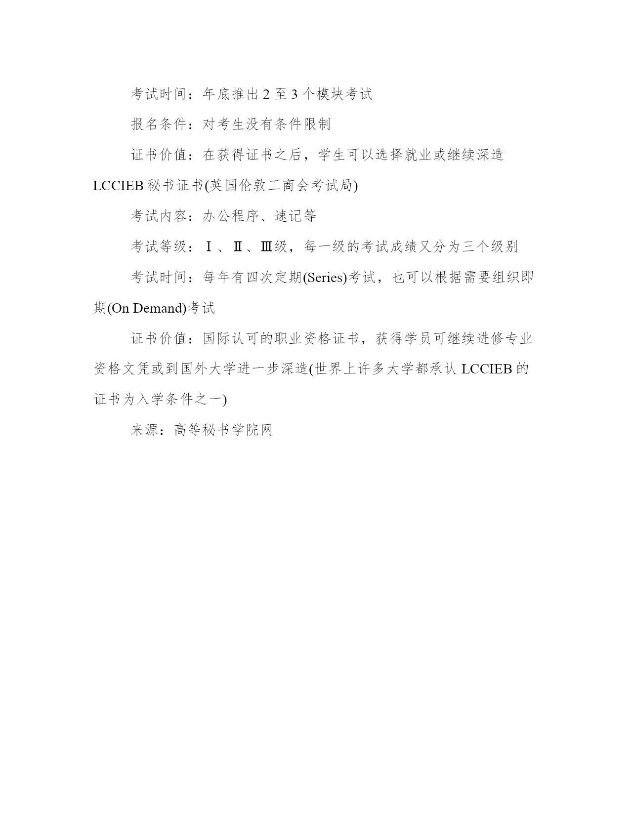 优秀秘书证书考试揭秘文章调查显示,若我国入世,随着商务交往的增多,秘书将成为更受欢迎的职业。而对秘书的要求也会不断提高。目前我国对秘书实行了职业准入,拥有秘书证书已经成为进入这一行业的必要条件。目前在我国开展秘书证书考试的除劳动和社会保障部外,还有英国剑桥大学考试委员会(UCLES)与教育部考试中心中英中心(SBC)、英国伦敦工商会考试局(LCCIEB)。全国秘书证书(劳动和社会保障部)考试内容:文书写作、公关礼仪、档案管理、办公室自动化、办公室工作、法律与经济管理概论、外语(英、日、俄等)考试等级:初、中、高三级普通秘书及涉外秘书证书价值:是在国内从事秘书职业的资格准入证明剑桥秘书证书(英国剑桥大学考试委员会和教育部考试中心中英中心)考试内容:包括核心课程———文字处理、商务沟通和任务管理、办公室管理;选修课程———速记、客户服务、组织会议和活动、人际商务技巧、信息与沟通技术考试方式:采用作业设计和实践考核等方法考察工作技能的掌握程度考试等级:分初级、中级和高级三个等级考试时间:年底推出2至3个模块考试报名条件:对考生没有条件限制证书价值:在获得证书之后,学生可以选择就业或继续深造LCCIEB秘书证书(英国伦敦工商会考试局)考试内容:办公程序、速记等考试等级:Ⅰ、Ⅱ、Ⅲ级,每一级的考试成绩又分为三个级别考试时间:每年有四次定期(Series)考试,也可以根据需要组织即期(OnDemand)考试证书价值:国际认可的职业资格证书,获得学员可继续进修专业资格文凭或到国外大学进一步深造(世界上许多大学都承认LCCIEB的证书为入学条件之一)来源:高等秘书学院网