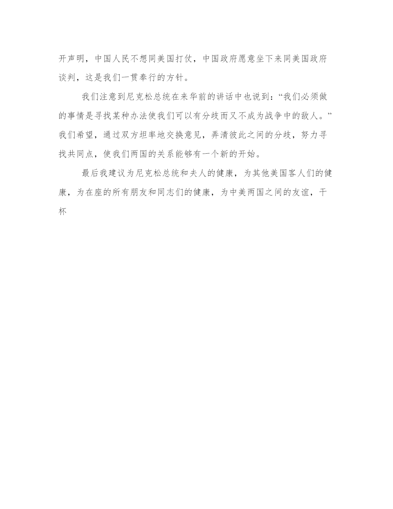 精品宴会会议欢迎词周恩来总理在欢迎尼克松总统宴会上的讲话总统先生、尼克松夫人,女士们、先生们,同志们、朋友们:首先,我高兴地代表##主席和中国政府向尼克松总统和夫人,以及其他的客人们表示欢迎。同时,我也想利用这个机会代表中国人民向远在太平洋彼岸的美国人民致以亲切的问候。尼克松总统应中国政府的邀请,前来我国访问,使两国领导人有机会直接会晤,谋求两国关系正常化,并对共同关心的问题交换意见,这是符合中美两国人民愿望的积极行动,这在中美两国关系史上是一个创举。美国人民是伟大的人民。中国人民是伟大的人民。我们两国人民一向是友好的。由于大家都知道的原因,两国人民之间往来中断了二十多年。现在,经过中美双方共同努力,友好往来的大门终于打开了。目前,促使两国关系正常化,争取和缓紧张局势,已经成为中美两国人民强烈的愿望。人民,只有人民,才是创造世界历史的动力。我们相信,我们两国人民这种共同愿望,总有一天要实现的。中美两国的社会制度根本不同,在中美两国政府之间存在巨大分歧。但是,这种分歧不应当妨碍中美两国在相互尊重主权和领土完整、互不侵犯、互不干涉内政、平等互利和和平共处五项原则的基础上建立正常的国家关系,更不应该导致战争。中国政府早在1955年就公开声明,中国人民不想同美国打仗,中国政府愿意坐下来同美国政府谈判,这是我们一贯奉行的方针。我们注意到尼克松总统在来华前的讲话中也说到:“我们必须做的事情是寻找某种办法使我们可以有分歧而又不成为战争中的敌人。”我们希望,通过双方坦率地交换意见,弄清彼此之间的分歧,努力寻找共同点,使我们两国的关系能够有一个新的开始。最后我建议为尼克松总统和夫人的健康,为其他美国客人们的健康,为在座的所有朋友和同志们的健康,为中美两国之间的友谊,干杯
