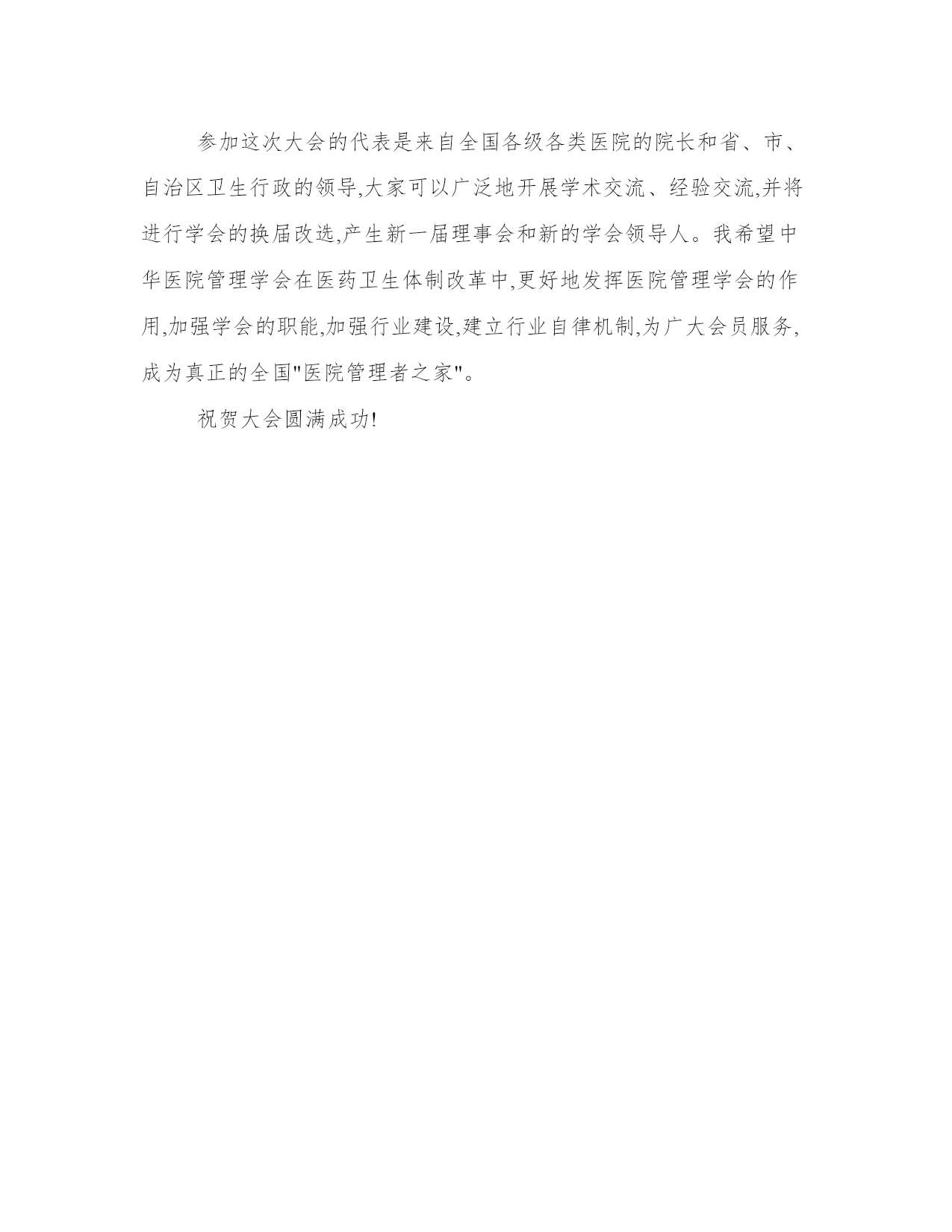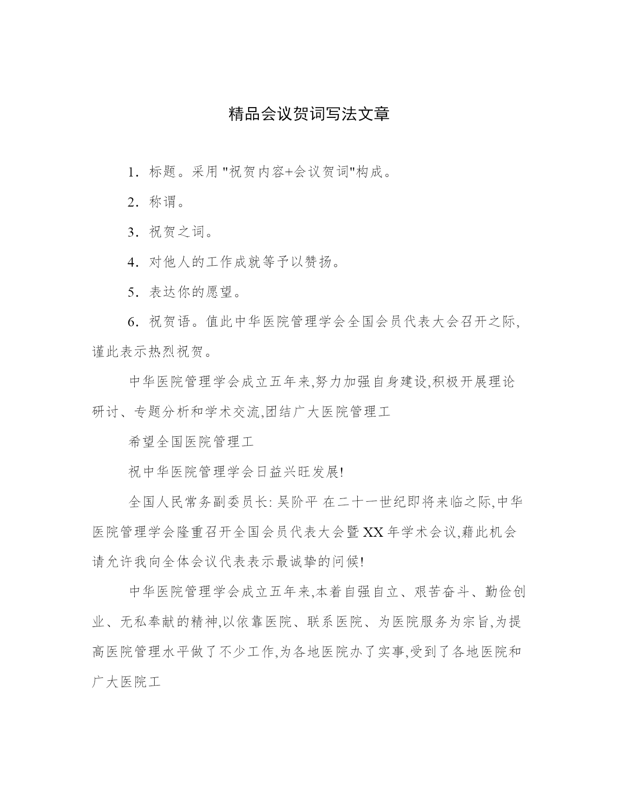 精品会议贺词写法文章1.标题。采用"祝贺内容+会议贺词"构成。2.称谓。3.祝贺之词。4.对他人的工作成就等予以赞扬。5.表达你的愿望。6.祝贺语。值此中华医院管理学会全国会员代表大会召开之际,谨此表示热烈祝贺。中华医院管理学会成立五年来,努力加强自身建设,积极开展理论研讨、专题分析和学术交流,团结广大医院管理工希望全国医院管理工祝中华医院管理学会日益兴旺发展!全国人民常务副委员长:吴阶平在二十一世纪即将来临之际,中华医院管理学会隆重召开全国会员代表大会暨XX年学术会议,藉此机会请允许我向全体会议代表表示最诚挚的问候!中华医院管理学会成立五年来,本着自强自立、艰苦奋斗、勤俭创业、无私奉献的精神,以依靠医院、联系医院、为医院服务为宗旨,为提高医院管理水平做了不少工作,为各地医院办了实事,受到了各地医院和广大医院工参加这次大会的代表是来自全国各级各类医院的院长和省、市、自治区卫生行政的领导,大家可以广泛地开展学术交流、经验交流,并将进行学会的换届改选,产生新一届理事会和新的学会领导人。我希望中华医院管理学会在医药卫生体制改革中,更好地发挥医院管理学会的作用,加强学会的职能,加强行业建设,建立行业自律机制,为广大会员服务,成为真正的全国"医院管理者之家"。祝贺大会圆满成功!