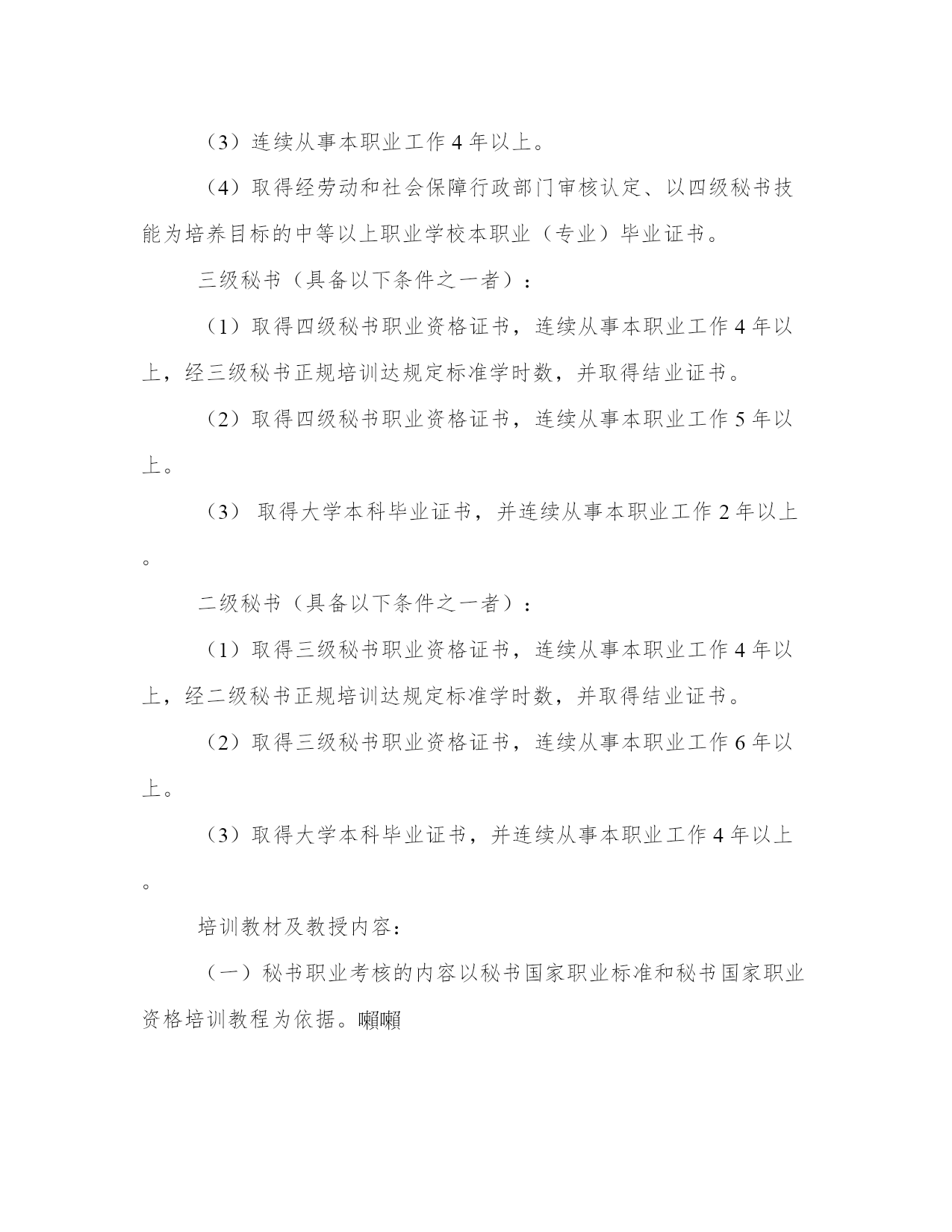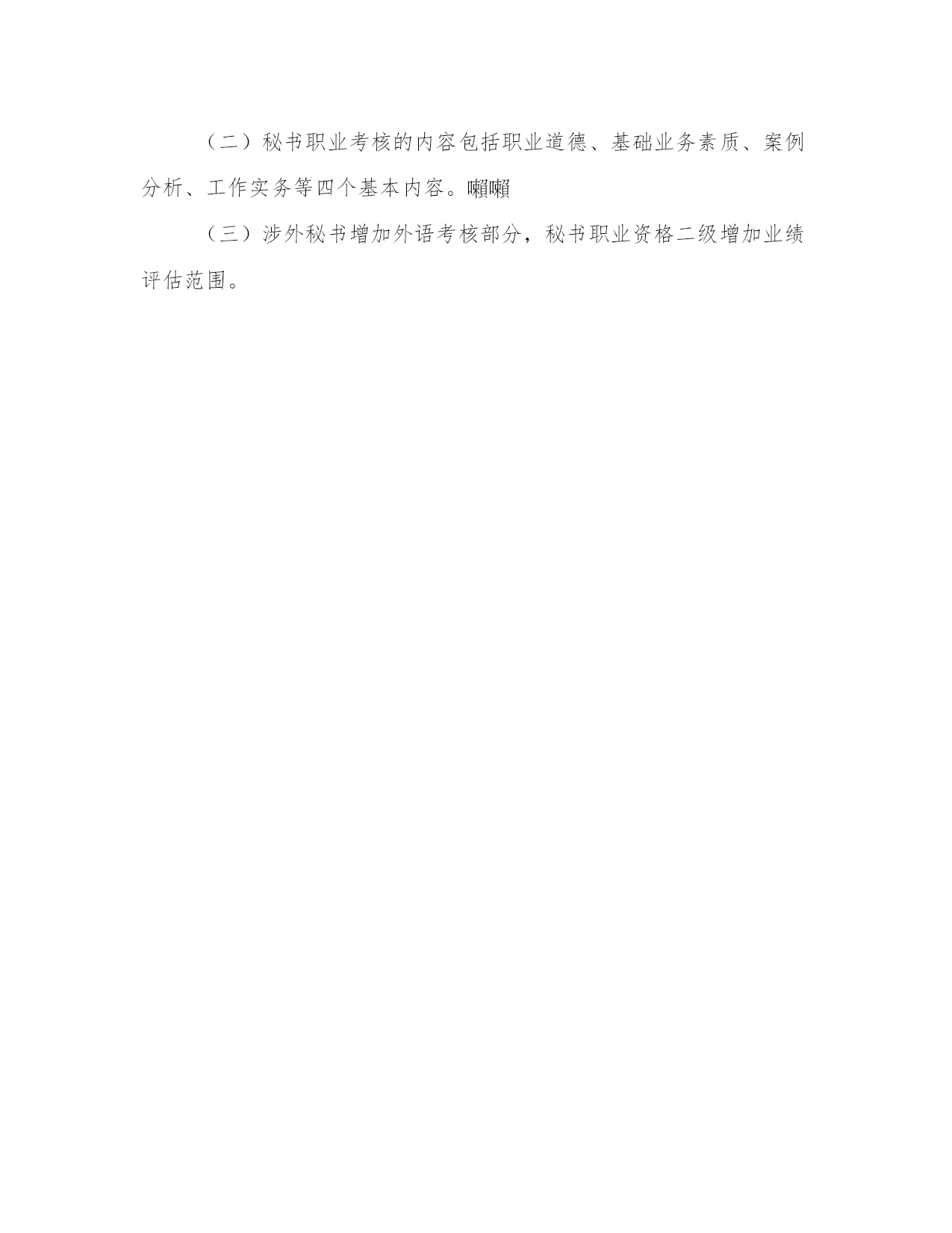 国家秘书职业资格证书范文根据中华人民共和国职业教育法的规定,我国劳动和社会保障部,1996年在全国推广职业资格证书制度工作,几年来做了大量的实质性的工作。秘书职业资格证书是1997年劳动保障部推出的第一个全国统考秘书职业资格证书。证书适用范围从事办公室工作、日常事务性工作、协助上司处理工作、为上司决策及实施提供服务的从业人员。秘书资格证书全国统一鉴定由劳动和社会保障部管理,是国内唯一的秘书从业人员资格证书。全国统一教材、试卷、考试时间,证书全国通用。获取秘书资格证书的申报条件:五级秘书(具备以下条件之一者):(1)经五级秘书正规培训达规定标准学时数,并取得结业证书。(2)在本职业连续见习工作2年以上。四级秘书(具备以下条件之一者):(1)取得五级秘书职业资格证书,连续从事本职业工作2年以上,经四级秘书正规培训达规定标准学时数,并取得结业证书。(2)取得五级秘书职业资格证书,连续从事本职业工作3年以上。(3)连续从事本职业工作4年以上。(4)取得经劳动和社会保障行政部门审核认定、以四级秘书技能为培养目标的中等以上职业学校本职业(专业)毕业证书。三级秘书(具备以下条件之一者):(1)取得四级秘书职业资格证书,连续从事本职业工作4年以上,经三级秘书正规培训达规定标准学时数,并取得结业证书。(2)取得四级秘书职业资格证书,连续从事本职业工作5年以上。(3)取得大学本科毕业证书,并连续从事本职业工作2年以上。二级秘书(具备以下条件之一者):(1)取得三级秘书职业资格证书,连续从事本职业工作4年以上,经二级秘书正规培训达规定标准学时数,并取得结业证书。(2)取得三级秘书职业资格证书,连续从事本职业工作6年以上。(3)取得大学本科毕业证书,并连续从事本职业工作4年以上。培训教材及教授内容:(一)秘书职业考核的内容以秘书国家职业标准和秘书国家职业资格培训教程为依据。(二)秘书职业考核的内容包括职业道德、基础业务素质、案例分析、工作实务等四个基本内容。(三)涉外秘书增加外语考核部分,秘书职业资格二级增加业绩评估范围。