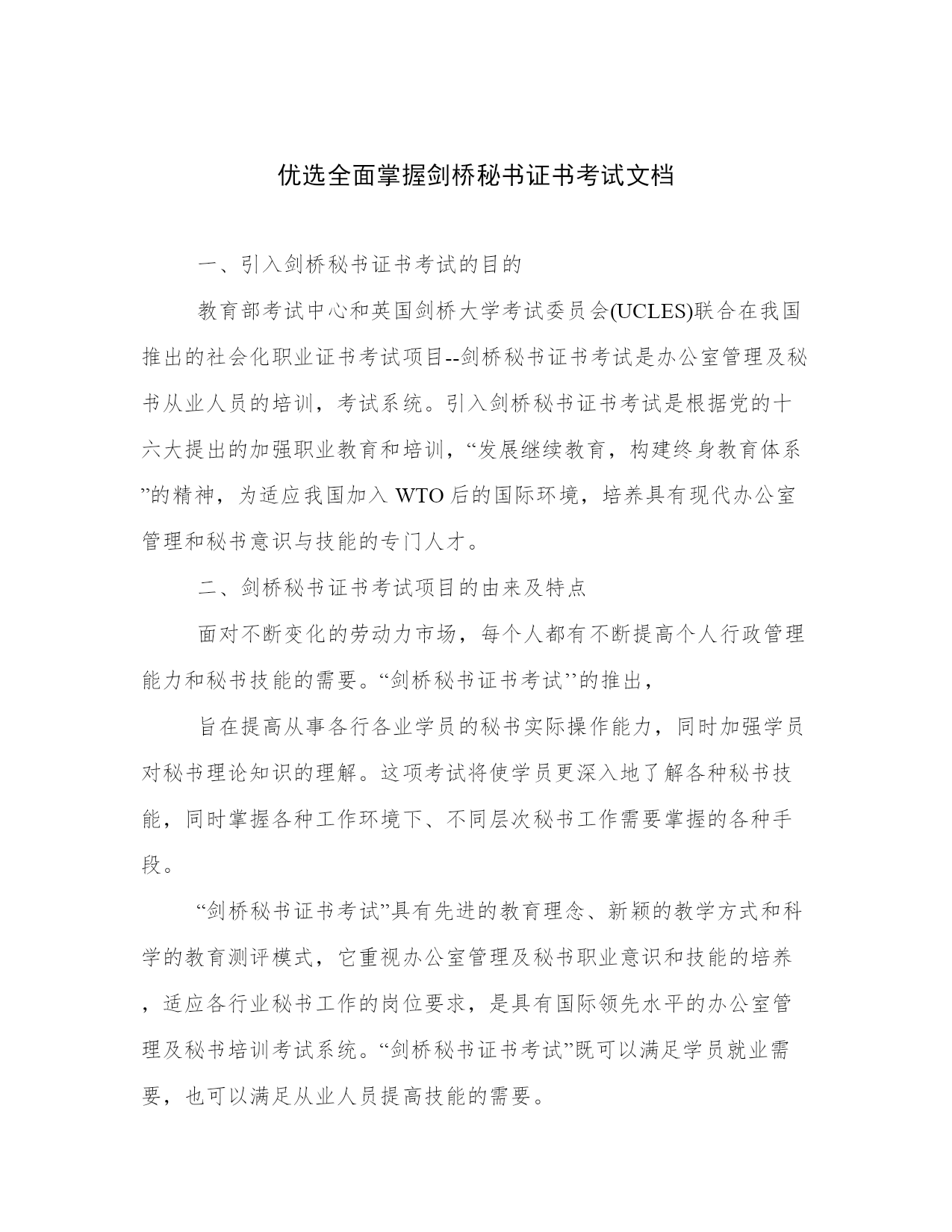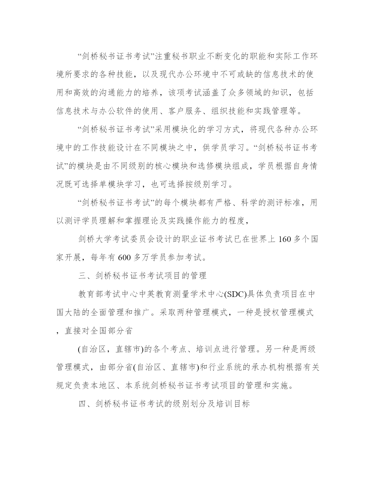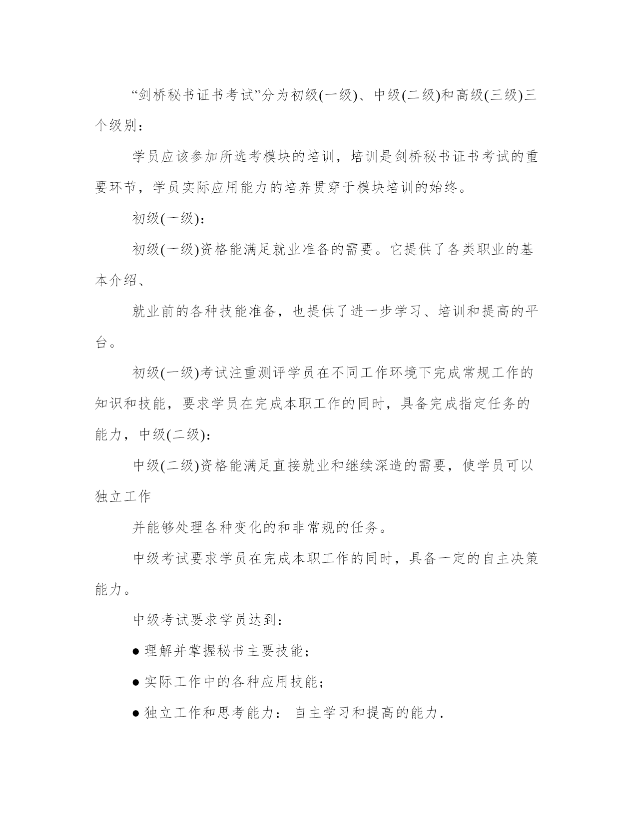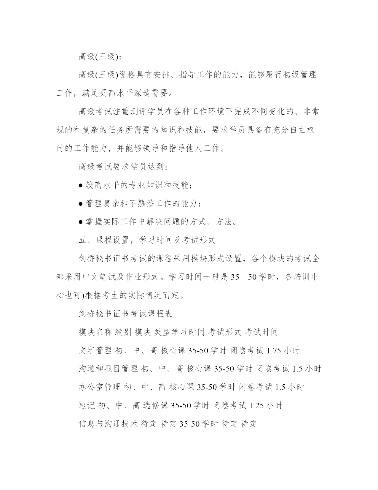 优选全面掌握剑桥秘书证书考试文档一、引入剑桥秘书证书考试的目的教育部考试中心和英国剑桥大学考试委员会(UCLES)联合在我国推出的社会化职业证书考试项目--剑桥秘书证书考试是办公室管理及秘书从业人员的培训,考试系统。引入剑桥秘书证书考试是根据党的十六大提出的加强职业教育和培训,“发展继续教育,构建终身教育体系”的精神,为适应我国加入WTO后的国际环境,培养具有现代办公室管理和秘书意识与技能的专门人才。二、剑桥秘书证书考试项目的由来及特点面对不断变化的劳动力市场,每个人都有不断提高个人行政管理能力和秘书技能的需要。“剑桥秘书证书考试’’的推出,旨在提高从事各行各业学员的秘书实际操作能力,同时加强学员对秘书理论知识的理解。这项考试将使学员更深入地了解各种秘书技能,同时掌握各种工作环境下、不同层次秘书工作需要掌握的各种手段。“剑桥秘书证书考试”具有先进的教育理念、新颖的教学方式和科学的教育测评模式,它重视办公室管理及秘书职业意识和技能的培养,适应各行业秘书工作的岗位要求,是具有国际领先水平的办公室管理及秘书培训考试系统。“剑桥秘书证书考试”既可以满足学员就业需要,也可以满足从业人员提高技能的需要。“剑桥秘书证书考试”注重秘书职业不断变化的职能和实际工作环境所要求的各种技能,以及现代办公环境中不可或缺的信息技术的使用和高效的沟通能力的培养,该项考试涵盖了众多领域的知识,包括信息技术与办公软件的使用、客户服务、组织技能和实践管理等。“剑桥秘书证书考试”采用模块化的学习方式,将现代各种办公环境中的工作技能设计在不同模块之中,供学员学习。“剑桥秘书证书考试”的模块是由不同级别的核心模块和选修模块组成,学员根据自身情况既可选择单模块学习,也可选择按级别学习。“剑桥秘书证书考试”的每个模块都有严格、科学的测评标准,用以测评学员理解和掌握理论及实践操作能力的程度,剑桥大学考试委员会设计的职业证书考试已在世界上160多个国家开展,每年有600多万学员参加考试。三、剑桥秘书证书考试项目的管理教育部考试中心中英教育测量学术中心(SDC)具体负责项目在中国大陆的全面管理和推广。采取两种管理模式,一种是授权管理模式,直接对全国部分省(自治区,直辖市)的各个考点、培训点进行管理。另一种是两级管理模式,由部分省(自治区、直辖市)和行业系统的承办机构根据有关规定负责本地区、本系统剑桥秘书证书考试项目的管理和实施。四、剑桥秘书证书考试的级别划分及培训目标“剑桥秘书证书考试”分为初级(一级)、中级(二级)和高级(三级)三个级别:学员应该参加所选考模块的培训,培训是剑桥秘书证书考试的重要环节,学员实际应用能力的培养贯穿于模块培训的始终。初级(一级):初级(一级)资格能满足就业准备的需要。它提供了各类职业的基本介绍、就业前的各种技能准备,也提供了进一步学习、培训和提高的平台。初级(一级)考试注重测评学员在不同工作环境下完成常规工作的知识和技能,要求学员在完成本职工作的同时,具备完成指定任务的能力,中级(二级):中级(二级)资格能满足直接就业和继续深造的需要,使学员可以独立工作并能够处理各种变化的和非常规的任务。中级考试要求学员在完成本职工作的同时,具备一定的自主决策能力。中级考试要求学员达到:●理解并掌握秘书主要技能;●实际工作中的各种应用技能;●独立工作和思考能力:自主学习和提高的能力.高级(三级):高级(三级)资格具有安排、指导工作的能力,能够履行初级管理工作,满足更高水平深造需要。高级考试注重测评学员在各种工作环境下完成不同变化的、非常规的和复杂的任务所需要的知识和技能,要求学员具备有充分自主权时的工作能力,并能够领导和指导他人工作。高级考试要求学员达到:●较高水平的专业知识和技能;●管理复杂和不熟悉工作的能力;●掌握实际工作中解决问题的方式、方法。五、课程设置,学习时间及考试形式剑桥秘书证书考试的课程采用模块形式设置,各个模块的考试全部采用中文笔试及作业形式。学习时间一般是35—50学时,各培训中心也可)根据考生的实际情况而定。剑桥秘书证书考试课程表模块名称级别模块类型学习时间考试形式考试时间文字管理初、中、高核心课35-50学时闭卷考试1.75小时沟通和项目管理初、中、高核心课35-50学时闭卷考试1.5小时办公室管理初、中、高核心课35-50学时闭卷考试1.5小时速记初、中、高选修课35-50学时闭卷考试1.25小时信息与沟通技术待定待定35-50学时待定待定客户服务初、中、高选修课35-50学时作业考试规定日期交人际商务技巧中、高选修课35-50学时作业考试规定日期交组织会议和活动中、高选修课35-50学时作业考试规定日期交注:作业考试“作业考试”包括学生评估记录(SAR)和作业两部分内容,学生评√占记录中列出了相关模块的能力标准,指导教师根据考生的实际情