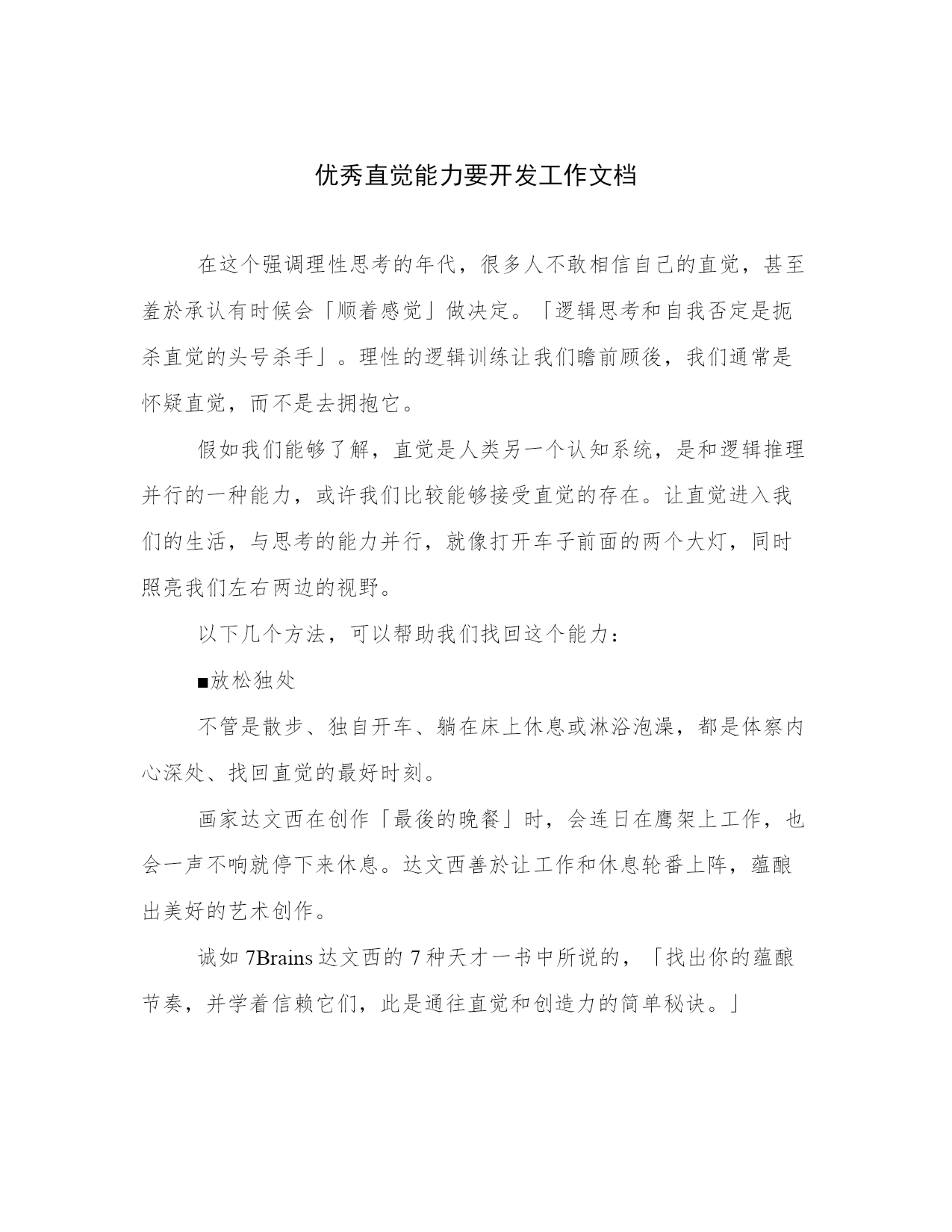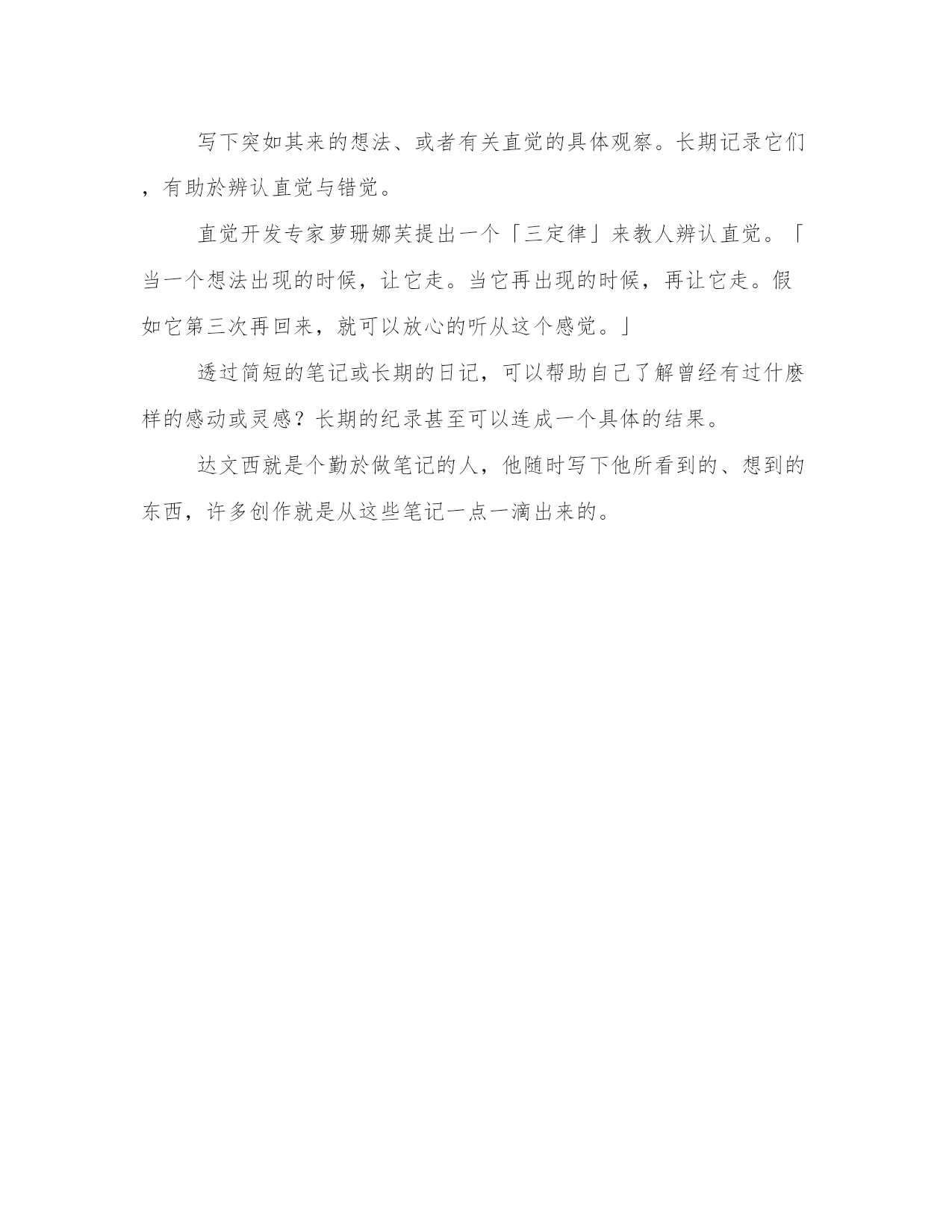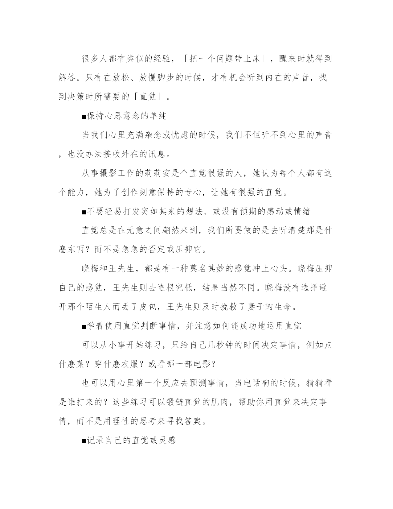 优秀直觉能力要开发工作文档在这个强调理性思考的年代,很多人不敢相信自己的直觉,甚至羞於承认有时候会「顺着感觉」做决定。「逻辑思考和自我否定是扼杀直觉的头号杀手」。理性的逻辑训练让我们瞻前顾後,我们通常是怀疑直觉,而不是去拥抱它。假如我们能够了解,直觉是人类另一个认知系统,是和逻辑推理并行的一种能力,或许我们比较能够接受直觉的存在。让直觉进入我们的生活,与思考的能力并行,就像打开车子前面的两个大灯,同时照亮我们左右两边的视野。以下几个方法,可以帮助我们找回这个能力:■放松独处不管是散步、独自开车、躺在床上休息或淋浴泡澡,都是体察内心深处、找回直觉的最好时刻。画家达文西在创作「最後的晚餐」时,会连日在鹰架上工作,也会一声不响就停下来休息。达文西善於让工作和休息轮番上阵,蕴酿出美好的艺术创作。诚如7Brains达文西的7种天才一书中所说的,「找出你的蕴酿节奏,并学着信赖它们,此是通往直觉和创造力的简单秘诀。」很多人都有类似的经验,「把一个问题带上床」,醒来时就得到解答。只有在放松、放慢脚步的时候,才有机会听到内在的声音,找到决策时所需要的「直觉」。■保持心思意念的单纯当我们心里充满杂念或忧虑的时候,我们不但听不到心里的声音,也没办法接收外在的讯息。从事摄影工作的莉莉安是个直觉很强的人,她认为每个人都有这个能力,她为了创作刻意保持的专心,让她有很强的直觉。■不要轻易打发突如其来的想法、或没有预期的感动或情绪直觉总是在无意之间翩然来到,我们所要做的是去听清楚那是什麽东西?而不是急急的否定或压抑它。晓梅和王先生,都是有一种莫名其妙的感觉冲上心头。晓梅压抑自己的感觉,王先生则去追根究柢,结果当然不同。晓梅没有选择避开那个陌生人而丢了皮包,王先生则及时挽救了妻子的生命。■学着使用直觉判断事情,并注意如何能成功地运用直觉可以从小事开始练习,只给自己几秒钟的时间决定事情,例如点什麽菜?穿什麽衣服?或看哪一部电影?也可以用心里第一个反应去预测事情,当电话响的时候,猜猜看是谁打来的?这些练习可以锻链直觉的肌肉,帮助你用直觉来决定事情,而不是用理性的思考来寻找答案。■记录自己的直觉或灵感写下突如其来的想法、或者有关直觉的具体观察。长期记录它们,有助於辨认直觉与错觉。直觉开发专家萝珊娜芙提出一个「三定律」来教人辨认直觉。「当一个想法出现的时候,让它走。当它再出现的时候,再让它走。假如它第三次再回来,就可以放心的听从这个感觉。」透过简短的笔记或长期的日记,可以帮助自己了解曾经有过什麽样的感动或灵感?长期的纪录甚至可以连成一个具体的结果。达文西就是个勤於做笔记的人,他随时写下他所看到的、想到的东西,许多创作就是从这些笔记一点一滴出来的。