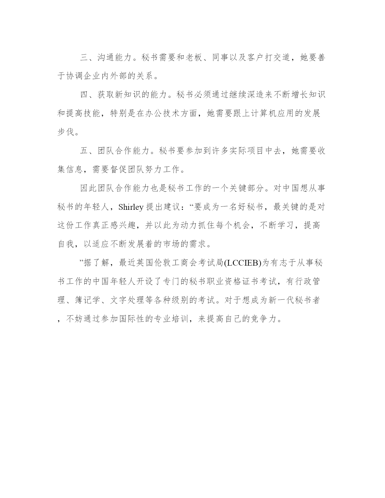 优选秘书该掌握哪些职业技能例文在许多人眼里,秘书就是打字员和办事员。但在国外,秘书早已被划分到行政管理的范围之内。从我国劳动部门最近几年出台的秘书职业标准来看,与国际标准尚有距离。那么,在新的时代,秘书的职业标准是什么呢?最近,英国伦敦工商会考试局负责行政管理方面的主考官Shirley-Taylor女士发表了自己的看法。ShirleyTaylor女士认为,在过去的几十年中,秘书的角色变化得很快,她们不再是打字员或是办事员。这个变化表明了秘书开始被归入行政管理工作范畴,秘书的工作职能将涉及项目管理、计算机软件应用、组织会议和出差、外部网和内部网的通信、文件信息整理、办公室管理等方面。这种变化使得市场对秘书人才职业技能的需要也开始发生转变。Shirley介绍说,在21世纪,秘书需要有以下五方面的能力:一、多元化才能。秘书应用懂得两国甚至三国以上的语言,具有一定的语言处理能力和计算机技能。二、组织能力。秘书应当是一个组织者,她要为各种会议和活动作计划,并落实安排。同时,她还需要应付一大堆的工作日记、计划表、文件和电子档案。三、沟通能力。秘书需要和老板、同事以及客户打交道,她要善于协调企业内外部的关系。四、获取新知识的能力。秘书必须通过继续深造来不断增长知识和提高技能,特别是在办公技术方面,她需要跟上计算机应用的发展步伐。五、团队合作能力。秘书要参加到许多实际项目中去,她需要收集信息,需要督促团队努力工作。因此团队合作能力也是秘书工作的一个关键部分。对中国想从事秘书的年轻人,Shirley提出建议:“要成为一名好秘书,最关键的是对这份工作真正感兴趣,并以此为动力抓住每个机会,不断学习,提高自我,以适应不断发展着的市场的需求。”据了解,最近英国伦敦工商会考试局(LCCIEB)为有志于从事秘书工作的中国年轻人开设了专门的秘书职业资格证书考试,有行政管理、簿记学、文字处理等各种级别的考试。对于想成为新一代秘书者,不妨通过参加国际性的专业培训,来提高自己的竞争力。