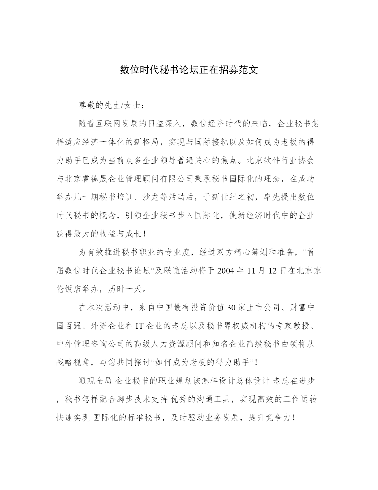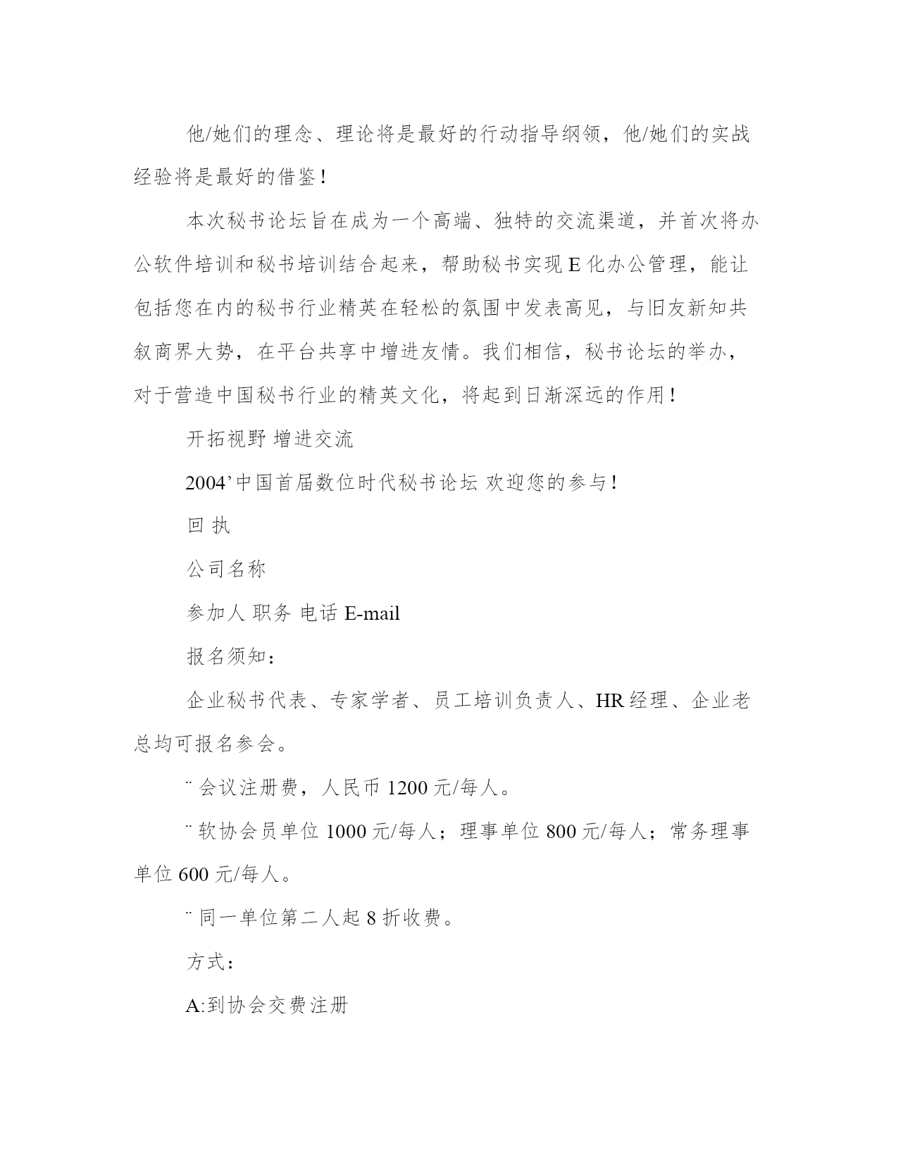 数位时代秘书论坛正在招募范文尊敬的先生/女士:随着互联网发展的日益深入,数位经济时代的来临,企业秘书怎样适应经济一体化的新格局,实现与国际接轨以及如何成为老板的得力助手已成为当前众多企业领导普遍关心的焦点。北京软件行业协会与北京睿德晟企业管理顾问有限公司秉承秘书国际化的理念,在成功举办几十期秘书培训、沙龙等活动后,于新世纪之初,率先提出数位时代秘书的概念,引领企业秘书步入国际化,使新经济时代中的企业获得最大的收益与成长!为有效推进秘书职业的专业度,经过双方精心筹划和准备,“首届数位时代企业秘书论坛”及联谊活动将于2004年11月12日在北京京伦饭店举办,历时一天。在本次活动中,来自中国最有投资价值30家上市公司、财富中国百强、外资企业和IT企业的老总以及秘书界权威机构的专家教授、中外管理咨询公司的高级人力资源顾问和知名企业高级秘书白领将从战略视角,与您共同探讨“如何成为老板的得力助手”!通观全局企业秘书的职业规划该怎样设计总体设计老总在进步,秘书怎样配合脚步技术支持优秀的沟通工具,实现高效的工作运转快速实现国际化的标准秘书,及时驱动业务发展,提升竞争力!他/她们的理念、理论将是最好的行动指导纲领,他/她们的实战经验将是最好的借鉴!本次秘书论坛旨在成为一个高端、独特的交流渠道,并首次将办公软件培训和秘书培训结合起来,帮助秘书实现E化办公管理,能让包括您在内的秘书行业精英在轻松的氛围中发表高见,与旧友新知共叙商界大势,在平台共享中增进友情。我们相信,秘书论坛的举办,对于营造中国秘书行业的精英文化,将起到日渐深远的作用!开拓视野增进交流2004’中国首届数位时代秘书论坛欢迎您的参与!回执公司名称参加人职务电话E-mail报名须知:企业秘书代表、专家学者、员工培训负责人、HR经理、企业老总均可报名参会。¨会议注册费,人民币1200元/每人。¨软协会员单位1000元/每人;理事单位800元/每人;常务理事单位600元/每人。¨同一单位第二人起8折收费。方式:A:到协会交费注册B:银行汇款开户银行:工行礼士路支行银行帐号:0200003609014450452单位全称:北京软件行业协会注:1、汇款后请将汇款凭证发传真至协会,注明“参加秘书论坛”字样。2、协会收到报名表及付款凭证复印件后将发送“参会确认函”予以确认。3、会议当天凭“参会确认函”至会场接待处办理报到手续,并领取发票。联系方式:联系人:白海霞82358631-105baihx@**.com单辉82358631-124shanh@**.com传真:82358691(Fax)地址:海淀区知春路23号(量子银座)13号楼1303、1305室(大运村天鸿科园大酒店东侧)北京软件行业协会北京睿德晟企业管理顾问有限公司2004年9月20日