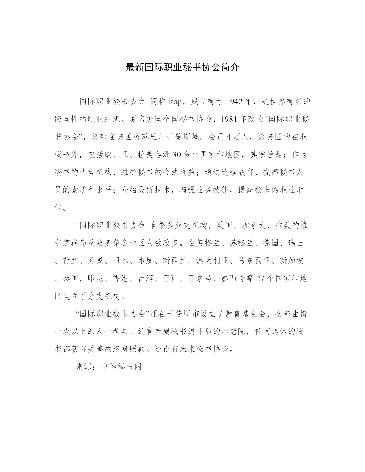 最新国际职业秘书协会简介“国际职业秘书协会”简称iaap,成立有于1942年,是世界有名的跨国性的职业组织。原名美国全国秘书协会,1981年改为“国际职业秘书协会”,总部在美国密苏里州开普斯城。会员4万人,除美国的在职秘书外,包括欧、亚、拉美各洲30多个国家和地区,其宗旨是:作为秘书的代言机构,维护秘书的合法利益;通过连续教育,提高秘书人员的素质和水平;介绍最新技术,增强业务技能,提高秘书的职业地位。“国际职业秘书协会”有很多分支机构,美国、加拿大、拉美的维尔京群岛及波多黎各地区人数较多。在英格兰、苏格兰、德国、瑞士、荷兰、挪威、日本、印度、新西兰、澳大利亚、马来西亚、新加坡、泰国、印尼、香港、台湾、巴西、巴拿马、墨西哥等27个国家和地区设立了分支机构。“国际职业秘书协会”还在开普斯市设立了教育基金会,全部由博士级以上的人士参与。还有专属秘书退休后的养老院,任何退休的秘书都获有妥善的终身照顾。还设有未来秘书协会。来源:中华秘书网