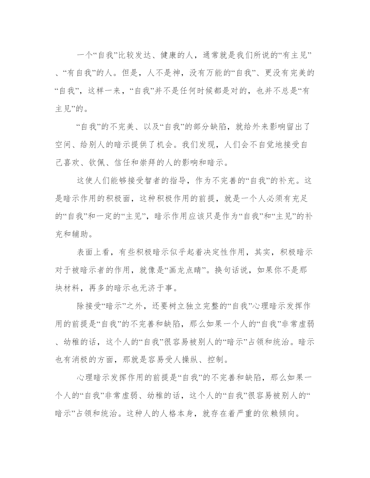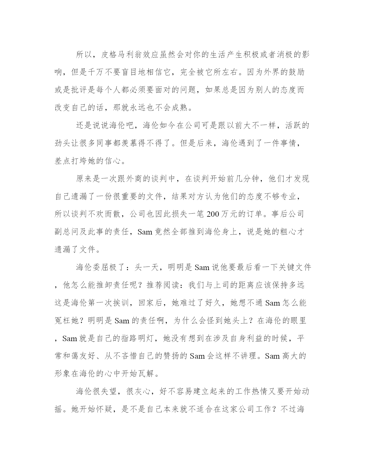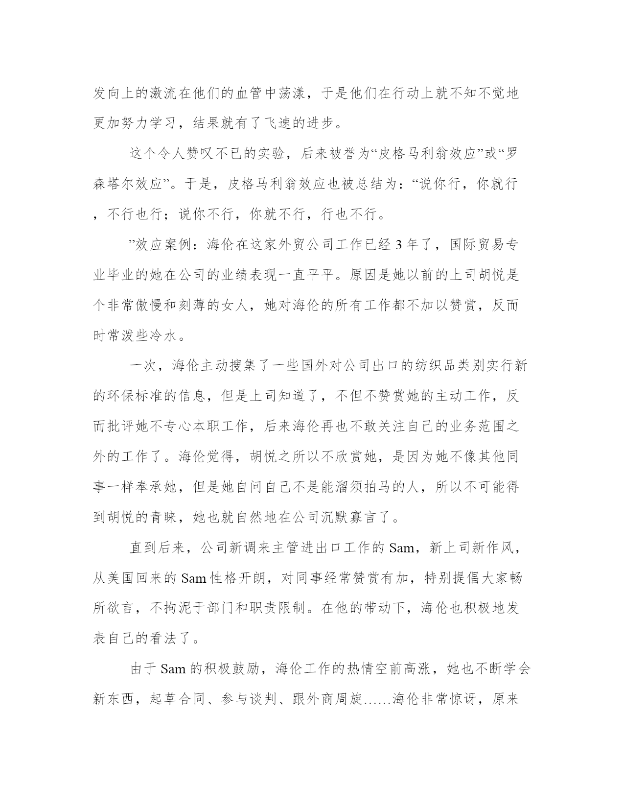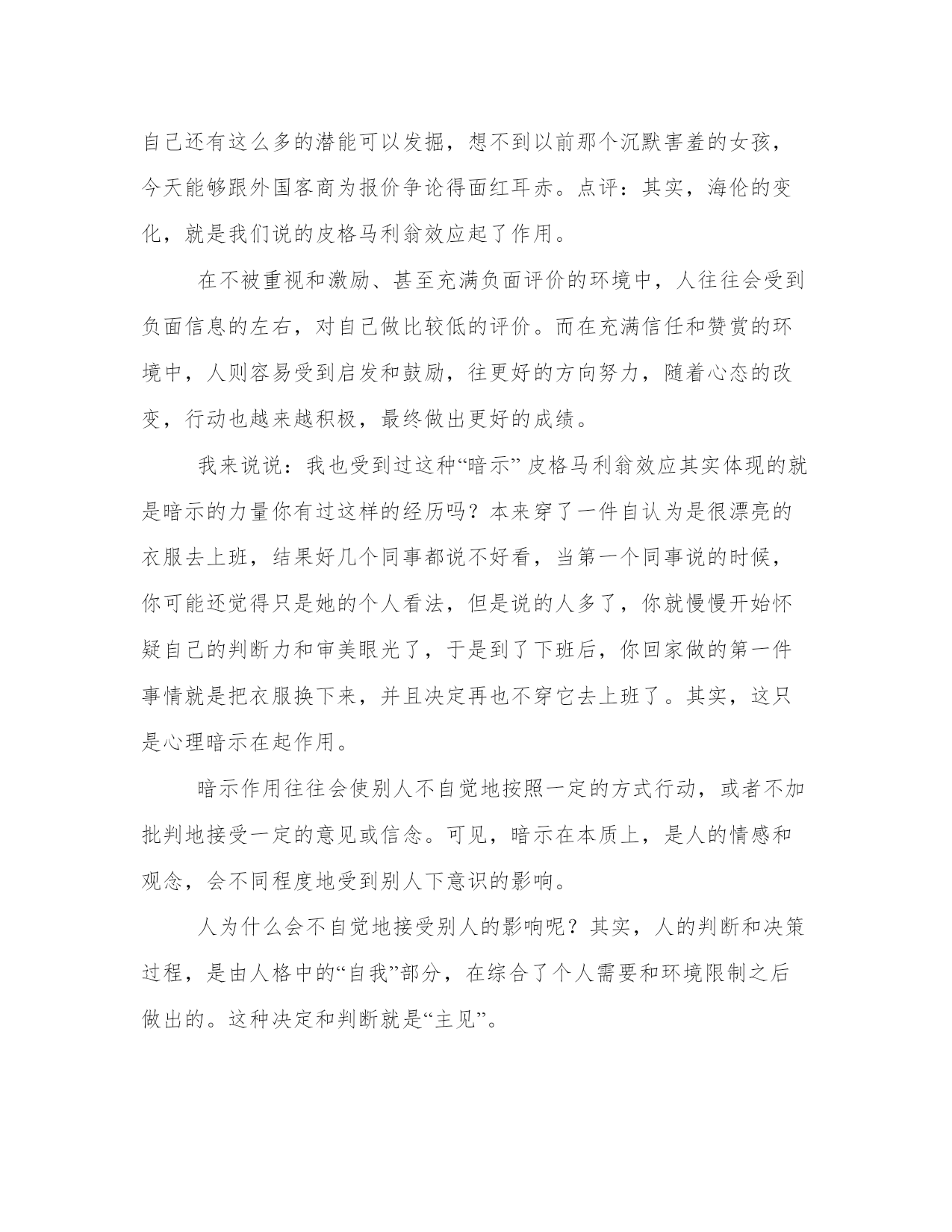 优选职场暗示效应让梦想成真例文暗示在本质上,是人的情感和观念,会不同程度地受到别人下意识的影响。人们会不自觉地接受自己喜欢、钦佩、信任和崇拜的人的影响和暗示。而这种暗示,正是让你梦想成真的基石之一……什么是皮格马利翁效应远古时候,塞浦路斯王子皮格马利翁喜爱雕塑。一天,他成功塑造了一个美女的形象,爱不释手,每天以深情的眼光观赏不止。看着看着,美女竟活了。1968年,两位美国心理学家来到一所小学,他们从一至六年级中各选3个班,在学生中进行了一次煞有介事的“发展测验”。然后,他们以赞美的口吻将有优异发展可能的学生名单通知有关老师。8个月后,他们又来到这所学校进行复试,结果名单上的学生成绩有了显著进步,而且情感、性格更为开朗,求知欲望强,敢于发表意见,与教师关系也特别融洽。实际上,这是心理学家进行的一次期望心理实验。他们提供的名单纯粹是随便抽取的。他们通过“权威性的谎言”暗示教师,坚定教师对名单上学生的信心,虽然教师始终把这些名单藏在内心深处,但掩饰不住的热情仍然通过眼神、笑貌、音调滋润着这些学生的心田,实际上他们扮演了皮格马利翁的角色。学生潜移默化地受到影响,因此变得更加自信,奋发向上的激流在他们的血管中荡漾,于是他们在行动上就不知不觉地更加努力学习,结果就有了飞速的进步。这个令人赞叹不已的实验,后来被誉为“皮格马利翁效应”或“罗森塔尔效应”。于是,皮格马利翁效应也被总结为:“说你行,你就行,不行也行;说你不行,你就不行,行也不行。”效应案例:海伦在这家外贸公司工作已经3年了,国际贸易专业毕业的她在公司的业绩表现一直平平。原因是她以前的上司胡悦是个非常傲慢和刻薄的女人,她对海伦的所有工作都不加以赞赏,反而时常泼些冷水。一次,海伦主动搜集了一些国外对公司出口的纺织品类别实行新的环保标准的信息,但是上司知道了,不但不赞赏她的主动工作,反而批评她不专心本职工作,后来海伦再也不敢关注自己的业务范围之外的工作了。海伦觉得,胡悦之所以不欣赏她,是因为她不像其他同事一样奉承她,但是她自问自己不是能溜须拍马的人,所以不可能得到胡悦的青睐,她也就自然地在公司沉默寡言了。直到后来,公司新调来主管进出口工作的Sam,新上司新作风,从美国回来的Sam性格开朗,对同事经常赞赏有加,特别提倡大家畅所欲言,不拘泥于部门和职责限制。在他的带动下,海伦也积极地发表自己的看法了。由于Sam的积极鼓励,海伦工作的热情空前高涨,她也不断学会新东西,起草合同、参与谈判、跟外商周旋……海伦非常惊讶,原来自己还有这么多的潜能可以发掘,想不到以前那个沉默害羞的女孩,今天能够跟外国客商为报价争论得面红耳赤。点评:其实,海伦的变化,就是我们说的皮格马利翁效应起了作用。在不被重视和激励、甚至充满负面评价的环境中,人往往会受到负面信息的左右,对自己做比较低的评价。而在充满信任和赞赏的环境中,人则容易受到启发和鼓励,往更好的方向努力,随着心态的改变,行动也越来越积极,最终做出更好的成绩。我来说说:我也受到过这种“暗示”皮格马利翁效应其实体现的就是暗示的力量你有过这样的经历吗?本来穿了一件自认为是很漂亮的衣服去上班,结果好几个同事都说不好看,当第一个同事说的时候,你可能还觉得只是她的个人看法,但是说的人多了,你就慢慢开始怀疑自己的判断力和审美眼光了,于是到了下班后,你回家做的第一件事情就是把衣服换下来,并且决定再也不穿它去上班了。其实,这只是心理暗示在起作用。暗示作用往往会使别人不自觉地按照一定的方式行动,或者不加批判地接受一定的意见或信念。可见,暗示在本质上,是人的情感和观念,会不同程度地受到别人下意识的影响。人为什么会不自觉地接受别人的影响呢?其实,人的判断和决策过程,是由人格中的“自我”部分,在综合了个人需要和环境限制之后做出的。这种决定和判断就是“主见”。一个“自我”比较发达、健康的人,通常就是我们所说的“有主见”、“有自我”的人。但是,人不是神,没有万能的“自我”、更没有完美的“自我”,这样一来,“自我”并不是任何时候都是对的,也并不总是“有主见”的。“自我”的不完美、以及“自我”的部分缺陷,就给外来影响留出了空间、给别人的暗示提供了机会。我们发现,人们会不自觉地接受自己喜欢、钦佩、信任和崇拜的人的影响和暗示。这使人们能够接受智者的指导,作为不完善的“自我”的补充。这是暗示作用的积极面,这种积极作用的前提,就是一个人必须有充足的“自我”和一定的“主见”,暗示作用应该只是作为“自我”和“主见”的补充和辅助。表面上看,有些积极暗示似乎起着决定性作用,其实,积极暗示对于被暗示者的作用,就像是“画龙点睛”。换句话说,如果你不是那块材料,再多的暗示也无济于事。除接受“暗示”之外,还要树立独立完整的“自我”心理暗示发挥作用的前提是“自我”的不完善和缺陷,那么如果一个人的“自我”非常虚弱、幼稚的