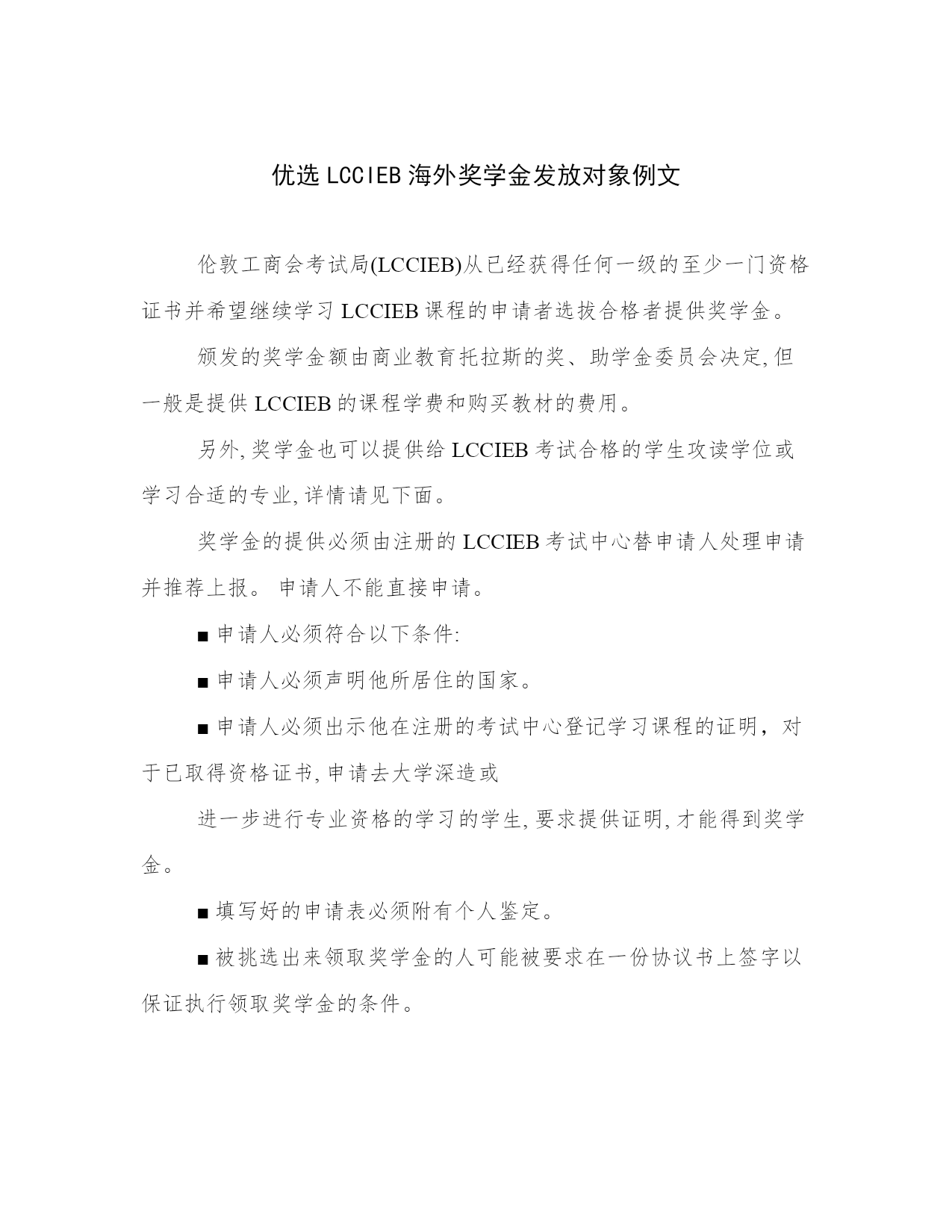 优选LCCIEB海外奖学金发放对象例文伦敦工商会考试局(LCCIEB)从已经获得任何一级的至少一门资格证书并希望继续学习LCCIEB课程的申请者选拔合格者提供奖学金。颁发的奖学金额由商业教育托拉斯的奖、助学金委员会决定,但一般是提供LCCIEB的课程学费和购买教材的费用。另外,奖学金也可以提供给LCCIEB考试合格的学生攻读学位或学习合适的专业,详情请见下面。奖学金的提供必须由注册的LCCIEB考试中心替申请人处理申请并推荐上报。申请人不能直接申请。■申请人必须符合以下条件:■申请人必须声明他所居住的国家。■申请人必须出示他在注册的考试中心登记学习课程的证明,对于已取得资格证书,申请去大学深造或进一步进行专业资格的学习的学生,要求提供证明,才能得到奖学金。■填写好的申请表必须附有个人鉴定。■被挑选出来领取奖学金的人可能被要求在一份协议书上签字以保证执行领取奖学金的条件。■假如申请人在领取奖学金期间不能满足奖学金发放的条件,那么只能按已经过去的时间与奖学金发放的总时间之比来领取该比例的奖学金。■奖学金从颁奖之日起12个月内付清。■奖学金以双方同意的时间间隔直接付给考试中心。■伦敦工商会商业教育托拉斯关于奖学金的发放以及关于考生是否满足上述条件的决议是不可更改的,并具有约束力的,不能上诉。■从以下部门可以得到专用申请表:伦敦工商会考试局商业发展部主任地址:AthenaHouse,12StationRoad,Sidcup,KentDA157BJ注:对于函授课程的费用资助申请不予考虑,对于在其他专业团体或考试部门获取LCCIEB证书的课程的费用资助也不予考虑。来源:搜狐教育