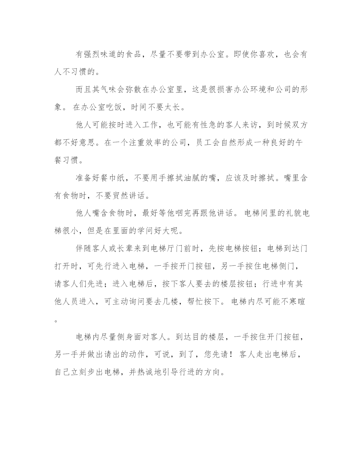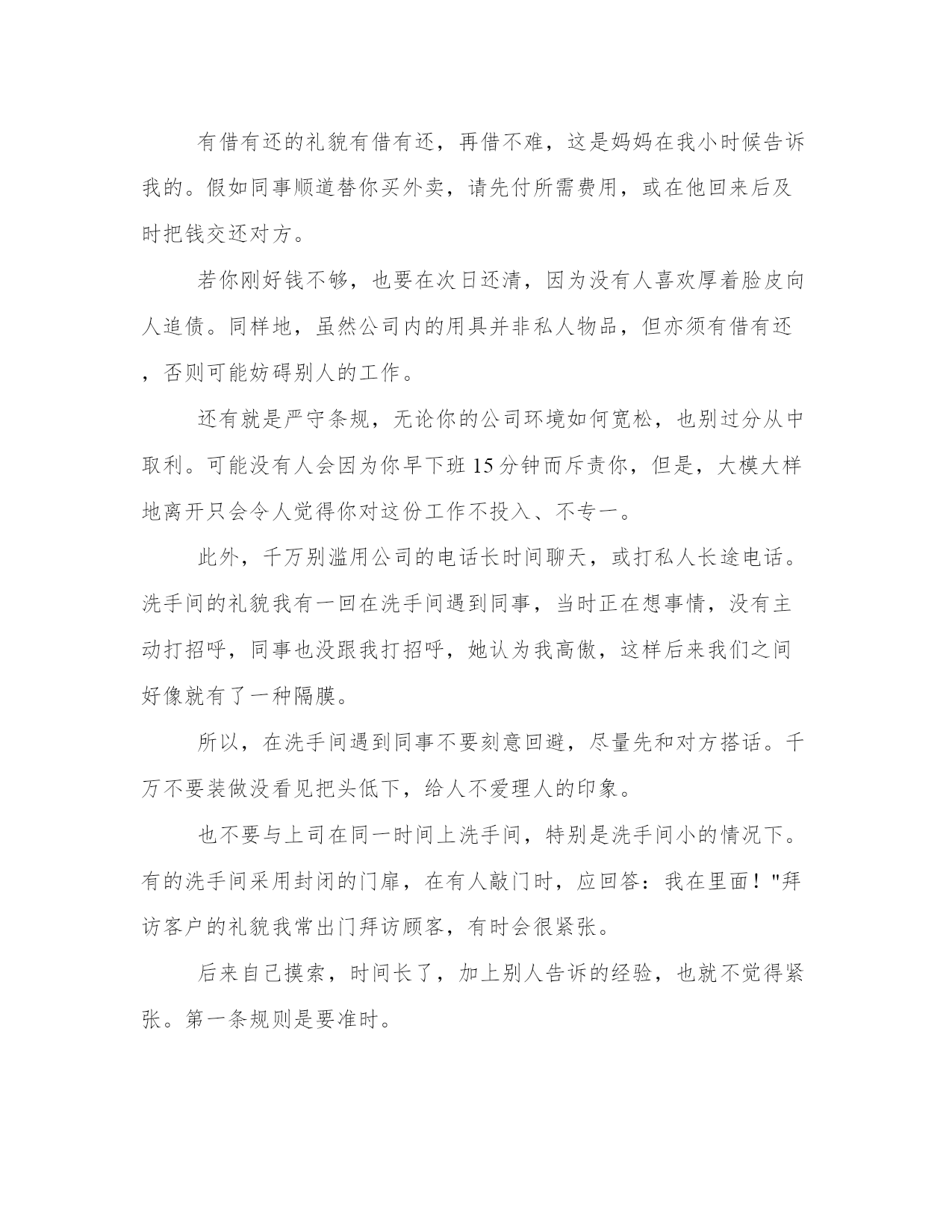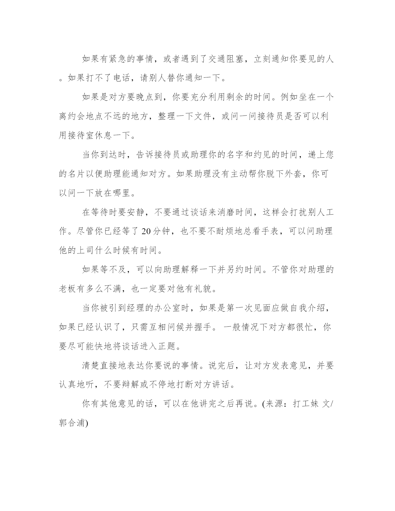 最新秘书兵法办公室礼仪地图例文我的许多朋友从农村来到城市,开始是做工人的,因为他们自强不息,进修了大专,开始做了办公室职员,有的是接线员,有的是秘书,更多的做了推销员,经常出入office。她们都认为懂得职场礼仪是多么重要。遵循一些礼仪规范,了解、掌握并恰当地应用职场礼仪会使你在工作中左右逢源,使你的事业蒸蒸日上哦。办公桌的礼貌我们办公室有十张办公桌,情形却大不一样。只有一两张是整洁的,其他都是惨不忍睹。我一看到凌乱的办公桌,就对这个桌子的主人打了折扣。所以奉劝大家,保持办公桌的清洁是一种礼貌。想说说在办公室里用餐的事,使用一次性餐具,最好吃完立刻扔掉,不要长时间摆在桌子或茶几上。如果突然有事情了,也记得礼貌地请同事代劳。容易被忽略的是饮料罐,只要是开了口的,长时间摆在桌上总有损办公室雅观。如茶水想等会儿再喝,最好把它藏在不被人注意的地方。吃起来乱溅以及声音很响的食物最好不吃,会影响他人。食物掉在地上,最好马上捡起扔掉。餐后将桌面和地面打扫一下,是必须做的事情。有强烈味道的食品,尽量不要带到办公室。即使你喜欢,也会有人不习惯的。而且其气味会弥散在办公室里,这是很损害办公环境和公司的形象。在办公室吃饭,时间不要太长。他人可能按时进入工作,也可能有性急的客人来访,到时候双方都不好意思。在一个注重效率的公司,员工会自然形成一种良好的午餐习惯。准备好餐巾纸,不要用手擦拭油腻的嘴,应该及时擦拭。嘴里含有食物时,不要贸然讲话。他人嘴含食物时,最好等他咽完再跟他讲话。电梯间里的礼貌电梯很小,但是在里面的学问好大呢。伴随客人或长辈来到电梯厅门前时,先按电梯按钮;电梯到达门打开时,可先行进入电梯,一手按开门按钮,另一手按住电梯侧门,请客人们先进;进入电梯后,按下客人要去的楼层按钮;行进中有其他人员进入,可主动询问要去几楼,帮忙按下。电梯内尽可能不寒暄。电梯内尽量侧身面对客人。到达目的楼层,一手按住开门按钮,另一手并做出请出的动作,可说,到了,您先请!客人走出电梯后,自己立刻步出电梯,并热诚地引导行进的方向。有借有还的礼貌有借有还,再借不难,这是妈妈在我小时候告诉我的。假如同事顺道替你买外卖,请先付所需费用,或在他回来后及时把钱交还对方。若你刚好钱不够,也要在次日还清,因为没有人喜欢厚着脸皮向人追债。同样地,虽然公司内的用具并非私人物品,但亦须有借有还,否则可能妨碍别人的工作。还有就是严守条规,无论你的公司环境如何宽松,也别过分从中取利。可能没有人会因为你早下班15分钟而斥责你,但是,大模大样地离开只会令人觉得你对这份工作不投入、不专一。此外,千万别滥用公司的电话长时间聊天,或打私人长途电话。洗手间的礼貌我有一回在洗手间遇到同事,当时正在想事情,没有主动打招呼,同事也没跟我打招呼,她认为我高傲,这样后来我们之间好像就有了一种隔膜。所以,在洗手间遇到同事不要刻意回避,尽量先和对方搭话。千万不要装做没看见把头低下,给人不爱理人的印象。也不要与上司在同一时间上洗手间,特别是洗手间小的情况下。有的洗手间采用封闭的门扉,在有人敲门时,应回答:我在里面!"拜访客户的礼貌我常出门拜访顾客,有时会很紧张。后来自己摸索,时间长了,加上别人告诉的经验,也就不觉得紧张。第一条规则是要准时。如果有紧急的事情,或者遇到了交通阻塞,立刻通知你要见的人。如果打不了电话,请别人替你通知一下。如果是对方要晚点到,你要充分利用剩余的时间。例如坐在一个离约会地点不远的地方,整理一下文件,或问一问接待员是否可以利用接待室休息一下。当你到达时,告诉接待员或助理你的名字和约见的时间,递上您的名片以便助理能通知对方。如果助理没有主动帮你脱下外套,你可以问一下放在哪里。在等待时要安静,不要通过谈话来消磨时间,这样会打扰别人工作。尽管你已经等了20分钟,也不要不耐烦地总看手表,可以问助理他的上司什么时候有时间。如果等不及,可以向助理解释一下并另约时间。不管你对助理的老板有多么不满,也一定要对他有礼貌。当你被引到经理的办公室时,如果是第一次见面应做自我介绍,如果已经认识了,只需互相问候并握手。一般情况下对方都很忙,你要尽可能快地将谈话进入正题。清楚直接地表达你要说的事情。说完后,让对方发表意见,并要认真地听,不要辩解或不停地打断对方讲话。你有其他意见的话,可以在他讲完之后再说。(来源:打工妹文/郭合浦)