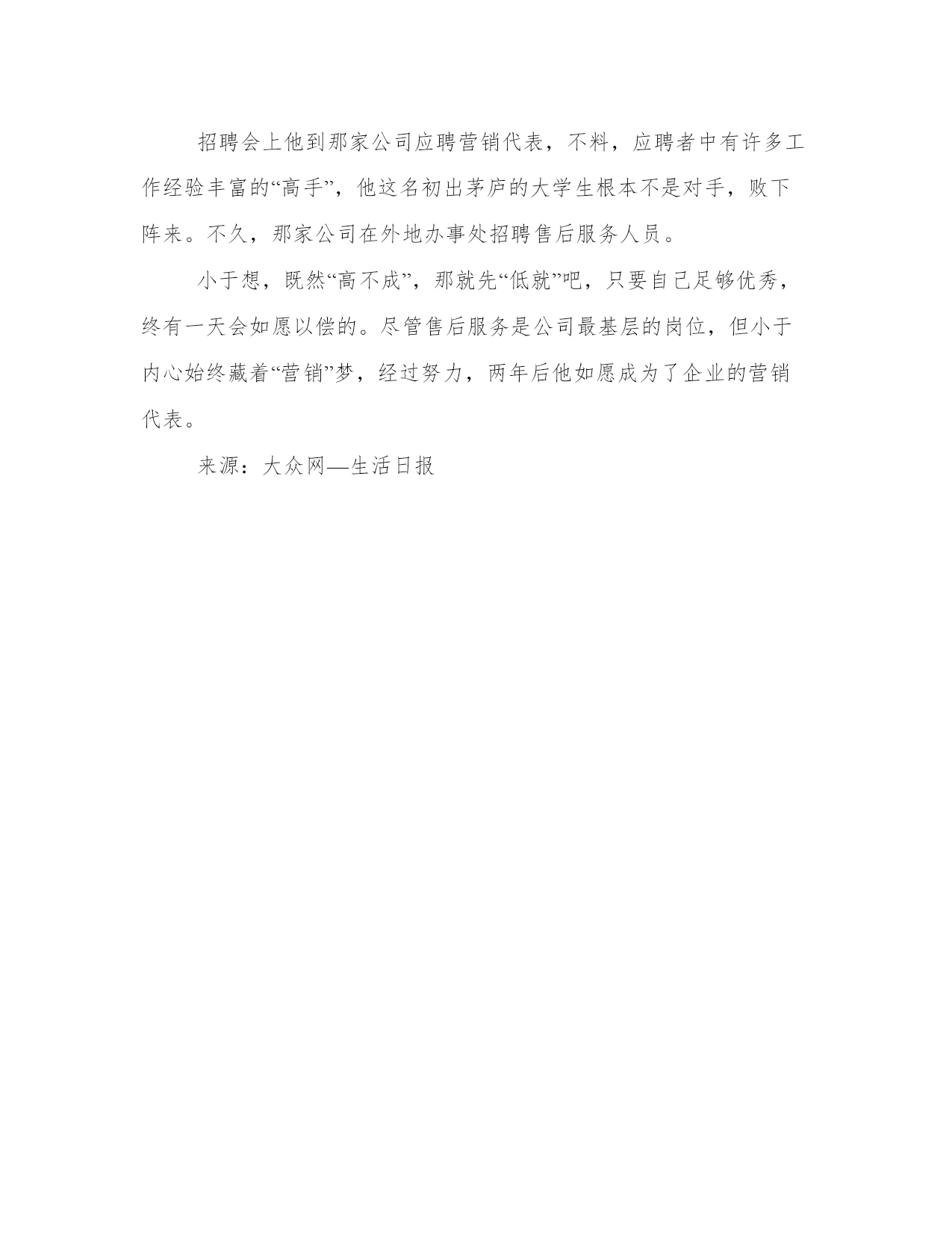 优秀曲线求职您试了吗?工作文档严峻的就业形势、残酷的职场竞争是目前众所周知的事实。对于这几年的职场新手来说,为了把自己“推销”出去,找到满意的“婆家”,许多人可谓绞尽脑汁,想了无数办法。其中“曲线求职”法不时现身职场。“兴趣曲线”:打通求职命脉一次大型校园招聘会上,某著名公司因为起薪待遇优厚,其展厅前挤满了应届毕业生。小韩是系篮球主力,他发现自己的条件符合其中的“行政助理”一职,便使劲把单薄的简历投了过去。第二天他就收到面试通知并被录用了。进了公司后他才知道,公司所在的行业系统每年都要举行一次篮球比赛,比赛成绩将作为各公司年终考核的一部分。在诸多求职者中,小韩尽管条件并不是特别突出,但身材高大、擅长篮球这一点却让他脱颖而出,成为公司青睐的“香饽饽”。这样的求职例子的确很新鲜,谁能想到兴趣爱好会成就一个人的求职梦呢?每个人都有不同的兴趣爱好,有时凸现出来,说不定会成为求职出奇制胜的法宝。“职位曲线”:疏通职业梦想学市场营销专业的小于去年毕业时就表示非某知名公司不去。招聘会上他到那家公司应聘营销代表,不料,应聘者中有许多工作经验丰富的“高手”,他这名初出茅庐的大学生根本不是对手,败下阵来。不久,那家公司在外地办事处招聘售后服务人员。小于想,既然“高不成”,那就先“低就”吧,只要自己足够优秀,终有一天会如愿以偿的。尽管售后服务是公司最基层的岗位,但小于内心始终藏着“营销”梦,经过努力,两年后他如愿成为了企业的营销代表。来源:大众网—生活日报