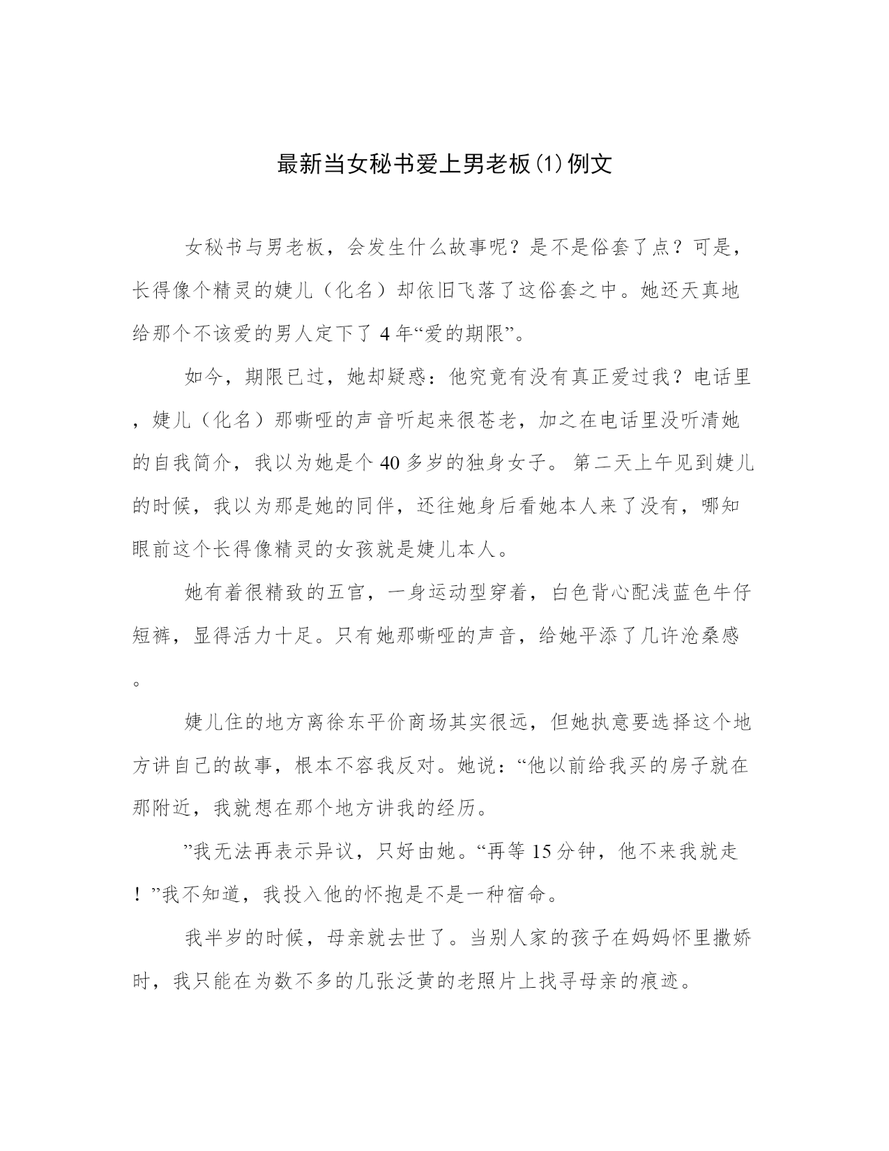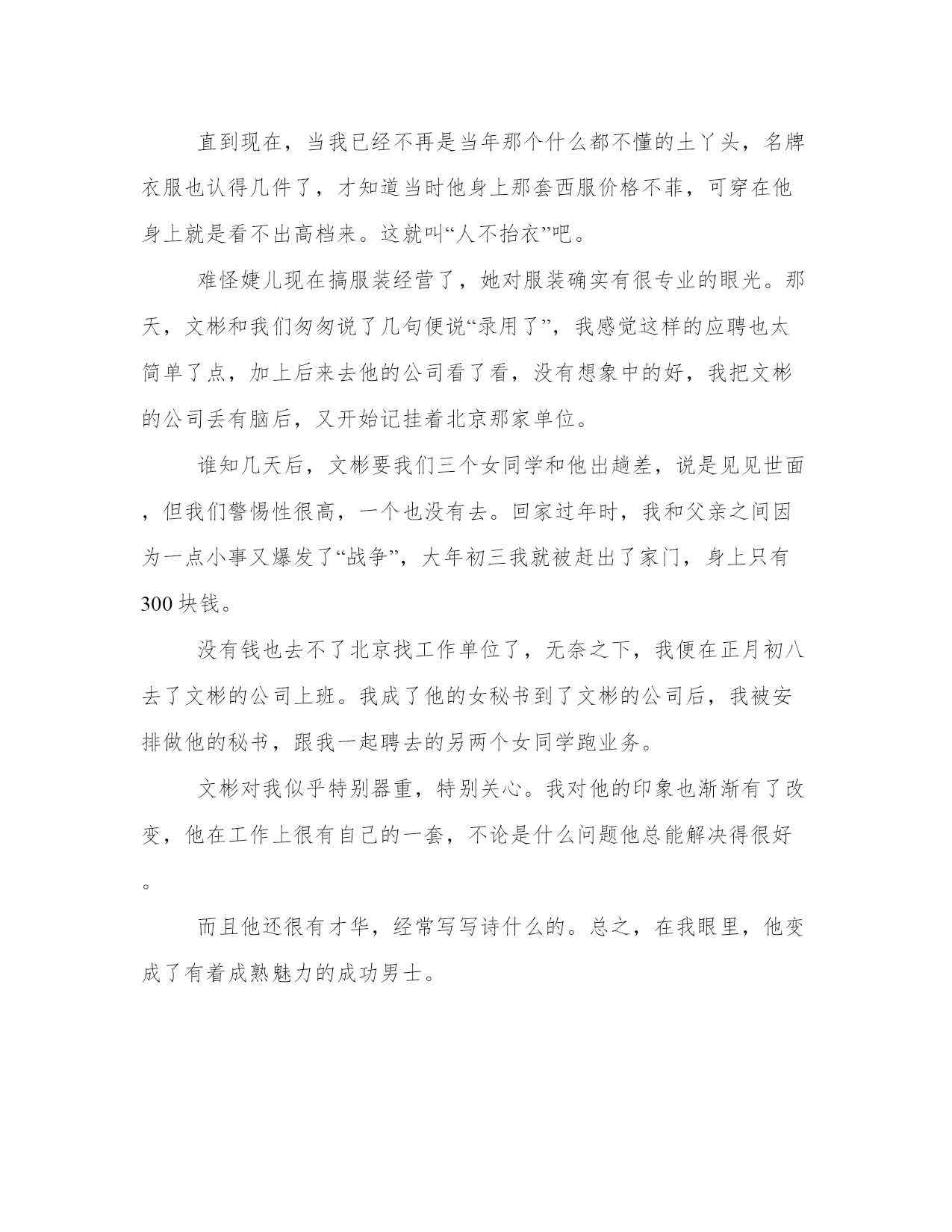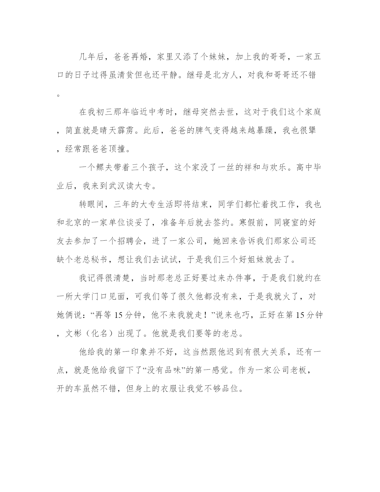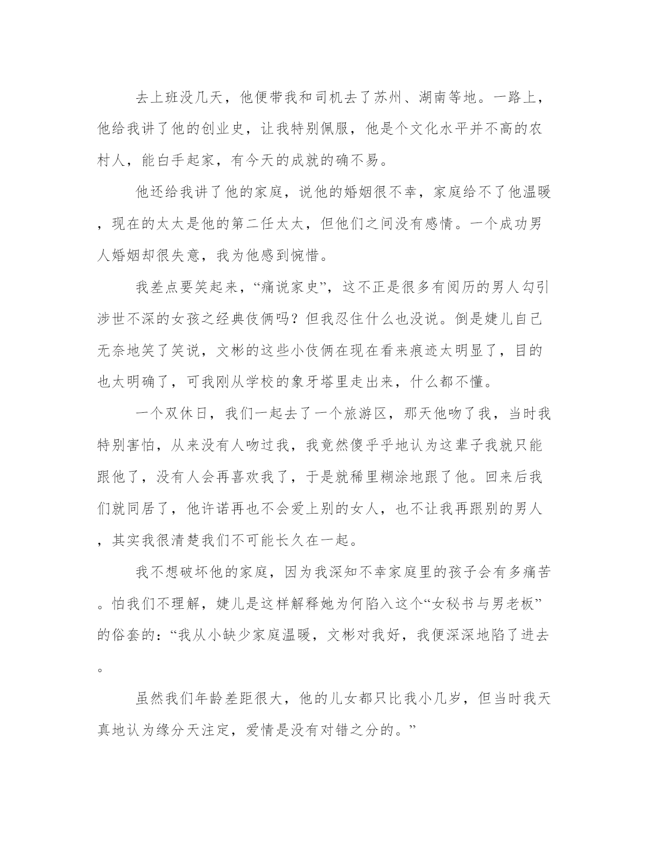最新当女秘书爱上男老板(1)例文女秘书与男老板,会发生什么故事呢?是不是俗套了点?可是,长得像个精灵的婕儿(化名)却依旧飞落了这俗套之中。她还天真地给那个不该爱的男人定下了4年“爱的期限”。如今,期限已过,她却疑惑:他究竟有没有真正爱过我?电话里,婕儿(化名)那嘶哑的声音听起来很苍老,加之在电话里没听清她的自我简介,我以为她是个40多岁的独身女子。第二天上午见到婕儿的时候,我以为那是她的同伴,还往她身后看她本人来了没有,哪知眼前这个长得像精灵的女孩就是婕儿本人。她有着很精致的五官,一身运动型穿着,白色背心配浅蓝色牛仔短裤,显得活力十足。只有她那嘶哑的声音,给她平添了几许沧桑感。婕儿住的地方离徐东平价商场其实很远,但她执意要选择这个地方讲自己的故事,根本不容我反对。她说:“他以前给我买的房子就在那附近,我就想在那个地方讲我的经历。”我无法再表示异议,只好由她。“再等15分钟,他不来我就走!”我不知道,我投入他的怀抱是不是一种宿命。我半岁的时候,母亲就去世了。当别人家的孩子在妈妈怀里撒娇时,我只能在为数不多的几张泛黄的老照片上找寻母亲的痕迹。几年后,爸爸再婚,家里又添了个妹妹,加上我的哥哥,一家五口的日子过得虽清贫但也还平静。继母是北方人,对我和哥哥还不错。在我初三那年临近中考时,继母突然去世,这对于我们这个家庭,简直就是晴天霹雳。此后,爸爸的脾气变得越来越暴躁,我也很犟,经常跟爸爸顶撞。一个鳏夫带着三个孩子,这个家没了一丝的祥和与欢乐。高中毕业后,我来到武汉读大专。转眼间,三年的大专生活即将结束,同学们都忙着找工作,我也和北京的一家单位谈妥了,准备年后就去签约。寒假前,同寝室的好友去参加了一个招聘会,进了一家公司,她回来告诉我们那家公司还缺个老总秘书,想让我们去试试,于是我们三个好姐妹就去了。我记得很清楚,当时那老总正好要过来办件事,于是我们就约在一所大学门口见面,可我们等了很久他都没有来,于是我就火了,对她俩说:“再等15分钟,他不来我就走!”说来也巧,正好在第15分钟,文彬(化名)出现了。他就是我们要等的老总。他给我的第一印象并不好,这当然跟他迟到有很大关系,还有一点,就是他给我留下了“没有品味”的第一感觉。作为一家公司老板,开的车虽然不错,但身上的衣服让我觉不够品位。直到现在,当我已经不再是当年那个什么都不懂的土丫头,名牌衣服也认得几件了,才知道当时他身上那套西服价格不菲,可穿在他身上就是看不出高档来。这就叫“人不抬衣”吧。难怪婕儿现在搞服装经营了,她对服装确实有很专业的眼光。那天,文彬和我们匆匆说了几句便说“录用了”,我感觉这样的应聘也太简单了点,加上后来去他的公司看了看,没有想象中的好,我把文彬的公司丢有脑后,又开始记挂着北京那家单位。谁知几天后,文彬要我们三个女同学和他出趟差,说是见见世面,但我们警惕性很高,一个也没有去。回家过年时,我和父亲之间因为一点小事又爆发了“战争”,大年初三我就被赶出了家门,身上只有300块钱。没有钱也去不了北京找工作单位了,无奈之下,我便在正月初八去了文彬的公司上班。我成了他的女秘书到了文彬的公司后,我被安排做他的秘书,跟我一起聘去的另两个女同学跑业务。文彬对我似乎特别器重,特别关心。我对他的印象也渐渐有了改变,他在工作上很有自己的一套,不论是什么问题他总能解决得很好。而且他还很有才华,经常写写诗什么的。总之,在我眼里,他变成了有着成熟魅力的成功男士。去上班没几天,他便带我和司机去了苏州、湖南等地。一路上,他给我讲了他的创业史,让我特别佩服,他是个文化水平并不高的农村人,能白手起家,有今天的成就的确不易。他还给我讲了他的家庭,说他的婚姻很不幸,家庭给不了他温暖,现在的太太是他的第二任太太,但他们之间没有感情。一个成功男人婚姻却很失意,我为他感到惋惜。我差点要笑起来,“痛说家史”,这不正是很多有阅历的男人勾引涉世不深的女孩之经典伎俩吗?但我忍住什么也没说。倒是婕儿自己无奈地笑了笑说,文彬的这些小伎俩在现在看来痕迹太明显了,目的也太明确了,可我刚从学校的象牙塔里走出来,什么都不懂。一个双休日,我们一起去了一个旅游区,那天他吻了我,当时我特别害怕,从来没有人吻过我,我竟然傻乎乎地认为这辈子我就只能跟他了,没有人会再喜欢我了,于是就稀里糊涂地跟了他。回来后我们就同居了,他许诺再也不会爱上别的女人,也不让我再跟别的男人,其实我很清楚我们不可能长久在一起。我不想破坏他的家庭,因为我深知不幸家庭里的孩子会有多痛苦。怕我们不理解,婕儿是这样解释她为何陷入这个“女秘书与男老板”的俗套的:“我从小缺少家庭温暖,文彬对我好,我便深深地陷了进去。虽然我们年龄差距很大,他的儿女都只比我小几岁,但当时我天真地认为缘分天注定,爱情是没有对错之分的。”