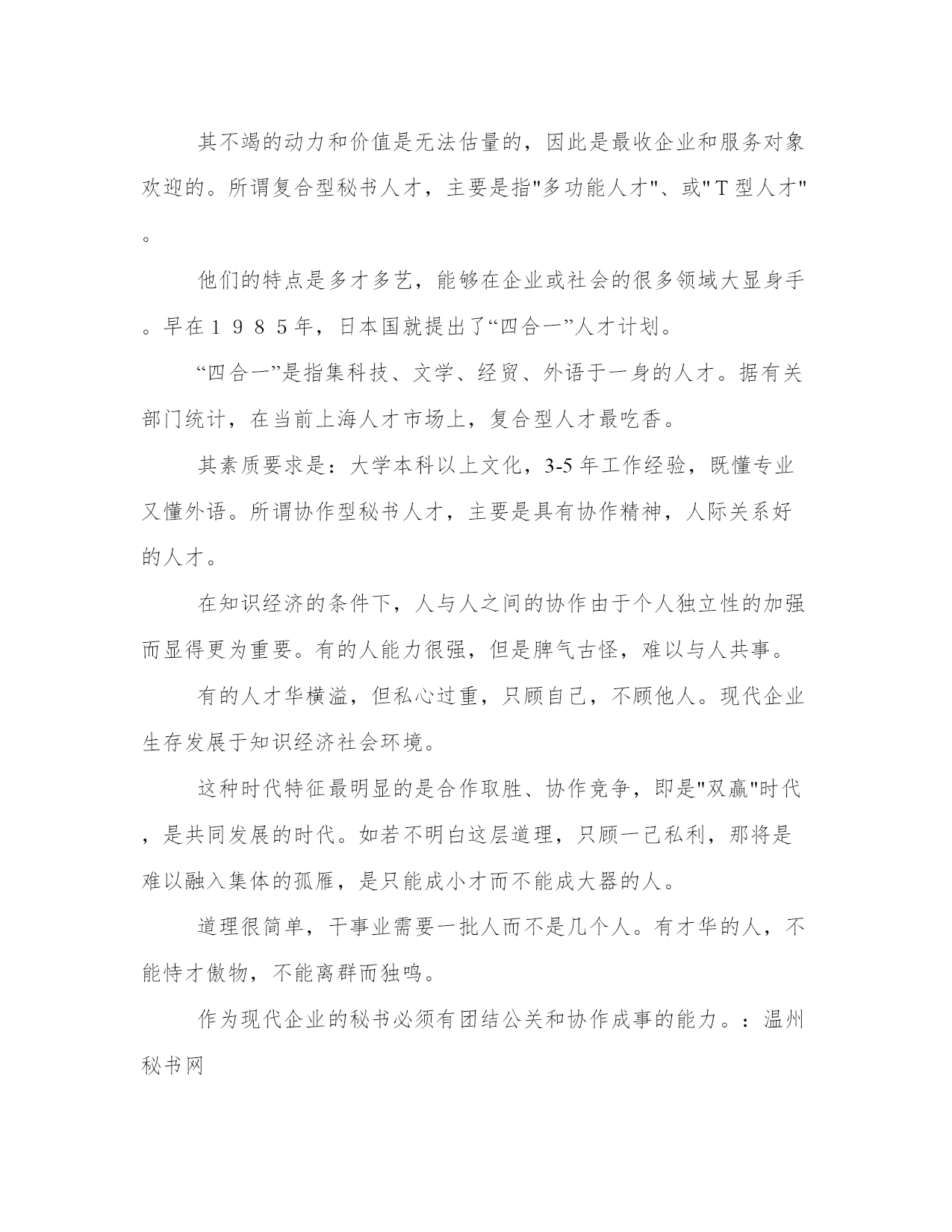 最新现代企业秘书素质的思考范文随着现代企业制度的逐步建立,对企业秘书素质的要求越来越高。这个观点的提出,主要来源于社会的变革。人类正从物质经济社会向知识经济社会发展。产业结构的变化,带来职业结构的变化,也必将冲击服务、辅政层次的秘书岗位,要求这一岗位必须具有更高素质的人员来充实加强。可以说,按现代企业制度运行的企业,需要秘书的面扩大了,素质要求也更高了。分析现代企业的秘书素质可以从现代企业的需要来思考。当前,现代企业迫切需要的秘书人才,应该是创造型、符合型与协作型的。所谓创造型秘书人才,主要是指创造力很高的人才。他们具有强烈的立体型思维和创新精神,在工作岗位上,必须常有新发明、新发现、新开拓,能够对不同层次、不同行业、不同领域的服务对象,不断提供新创意、新设想;能够在企业的管理、制度、技术、知识创新等系统有新作为。知识经济社会,人才竞争激烈,创造型人才不仅能够参与竞争,且能够积极协助所服务的对象超越竞争。所谓超越竞争,是能够发现更有战略价值的新领域、新课题、新技术、新产品,不断形成最具创意与活力的"人无我有"的优势。这种人是企业的灵魂,也是民族的灵魂。其不竭的动力和价值是无法估量的,因此是最收企业和服务对象欢迎的。所谓复合型秘书人才,主要是指"多功能人才"、或"T型人才"。他们的特点是多才多艺,能够在企业或社会的很多领域大显身手。早在1985年,日本国就提出了“四合一”人才计划。“四合一”是指集科技、文学、经贸、外语于一身的人才。据有关部门统计,在当前上海人才市场上,复合型人才最吃香。其素质要求是:大学本科以上文化,3-5年工作经验,既懂专业又懂外语。所谓协作型秘书人才,主要是具有协作精神,人际关系好的人才。在知识经济的条件下,人与人之间的协作由于个人独立性的加强而显得更为重要。有的人能力很强,但是脾气古怪,难以与人共事。有的人才华横溢,但私心过重,只顾自己,不顾他人。现代企业生存发展于知识经济社会环境。这种时代特征最明显的是合作取胜、协作竞争,即是"双赢"时代,是共同发展的时代。如若不明白这层道理,只顾一己私利,那将是难以融入集体的孤雁,是只能成小才而不能成大器的人。道理很简单,干事业需要一批人而不是几个人。有才华的人,不能恃才傲物,不能离群而独鸣。作为现代企业的秘书必须有团结公关和协作成事的能力。:温州秘书网
