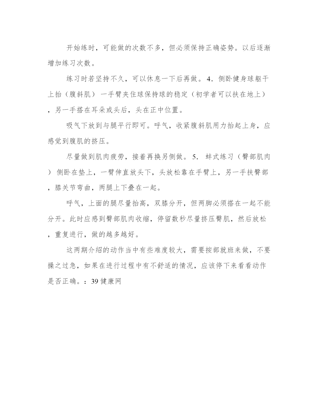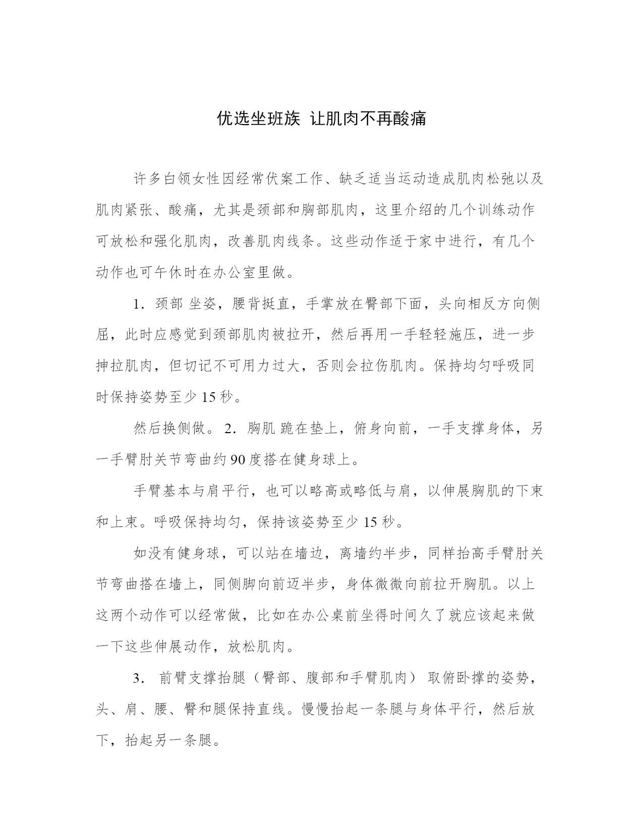 优选坐班族让肌肉不再酸痛许多白领女性因经常伏案工作、缺乏适当运动造成肌肉松弛以及肌肉紧张、酸痛,尤其是颈部和胸部肌肉,这里介绍的几个训练动作可放松和强化肌肉,改善肌肉线条。这些动作适于家中进行,有几个动作也可午休时在办公室里做。1.颈部坐姿,腰背挺直,手掌放在臀部下面,头向相反方向侧屈,此时应感觉到颈部肌肉被拉开,然后再用一手轻轻施压,进一步抻拉肌肉,但切记不可用力过大,否则会拉伤肌肉。保持均匀呼吸同时保持姿势至少15秒。然后换侧做。2.胸肌跪在垫上,俯身向前,一手支撑身体,另一手臂肘关节弯曲约90度搭在健身球上。手臂基本与肩平行,也可以略高或略低与肩,以伸展胸肌的下束和上束。呼吸保持均匀,保持该姿势至少15秒。如没有健身球,可以站在墙边,离墙约半步,同样抬高手臂肘关节弯曲搭在墙上,同侧脚向前迈半步,身体微微向前拉开胸肌。以上这两个动作可以经常做,比如在办公桌前坐得时间久了就应该起来做一下这些伸展动作,放松肌肉。3.前臂支撑抬腿(臀部、腹部和手臂肌肉)取俯卧撑的姿势,头、肩、腰、臀和腿保持直线。慢慢抬起一条腿与身体平行,然后放下,抬起另一条腿。开始练时,可能做的次数不多,但必须保持正确姿势。以后逐渐增加练习次数。练习时若坚持不久,可以休息一下后再做。4.侧卧健身球躯干上抬(腹斜肌)一手臂夹住球保持球的稳定(初学者可以扶在地上),另一手搭在耳朵或头后,头在正中位置。吸气下放到与腿平行即可。呼气,收紧腹斜肌用力抬起上身,应感觉到腹肌的挤压。尽量做到肌肉疲劳,接着再换另侧做。5.蚌式练习(臀部肌肉)侧卧在垫上,一臂伸直放头下,头放松靠在手臂上,另一手扶臀部,膝关节弯曲,两腿上下叠在一起。呼气,上面的腿尽量抬高,双膝分开,但两脚必须搭在一起不能分开。此时应感到臀部肌肉收缩,停留数秒尽量挤压臀肌,然后放松,重复进行,做的越多越好。这两期介绍的动作当中有些难度较大,需要按部就班来做,不要操之过急,如果在进行过程中有不舒适的情况,应该停下来看看动作是否正确。:39健康网