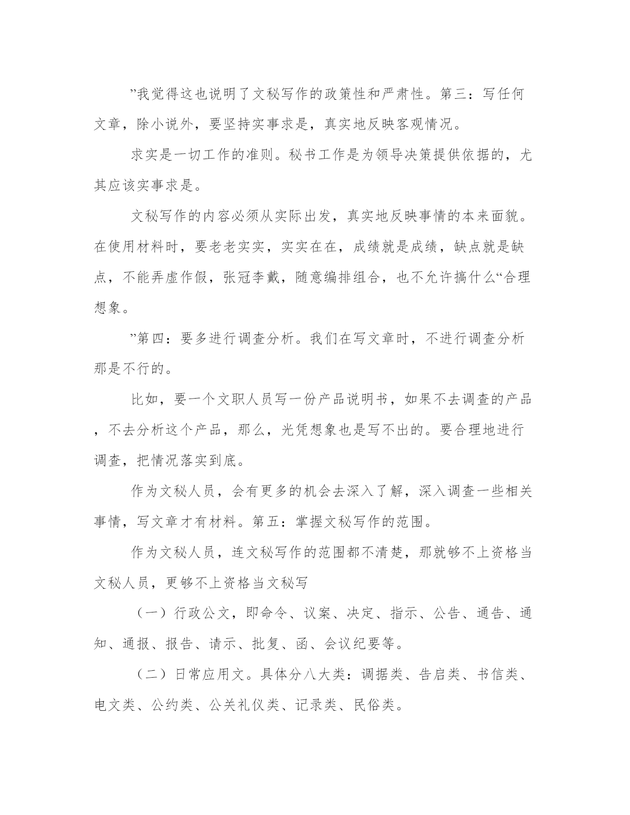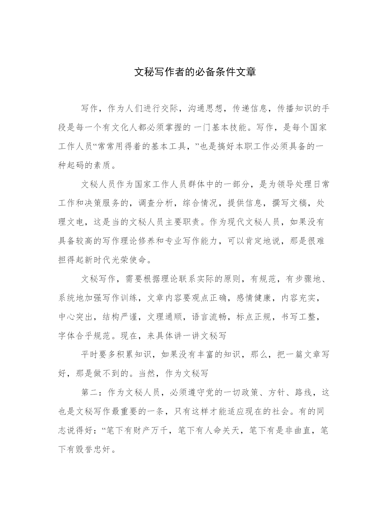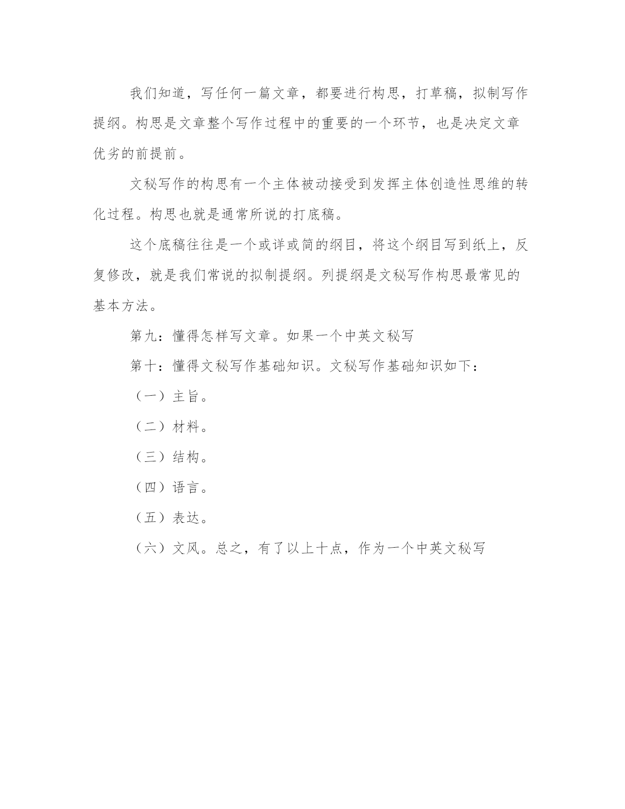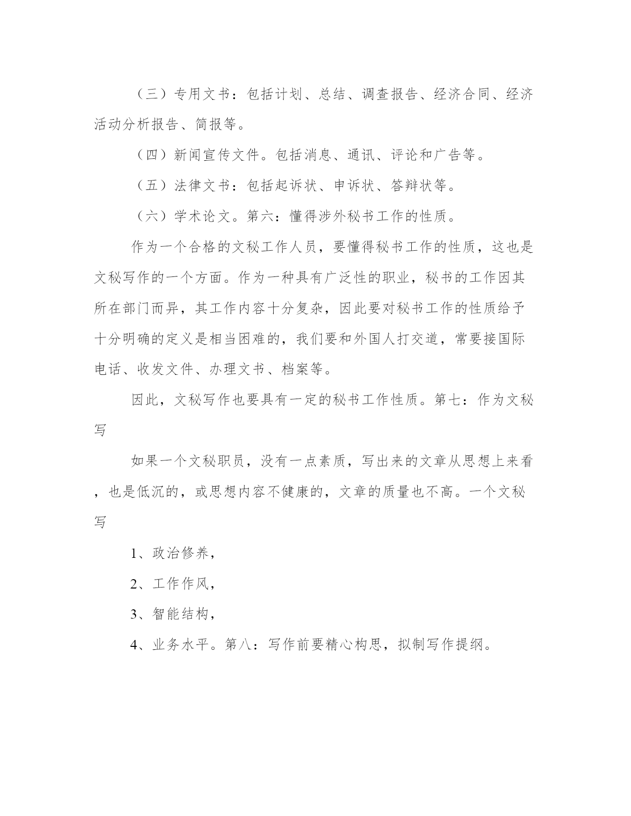 文秘写作者的必备条件文章写作,作为人们进行交际,沟通思想,传递信息,传播知识的手段是每一个有文化人都必须掌握的一门基本技能。写作,是每个国家工作人员“常常用得着的基本工具,”也是搞好本职工作必须具备的一种起码的素质。文秘人员作为国家工作人员群体中的一部分,是为领导处理日常工作和决策服务的,调查分析,综合情况,提供信息,撰写文稿,处理文电,这是当的文秘人员主要职责。作为现代文秘人员,如果没有具备较高的写作理论修养和专业写作能力,可以肯定地说,那是很难担得起新时代光荣使命。文秘写作,需要根据理论联系实际的原则,有规范,有步骤地、系统地加强写作训练,文章内容要观点正确,感情健康,内容充实,中心突出,结构严谨,文理通顺,语言流畅,标点正规,书写工整,字体合乎规范。现在,来具体讲一讲文秘写平时要多积累知识,如果没有丰富的知识,那么,把一篇文章写好,那是做不到的。当然,作为文秘写第二:作为文秘人员,必须遵守党的一切政策、方针、路线,这也是文秘写作最重要的一条,只有这样才能适应现在的社会。有的同志说得好:“笔下有财产万千,笔下有人命关天,笔下有是非曲直,笔下有毁誉忠奸。”我觉得这也说明了文秘写作的政策性和严肃性。第三:写任何文章,除小说外,要坚持实事求是,真实地反映客观情况。求实是一切工作的准则。秘书工作是为领导决策提供依据的,尤其应该实事求是。文秘写作的内容必须从实际出发,真实地反映事情的本来面貌。在使用材料时,要老老实实,实实在在,成绩就是成绩,缺点就是缺点,不能弄虚作假,张冠李戴,随意编排组合,也不允许搞什么“合理想象。”第四:要多进行调查分析。我们在写文章时,不进行调查分析那是不行的。比如,要一个文职人员写一份产品说明书,如果不去调查的产品,不去分析这个产品,那么,光凭想象也是写不出的。要合理地进行调查,把情况落实到底。作为文秘人员,会有更多的机会去深入了解,深入调查一些相关事情,写文章才有材料。第五:掌握文秘写作的范围。作为文秘人员,连文秘写作的范围都不清楚,那就够不上资格当文秘人员,更够不上资格当文秘写(一)行政公文,即命令、议案、决定、指示、公告、通告、通知、通报、报告、请示、批复、函、会议纪要等。(二)日常应用文。具体分八大类:调据类、告启类、书信类、电文类、公约类、公关礼仪类、记录类、民俗类。(三)专用文书:包括计划、总结、调查报告、经济合同、经济活动分析报告、简报等。(四)新闻宣传文件。包括消息、通讯、评论和广告等。(五)法律文书:包括起诉状、申诉状、答辩状等。(六)学术论文。第六:懂得涉外秘书工作的性质。作为一个合格的文秘工作人员,要懂得秘书工作的性质,这也是文秘写作的一个方面。作为一种具有广泛性的职业,秘书的工作因其所在部门而异,其工作内容十分复杂,因此要对秘书工作的性质给予十分明确的定义是相当困难的,我们要和外国人打交道,常要接国际电话、收发文件、办理文书、档案等。因此,文秘写作也要具有一定的秘书工作性质。第七:作为文秘写如果一个文秘职员,没有一点素质,写出来的文章从思想上来看,也是低沉的,或思想内容不健康的,文章的质量也不高。一个文秘写1、政治修养,2、工作作风,3、智能结构,4、业务水平。第八:写作前要精心构思,拟制写作提纲。我们知道,写任何一篇文章,都要进行构思,打草稿,拟制写作提纲。构思是文章整个写作过程中的重要的一个环节,也是决定文章优劣的前提前。文秘写作的构思有一个主体被动接受到发挥主体创造性思维的转化过程。构思也就是通常所说的打底稿。这个底稿往往是一个或详或简的纲目,将这个纲目写到纸上,反复修改,就是我们常说的拟制提纲。列提纲是文秘写作构思最常见的基本方法。第九:懂得怎样写文章。如果一个中英文秘写第十:懂得文秘写作基础知识。文秘写作基础知识如下:(一)主旨。(二)材料。(三)结构。(四)语言。(五)表达。(六)文风。总之,有了以上十点,作为一个中英文秘写
